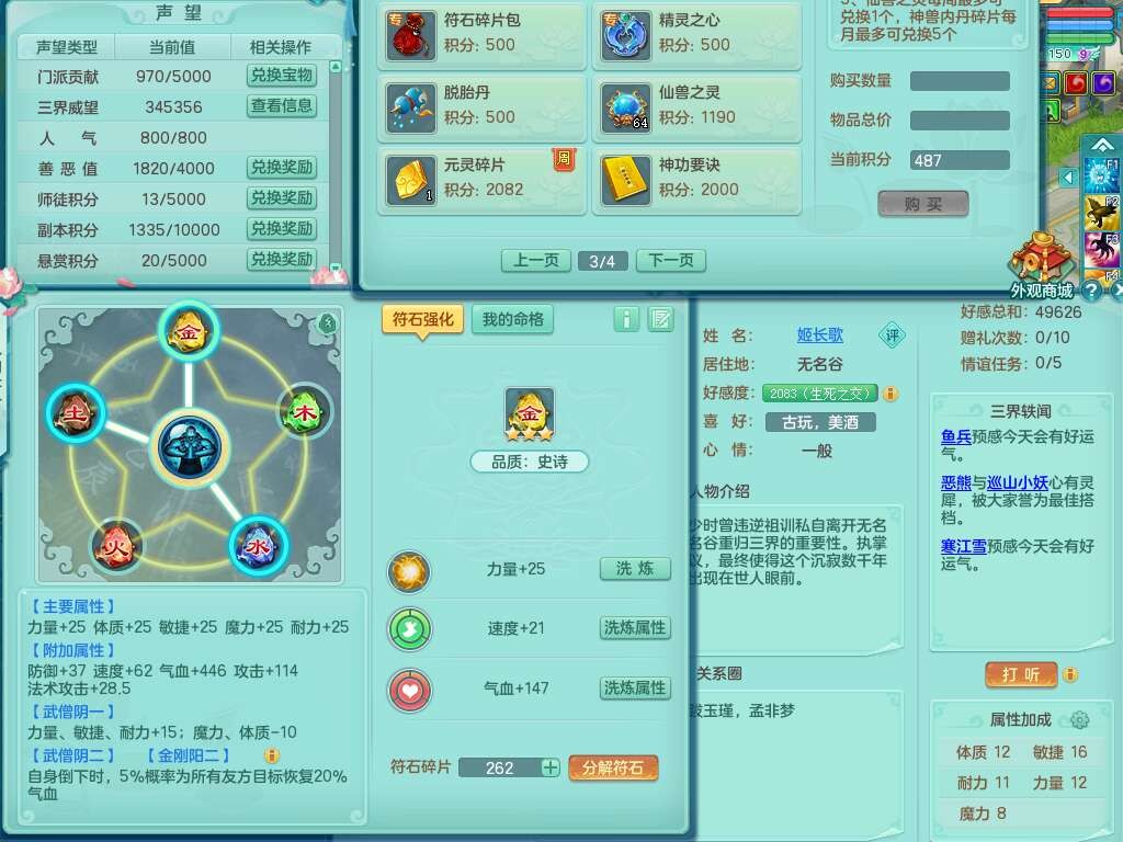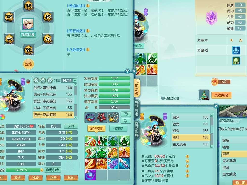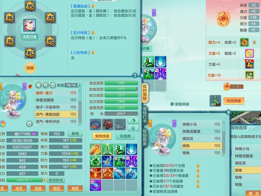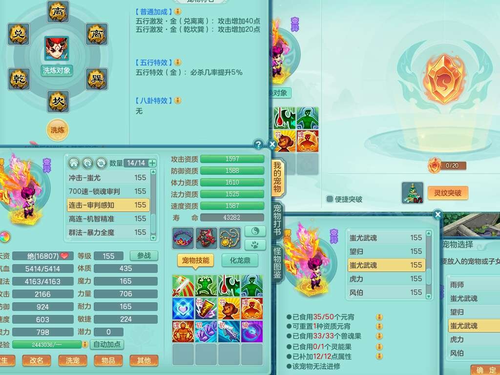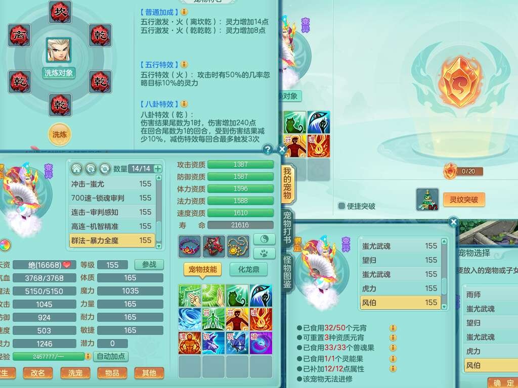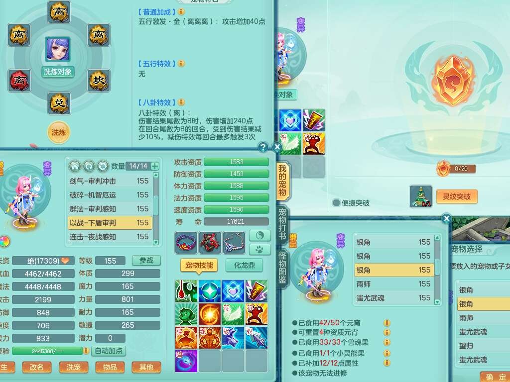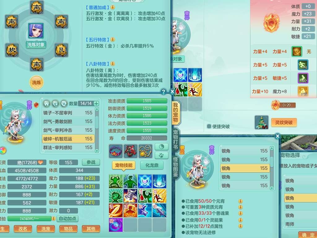 S22092扬名立万159男万兽,精灵歌,1内胆神,4觉醒,1宠皮,4特殊(剑胆,锤子,以战,虎虎),1只六技能镜花灵,易成长单加53头,904三红必杀易成长野兽武器,神佑单加50项链,易成长单加55腰带,有易成长单加55衣服,4.5基础鼎,13个永久格子,9只满果子,2只双人坐骑,22个仙兽蛋。