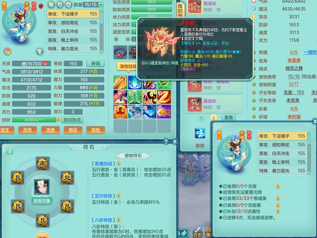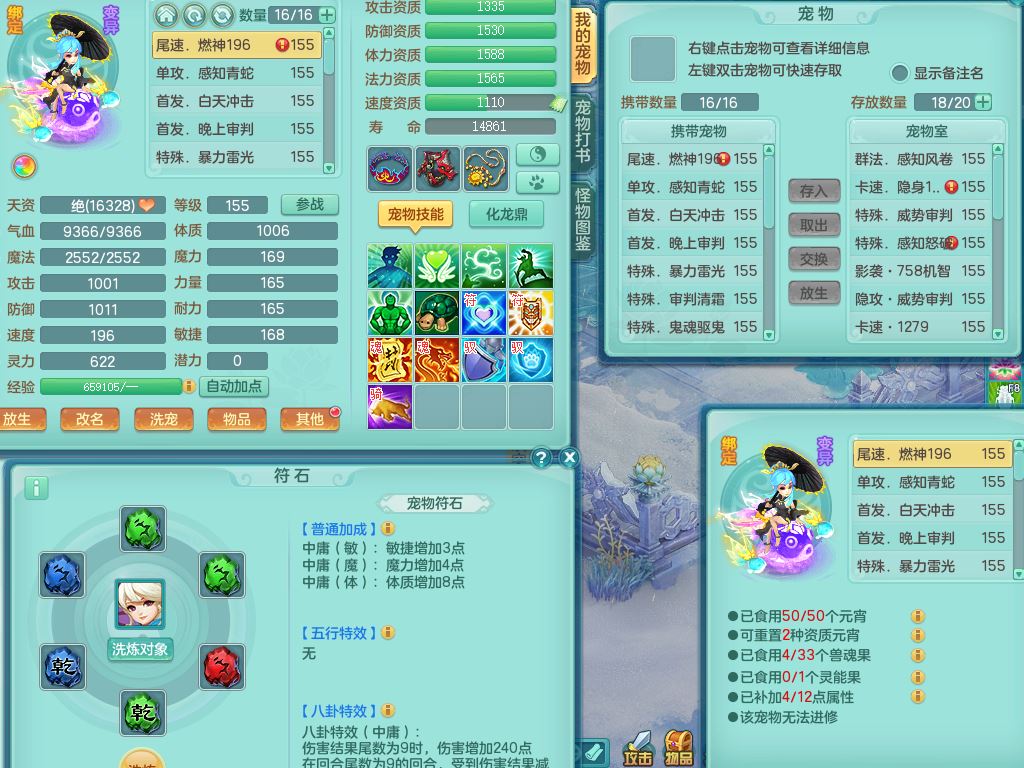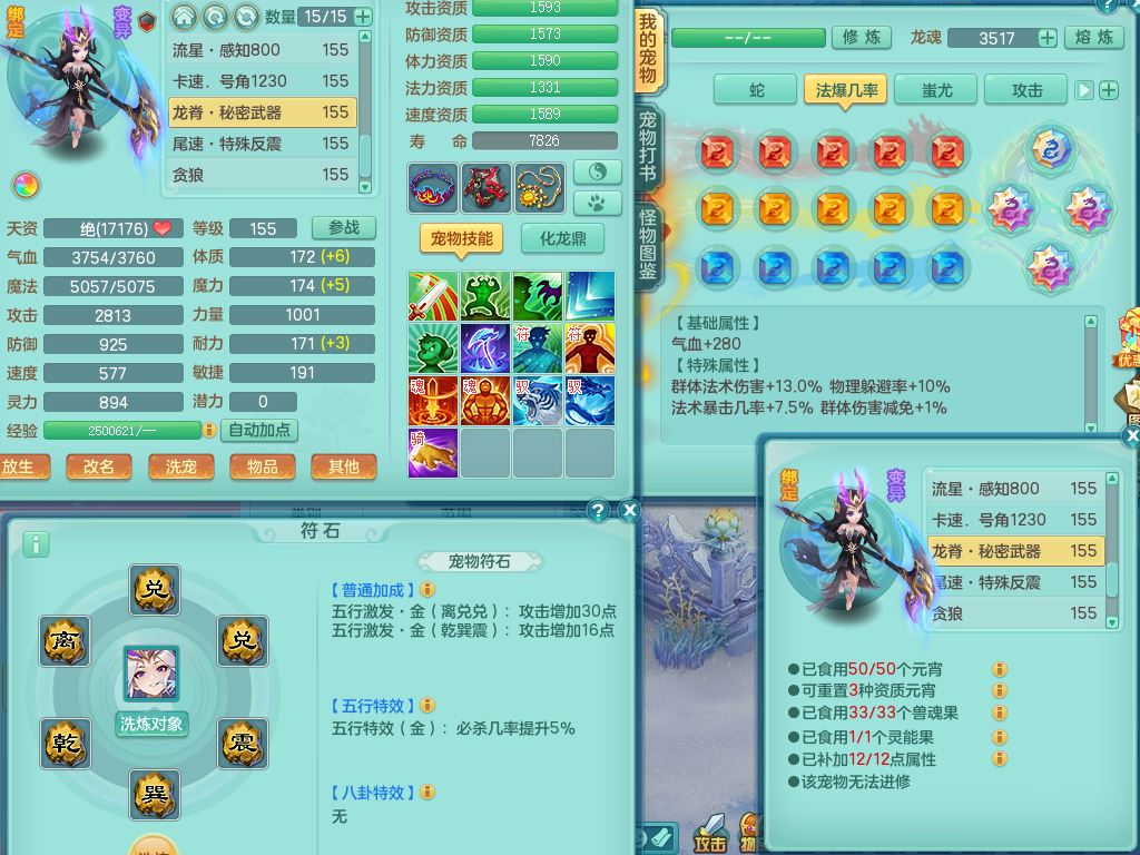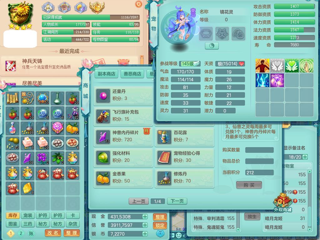 jt10362九天揽月159女天魔【潜龙在渊+暴龙泰坦+西瓜冰】精灵舞,1内龙2内(2青蛇)1望归4镜花3龙姬10特殊(荒古*2、雷光、青霜、流星、号角、风卷、勇猛、怒破、影袭)6宠皮,10觉醒11六字2五字4四字综合21只满果子,8红装备,Y卸甲武器,愤怒Y腰带,Y罗汉鞋子,鼎5.5+70+280,3套符石,51天月卡,冰晶庭院165,房屋152,31个内丹碎片,2个混沌果,1双人飞行坐骑