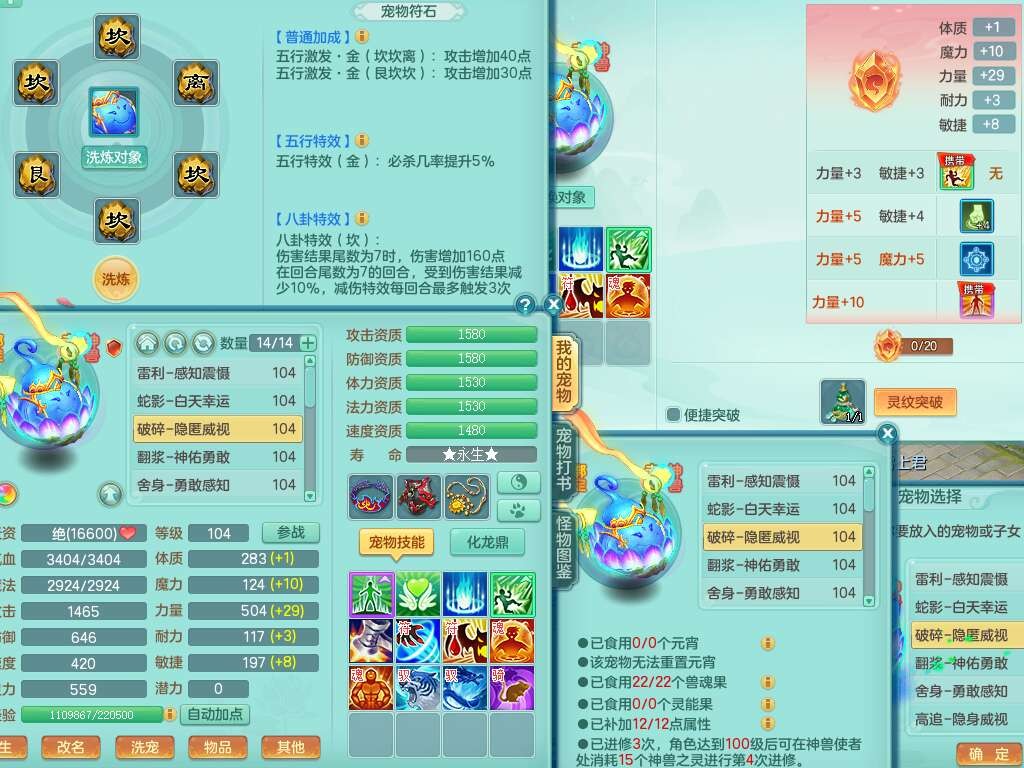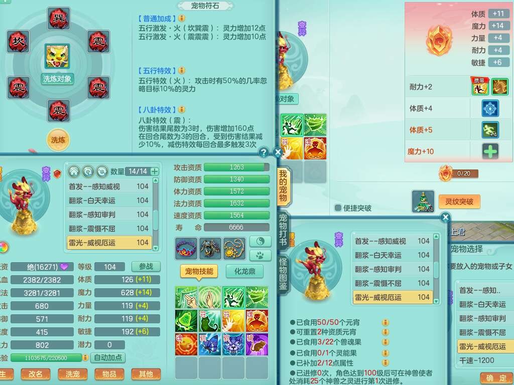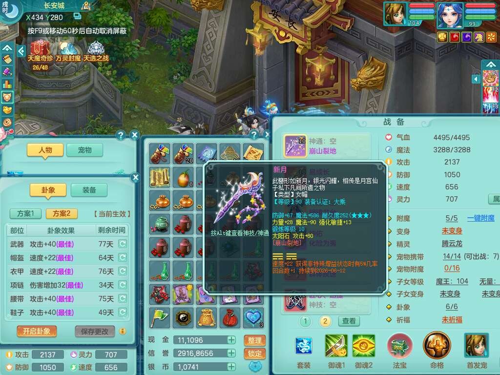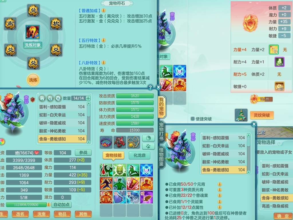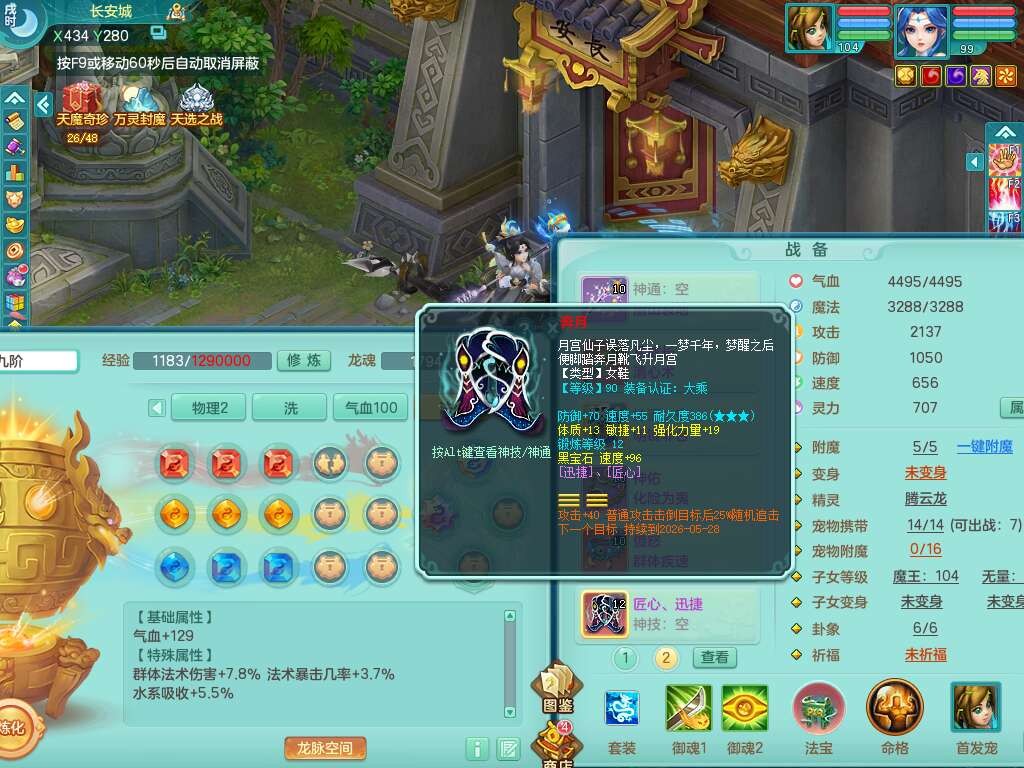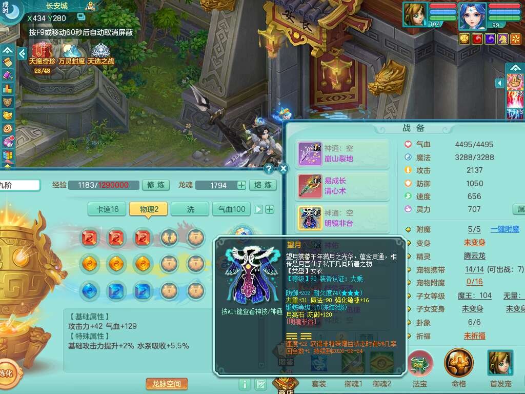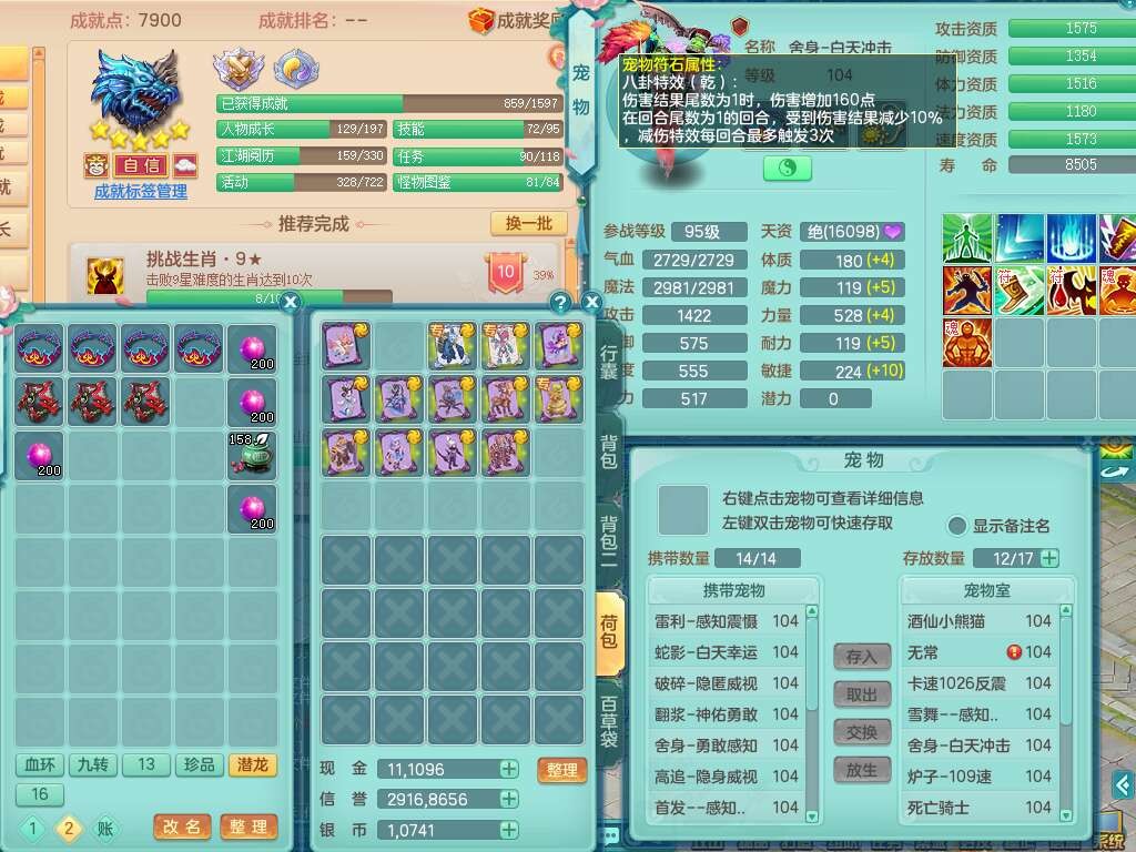 C22080三生万物99女力天宫,1龙2内胆神,8只觉醒,1宠皮,崩山单加头,556易成长清心术武器,神佑化险为夷链子,愤怒群体疾速腰带,迅捷匠心鞋子,2.0基础鼎,4个纯六字,2个5字,仓库50神兽内丹碎片,31仙兽蛋,15只满果子,宠排在榜,双人老虎,暴龙逍客,冰晶庭院,月卡还有129天。