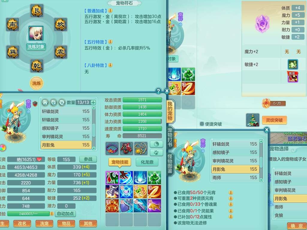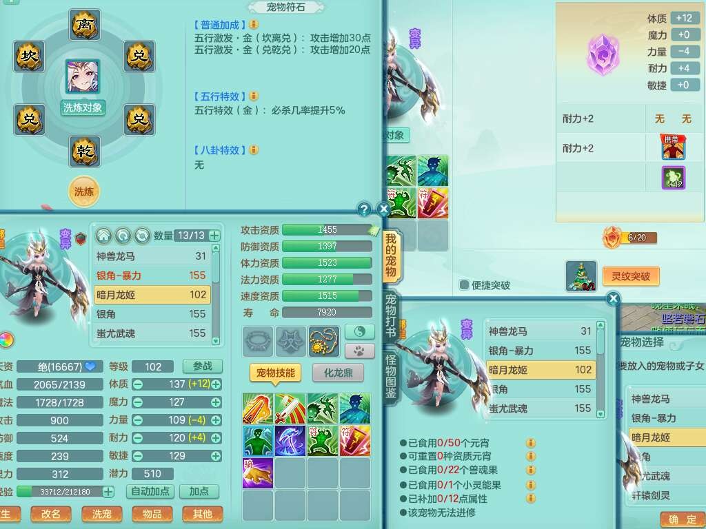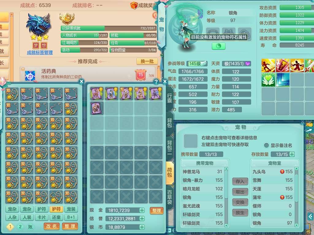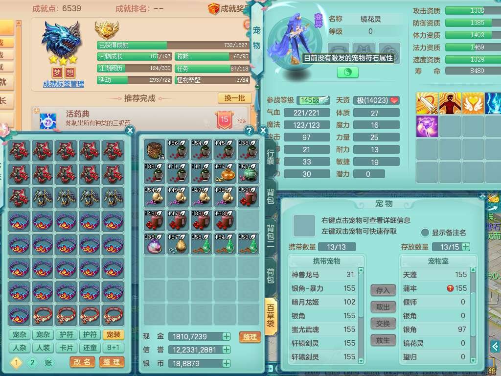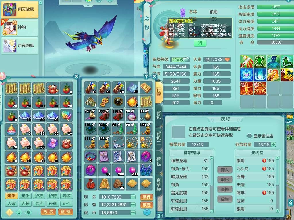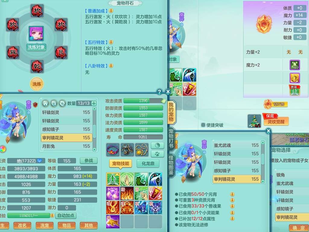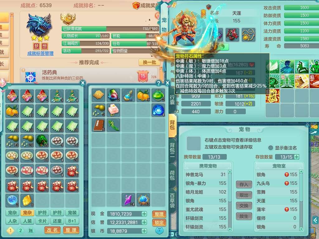 A22079花好月圆159女力天宫,精灵歌,1内胆神,【7只觉醒,已潜龙】,2只六技能镜花灵,1只6技能龙姬,3特殊(灵傀,登云,舍身),926必杀笑里单加52武器,崩山单加53鞋子,5.5基础鼎+70攻,280血,7个纯六字,10只满果子,仓库还有140个果子,112个凉糕,背,纯白月夜幽狐,神驹马到成功,带5597金币,月卡还有139天。