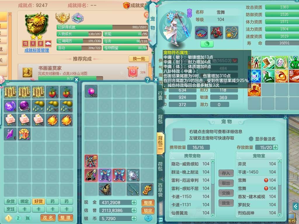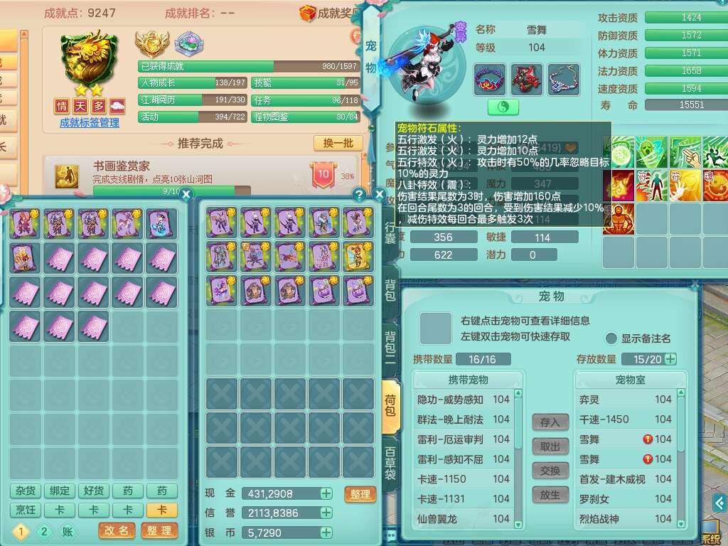 p22069生日快乐99男龙宫,9龙(1龙无内),3内胆神,【12只觉醒,已潜龙】,3宠皮,8位靓号不含4,531法爆单加33武器,法缭衣服,163易成长单加链子,愤怒单加33腰带,五雷单加32鞋子,神佑单加链子,迅捷单加31鞋子,553必杀武器,541狂暴单加武器,仓库很多装备,基础鼎3.0,14个格子,9个纯6字,23只满果子,宠排在榜,3只坐骑+西瓜冰武器,永久称谓,月卡60天。