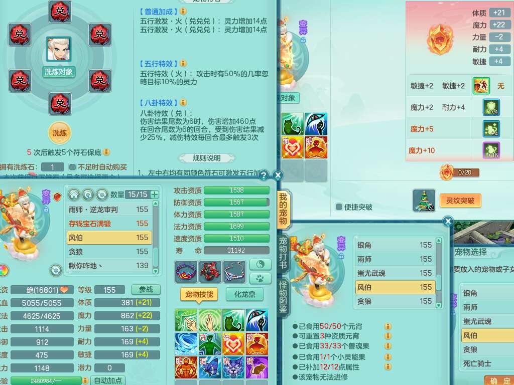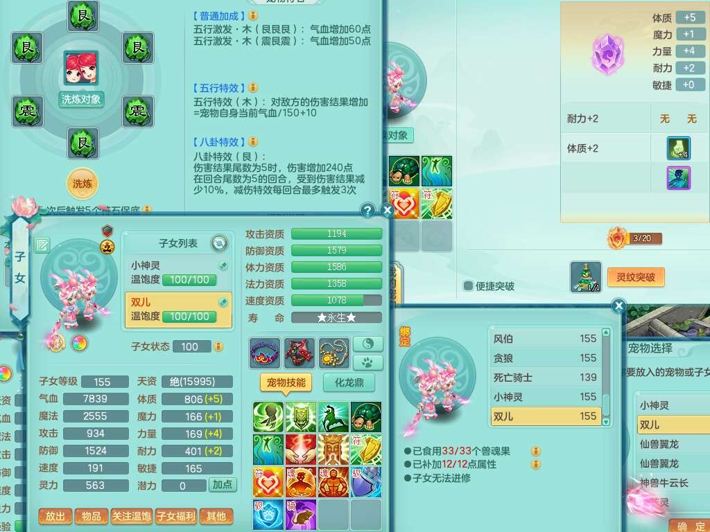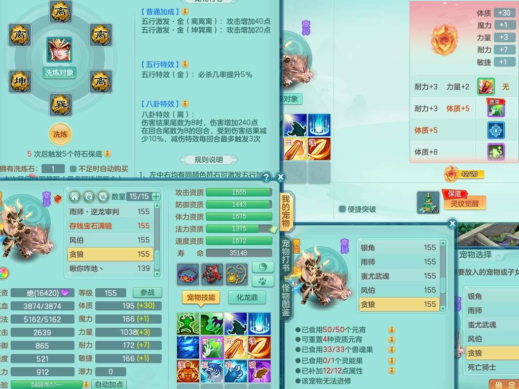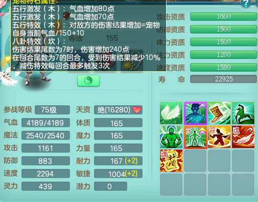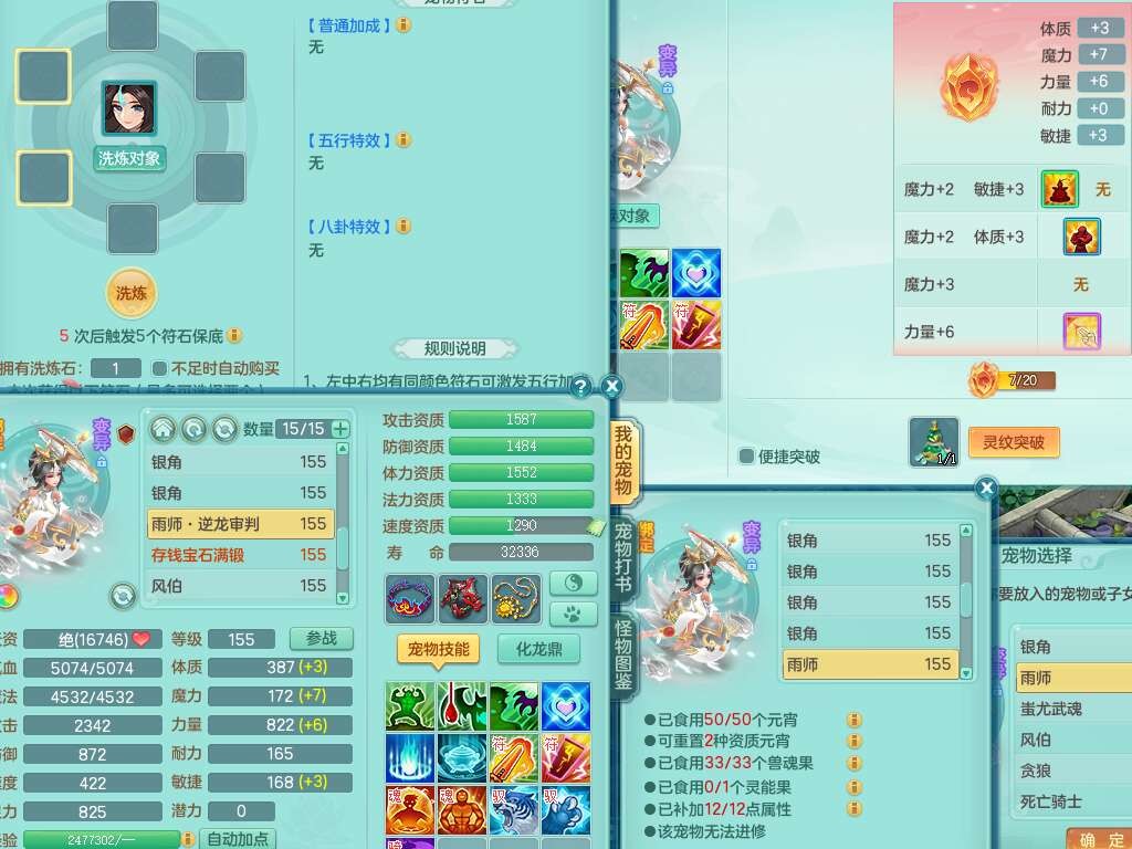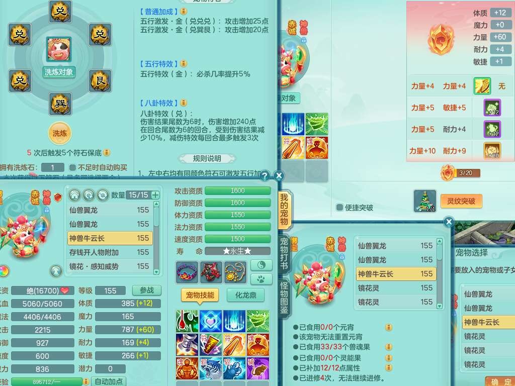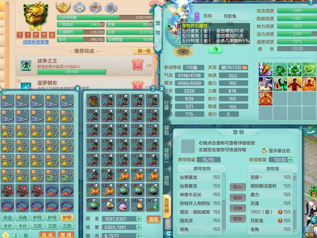 S22060少年游159男五庄,精灵舞,2龙(1龙没内),1内胆神,【12觉醒,已潜龙】,8宠皮,5特殊(坠天,勇猛,双星闪,月光,逆龙),3只六技能镜花灵,愤怒单加55腰带,五特,有932易成长单加54武器, 易成长单加57头,5.5基础鼎+70攻+280血,13个永久格字,7个纯六字,16个满果子,仓库还有30个果子,宠排在榜,修炼在榜,2只坐骑,30个神兽内丹碎片,178天月卡。
