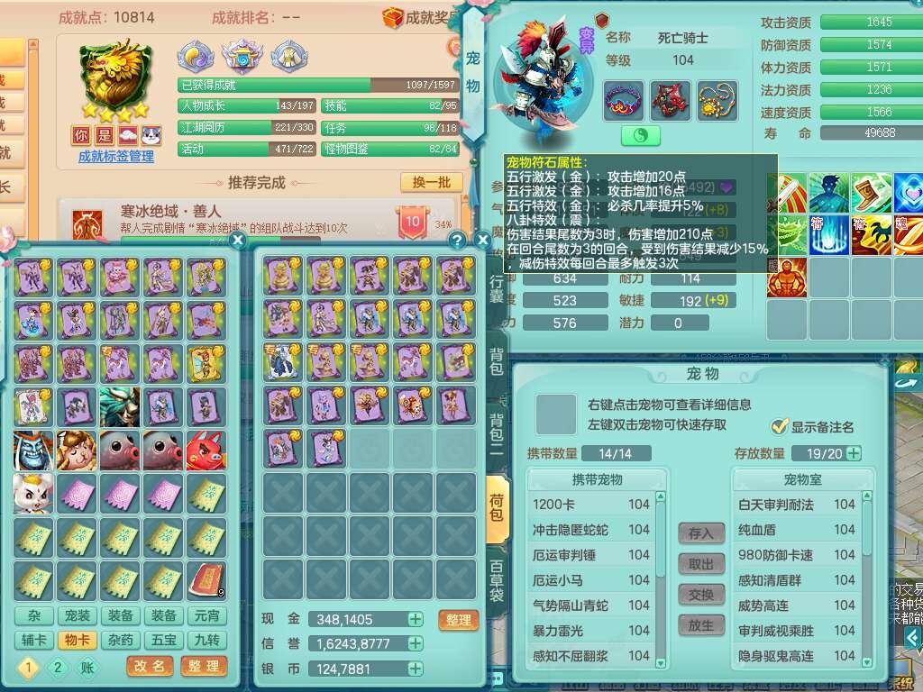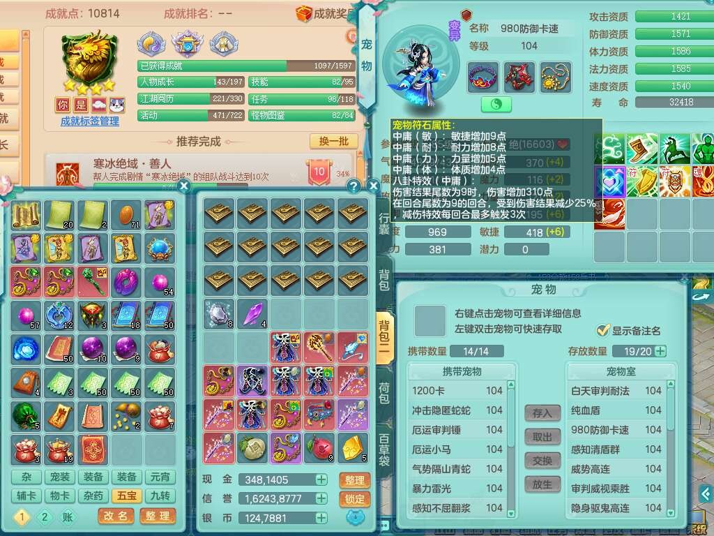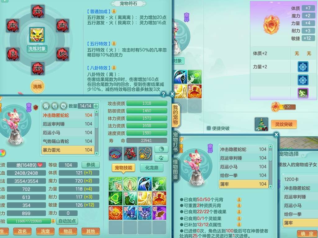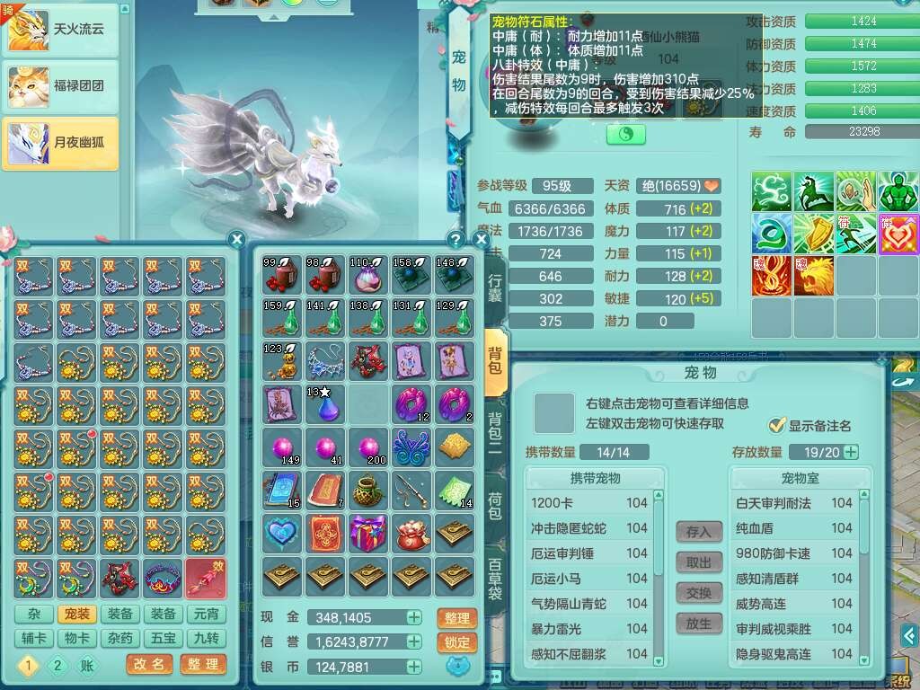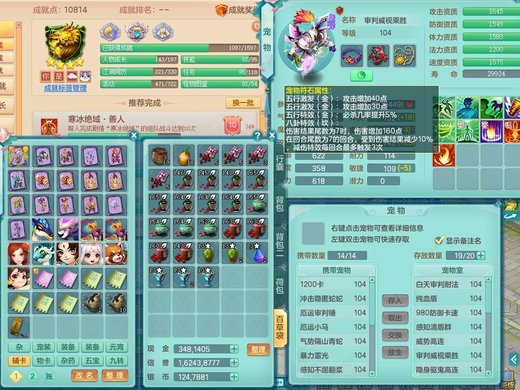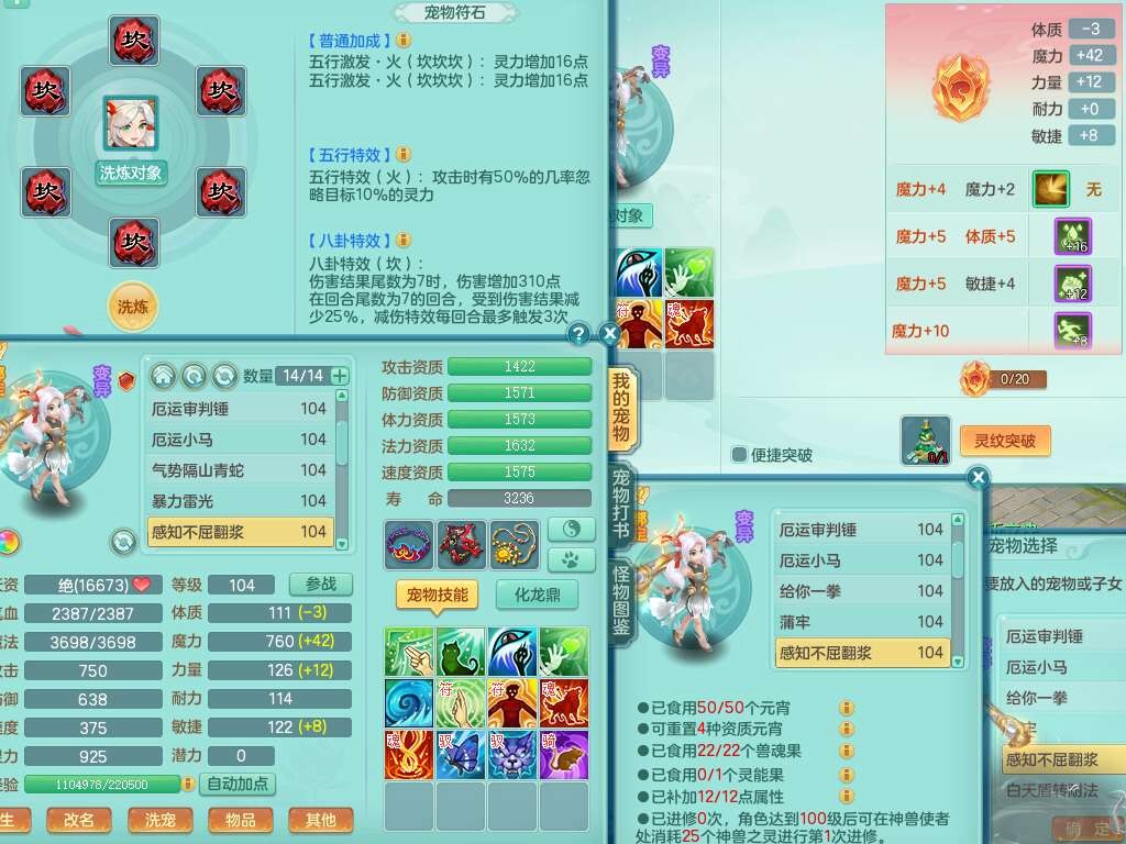 A22056清风明月99女灵月山,1龙4内胆神,1破镜,【物理已潜龙,辅助差4个气血可潜龙】,3宠皮,愤怒四海单加32腰带,6特,易成长笑里单加鞋子,有物理装备,551易成长单加武器,崩山单加30衣服,神佑易成长链子,易成长破血单加鞋子,3.0基础鼎,7个纯六字,2个5字,25只满果子,仓库61神兽内丹碎片,宠排在榜,3只染色坐骑,带4107金币,月卡还有30天。