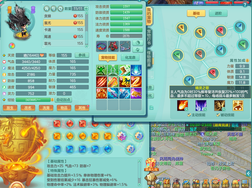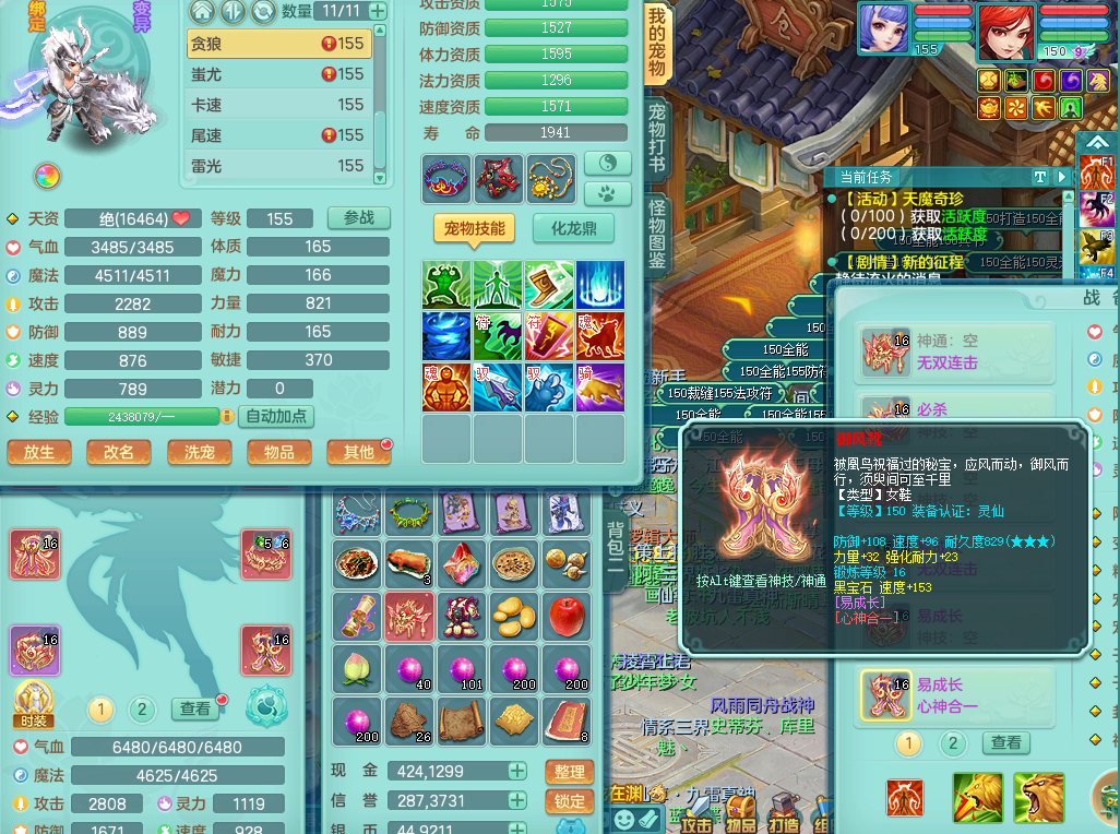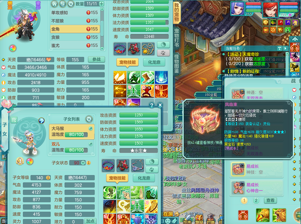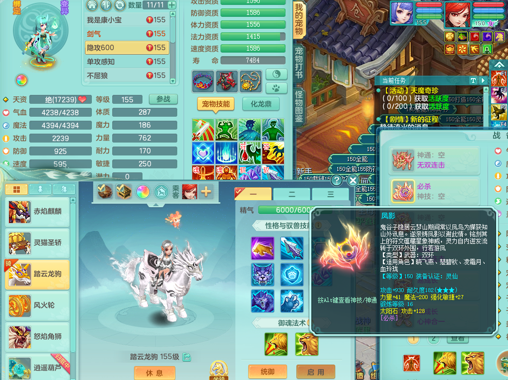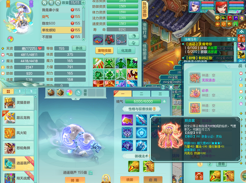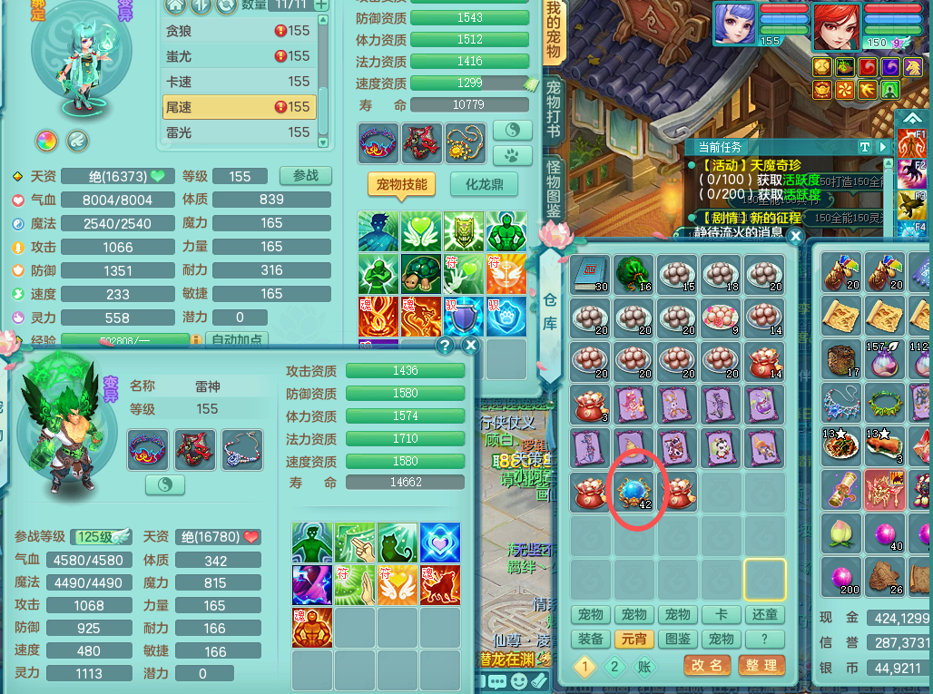 63138,今年勇159女万兽,日常号,装备宝宝够用,4只坐骑,3陆地双人,1飞行双人,930必杀武器,单加55破血头,永久头饰脸饰背饰,天上人间,仓库42个仙兽蛋