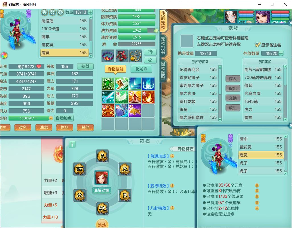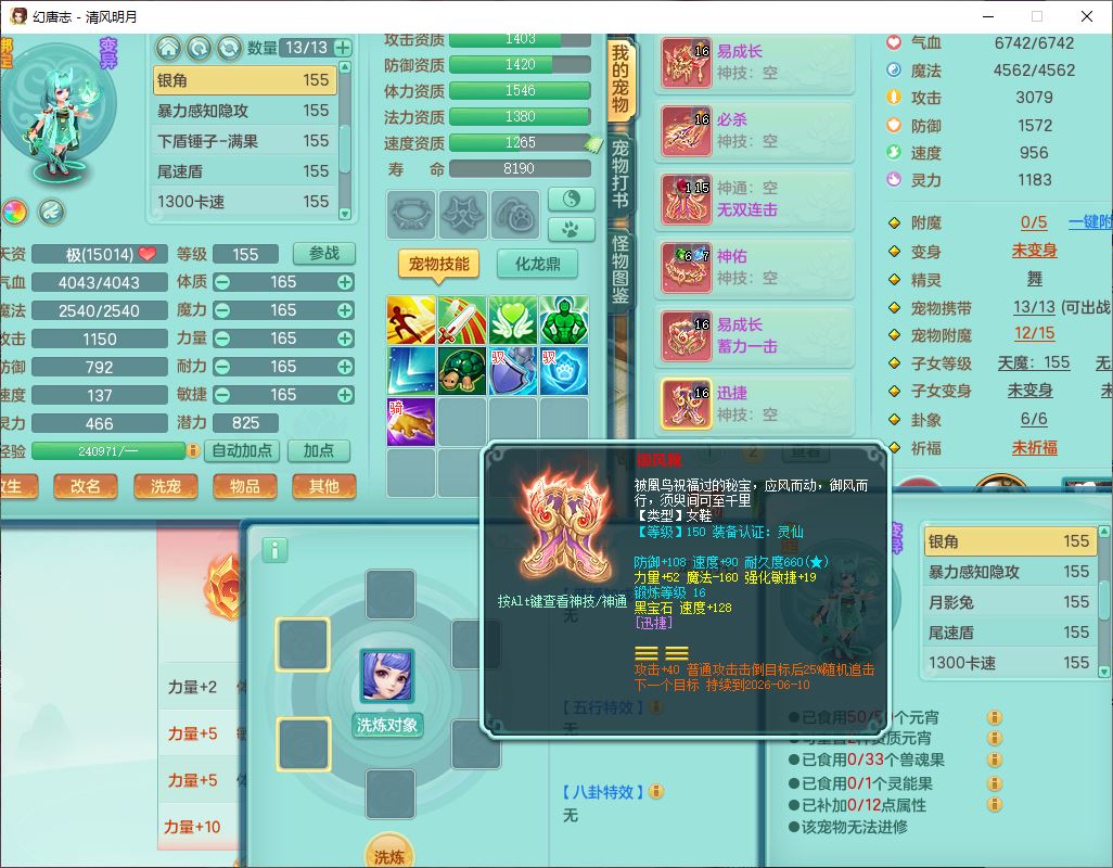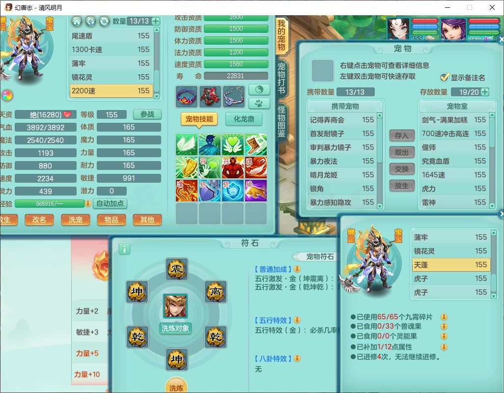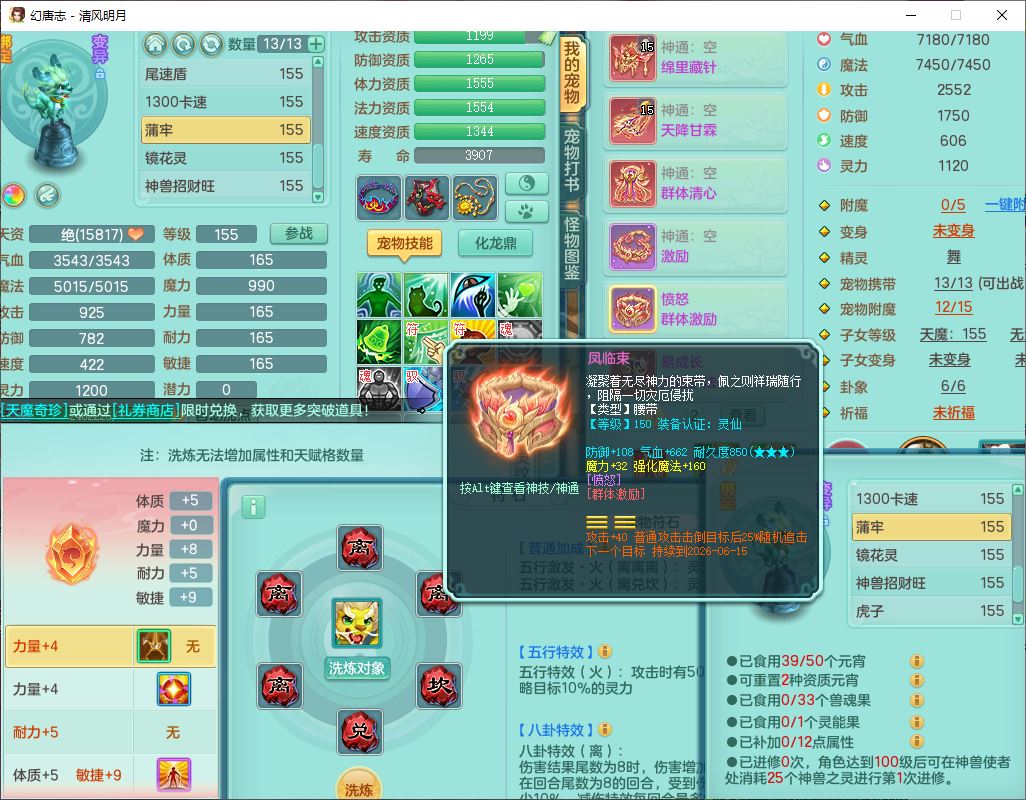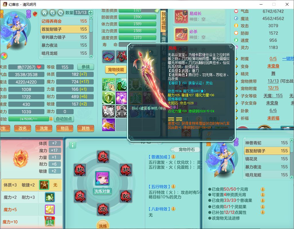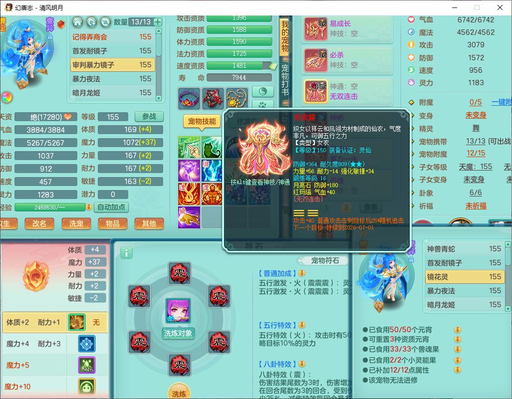 4349清风明月159女万兽精灵舞,1内丹青蛇5镜花1龙姬1金炉2特殊兽决(怒破、雷利),8觉醒3六字1五字3四字(1洗练珠)12只满果子,7红装备,必杀武器,神佑项链,Y蓄力腰带,一套8红辅助装,愤怒群体激励腰带,Y罗汉鞋子,鼎4.5+70,64天月卡,20个仙兽灵,48个内丹碎片,1飞行坐骑