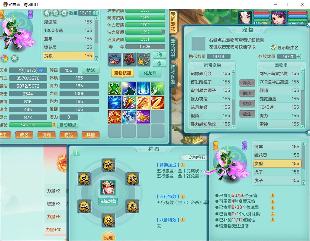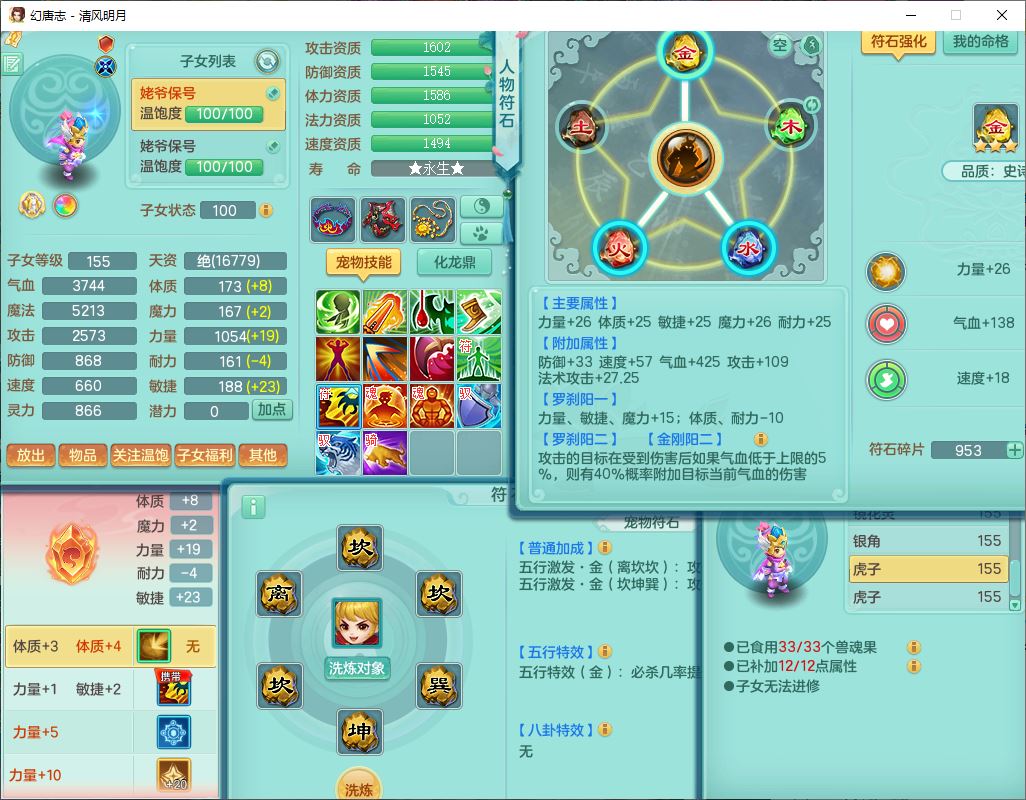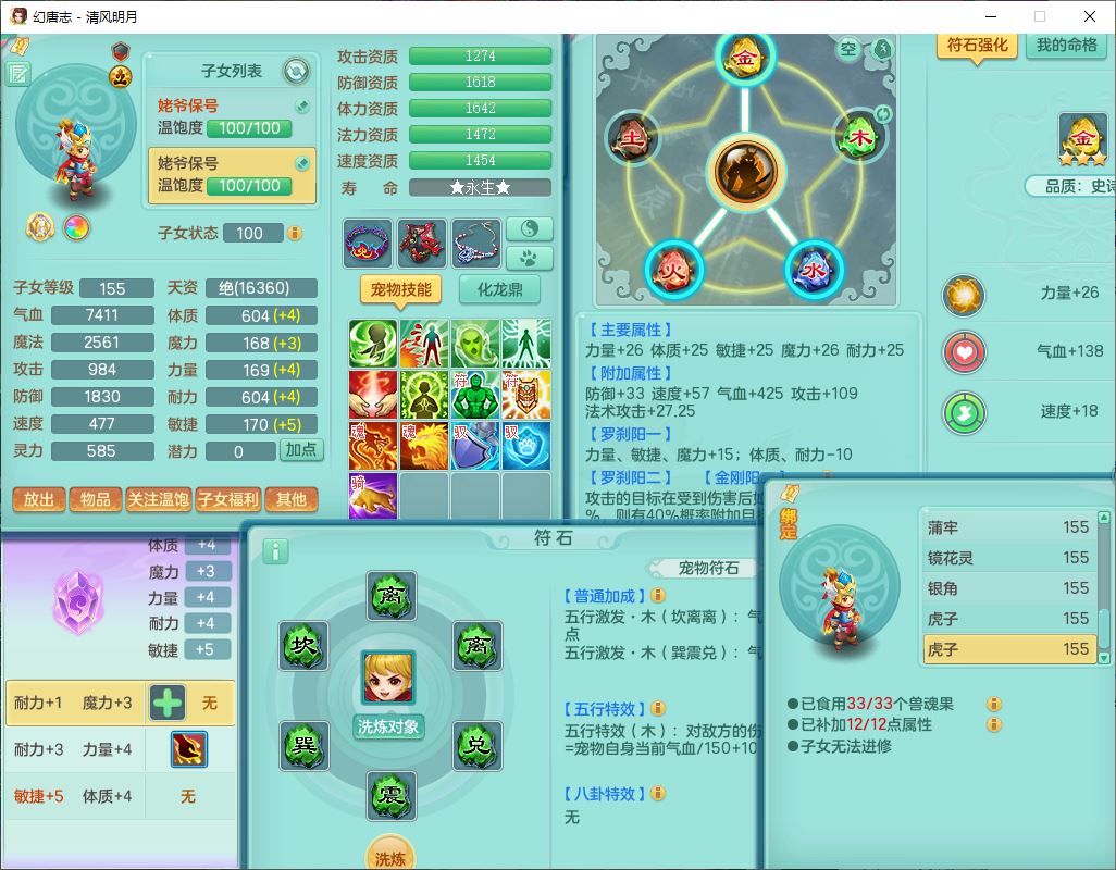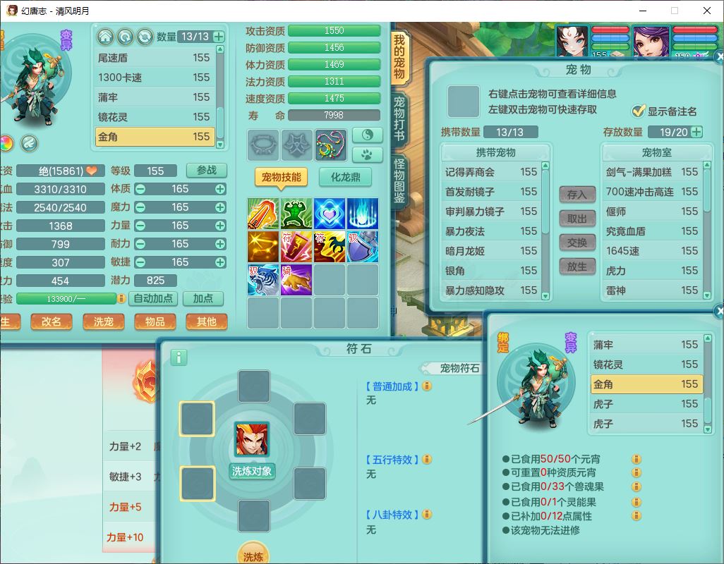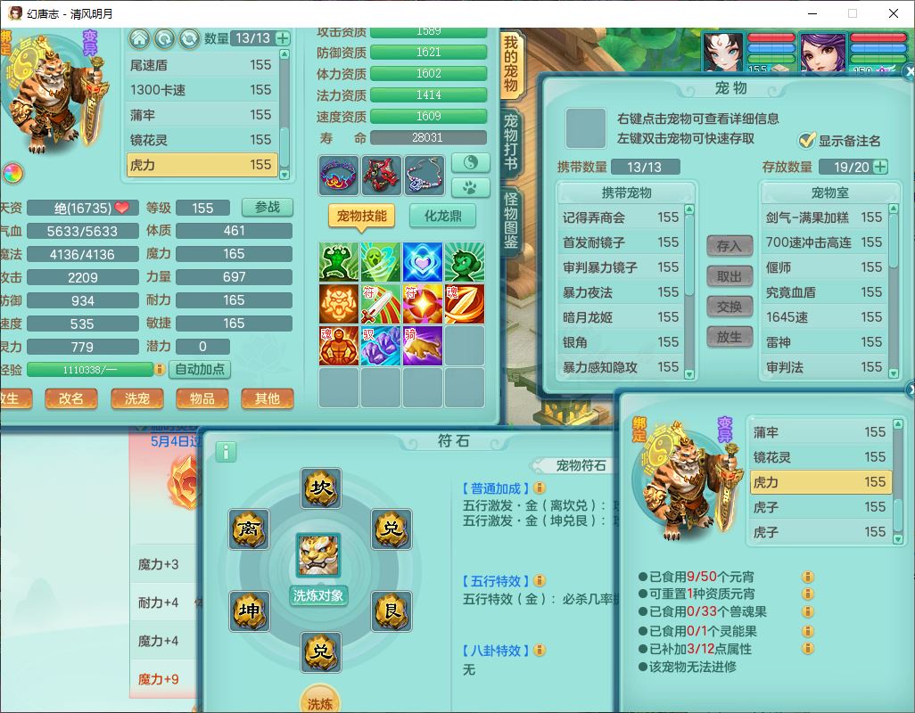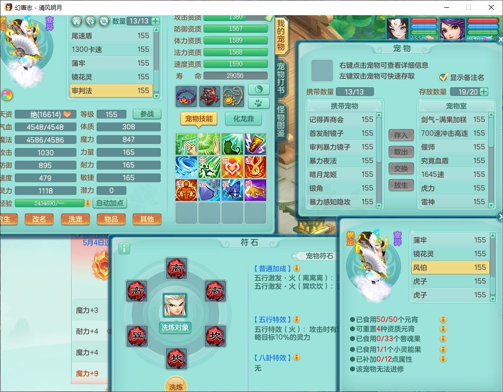 4349清风明月159女万兽精灵舞,1内丹青蛇5镜花1龙姬1金炉2特殊兽决(怒破、雷利),8觉醒3六字1五字3四字(1洗练珠)12只满果子,7红装备,必杀武器,神佑项链,Y蓄力腰带,一套8红辅助装,愤怒群体激励腰带,Y罗汉鞋子,鼎4.5+70,64天月卡,20个仙兽灵,48个内丹碎片,1飞行坐骑