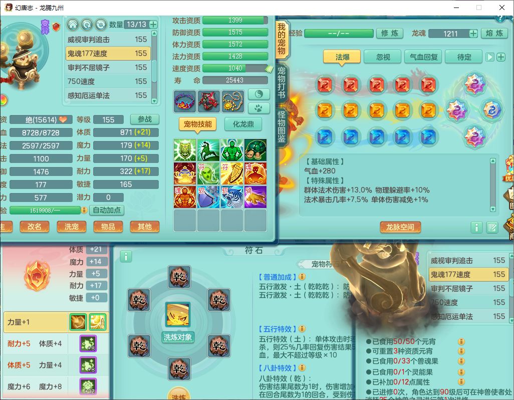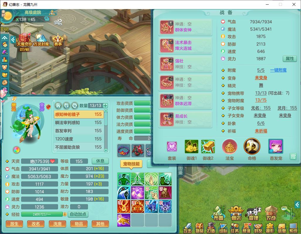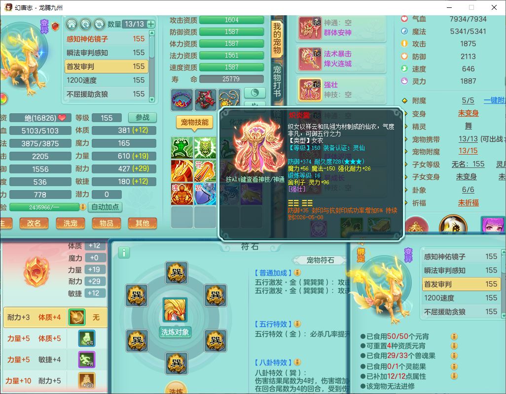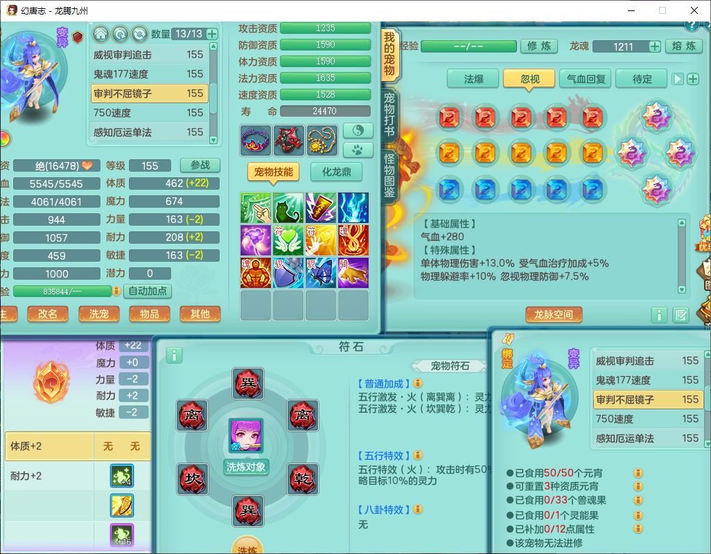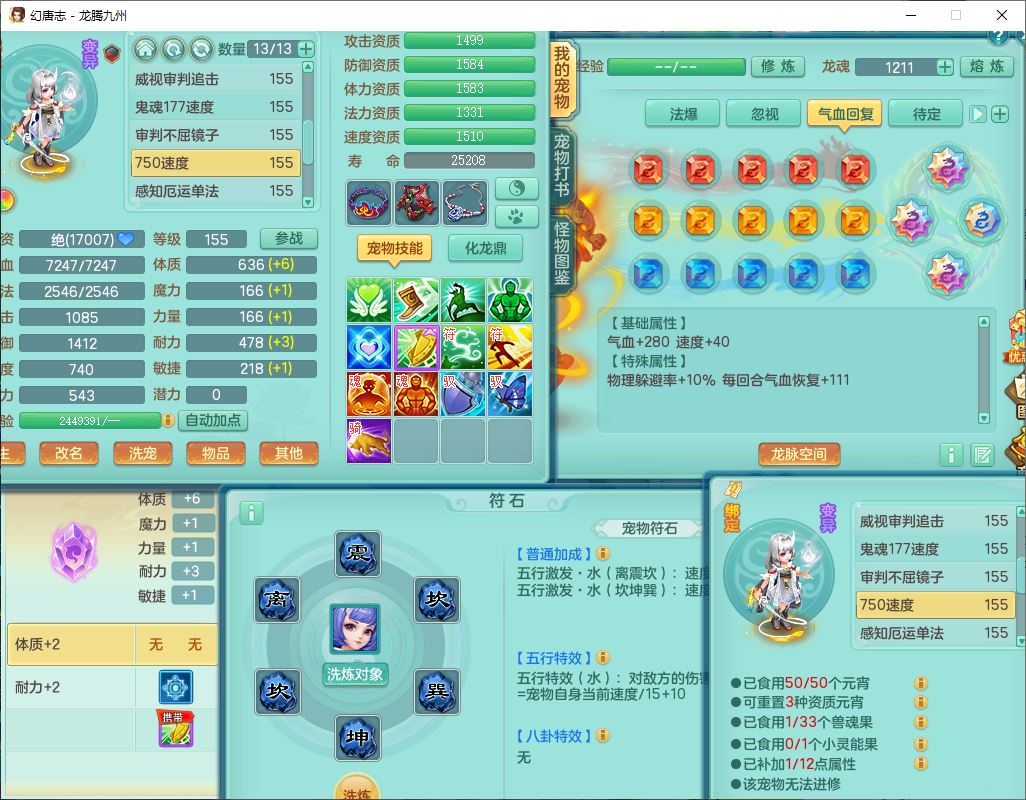 62411龙腾九州159女龙宫【准潜龙号,差1只宝宝4条主符石2条附加】精灵舞,1神兽(无内)1望归2镜花1金炉1龙姬2特殊兽决(月光、流星),7觉醒6六字3五字1四字,装备齐全,法爆烽火武器,鼎5.5+70+280,永久外观,24个仙兽灵,42个内丹碎片,2坐骑