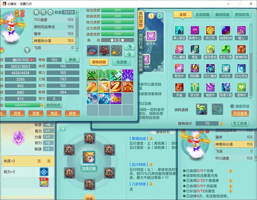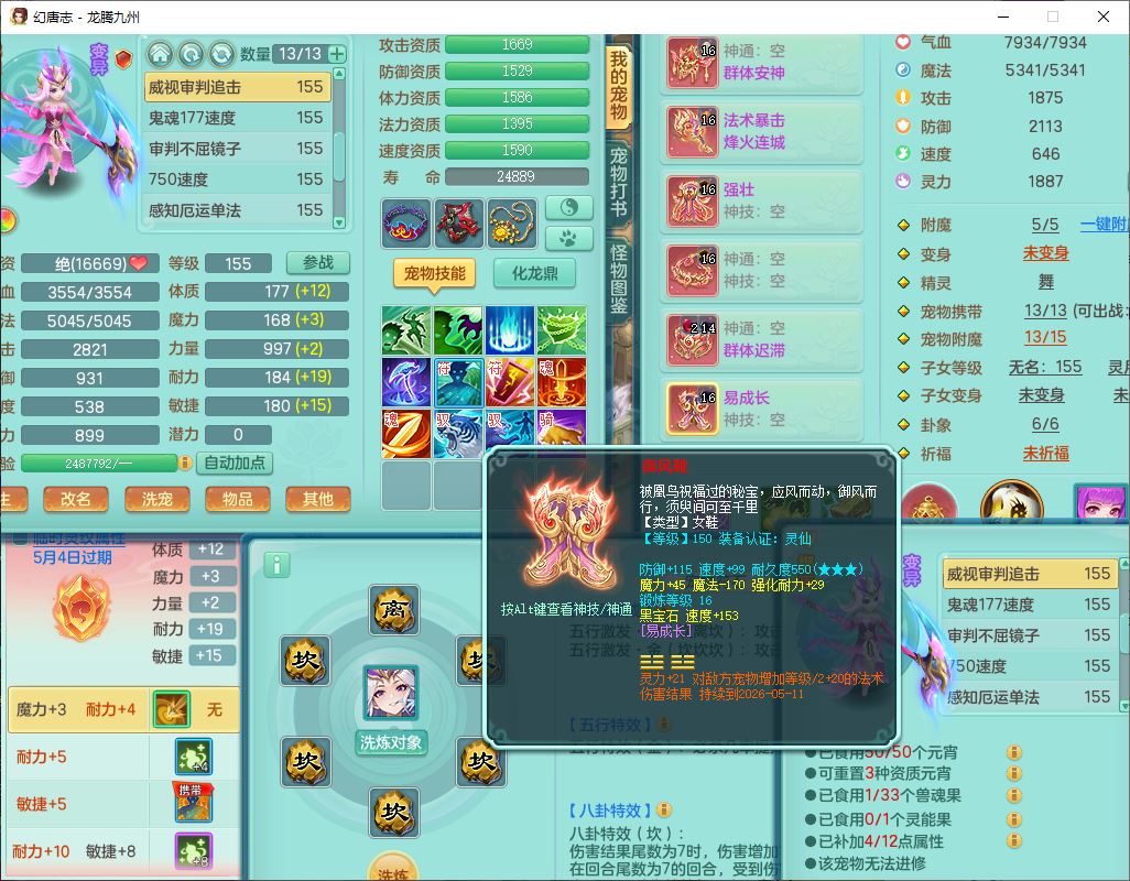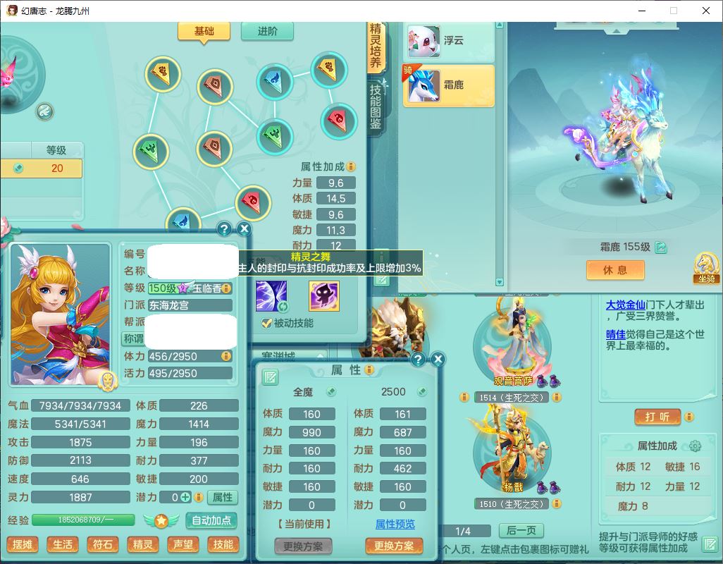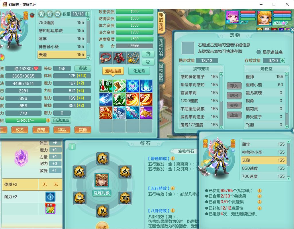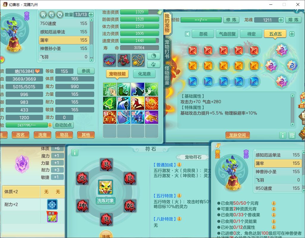 62411龙腾九州159女龙宫【准潜龙号,差1只宝宝4条主符石2条附加】精灵舞,1神兽(无内)1望归2镜花1金炉1龙姬2特殊兽决(月光、流星),7觉醒6六字3五字1四字,装备齐全,法爆烽火武器,鼎5.5+70+280,永久外观,24个仙兽灵,42个内丹碎片,2坐骑