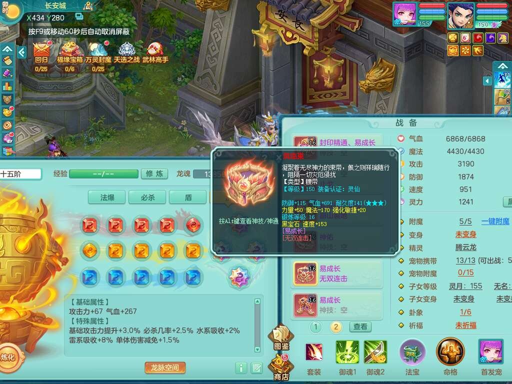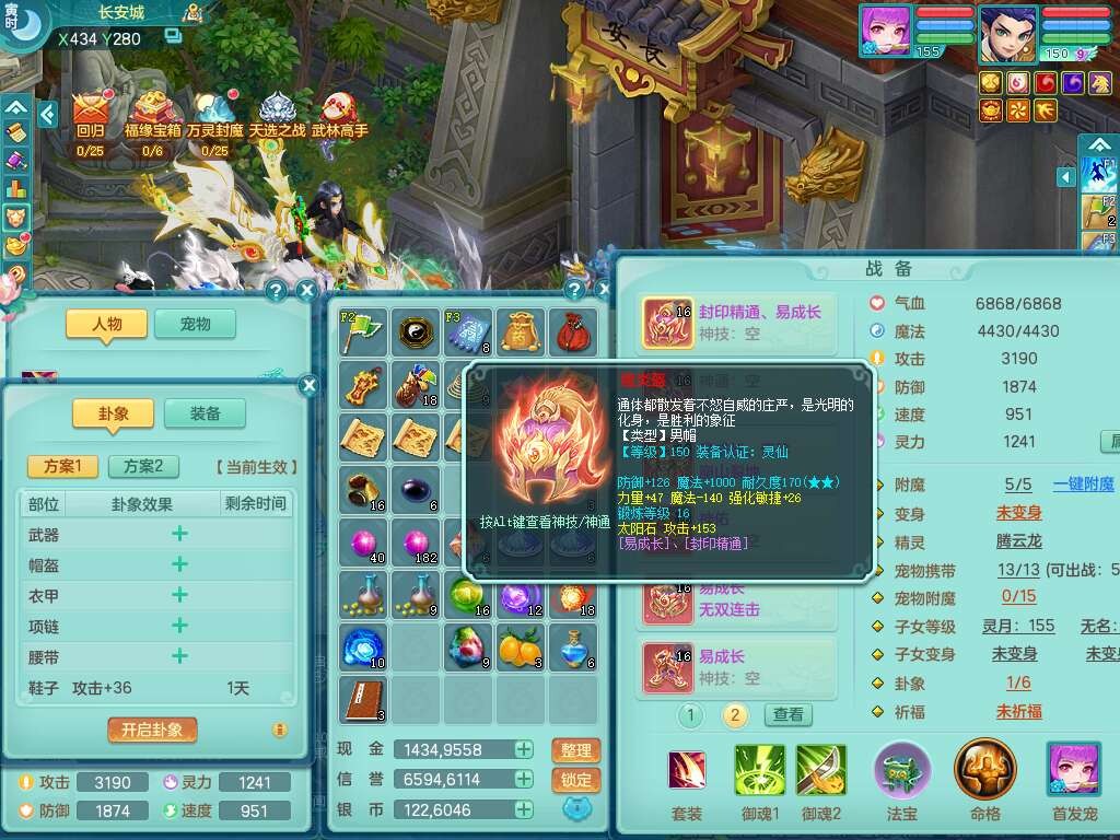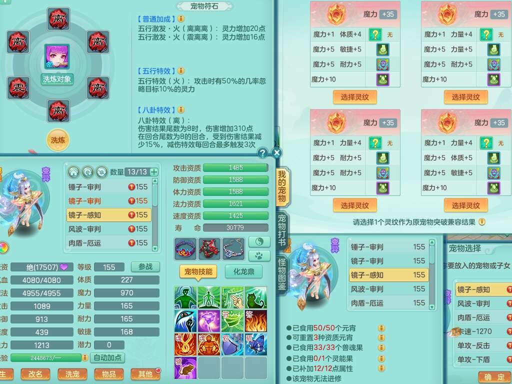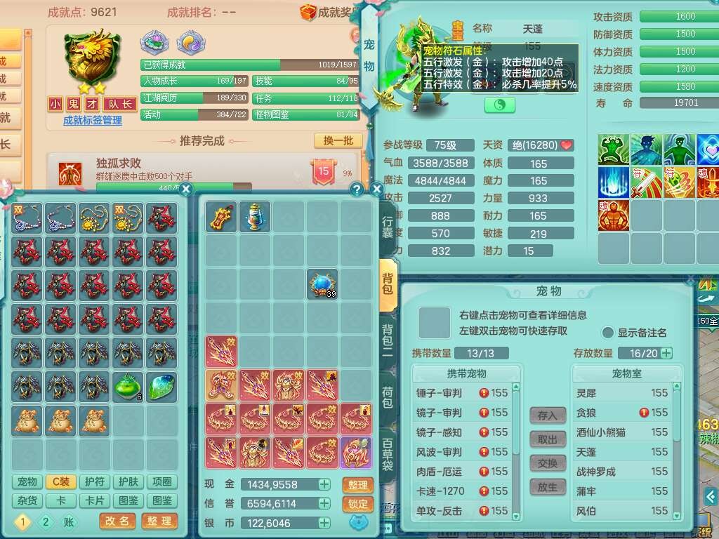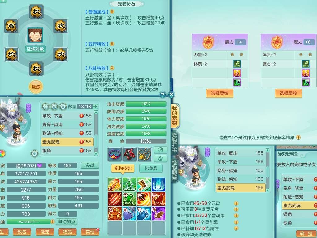 A22259超凡入圣159男天宫,精灵怒,1内胆神,4只觉醒。4宠皮+2幻灵果,2特殊(号角,上善),3只6技能镜花灵,易成长封印精通单加头,三红易成长奇珍崩山衣服,神佑单加链子,易成长破血单加腰带,易成长单加51鞋子,266易成长单加链子,5.0基础鼎,3个纯六字,2个5字,13只满果子,背包39仙兽蛋,2个染色坐骑,带百万银币。