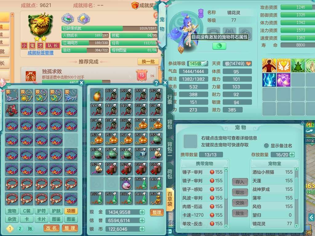 A22259超凡入圣159男天宫,精灵怒,1内胆神,4只觉醒。4宠皮+2幻灵果,2特殊(号角,上善),3只6技能镜花灵,易成长封印精通单加头,三红易成长奇珍崩山衣服,神佑单加链子,易成长破血单加腰带,易成长单加51鞋子,266易成长单加链子,5.0基础鼎,3个纯六字,2个5字,13只满果子,背包39仙兽蛋,2个染色坐骑,带百万银币。