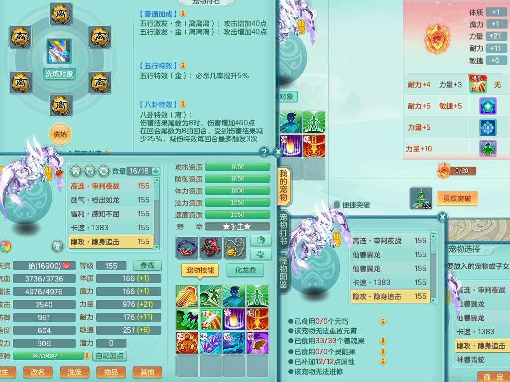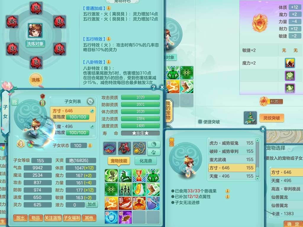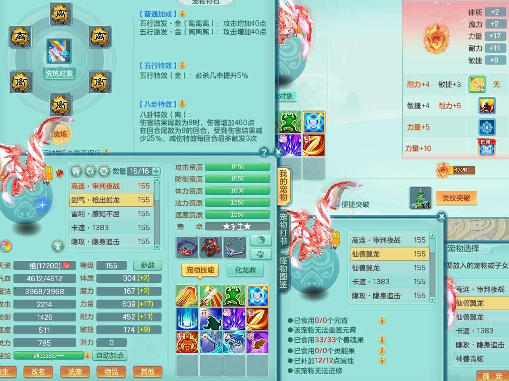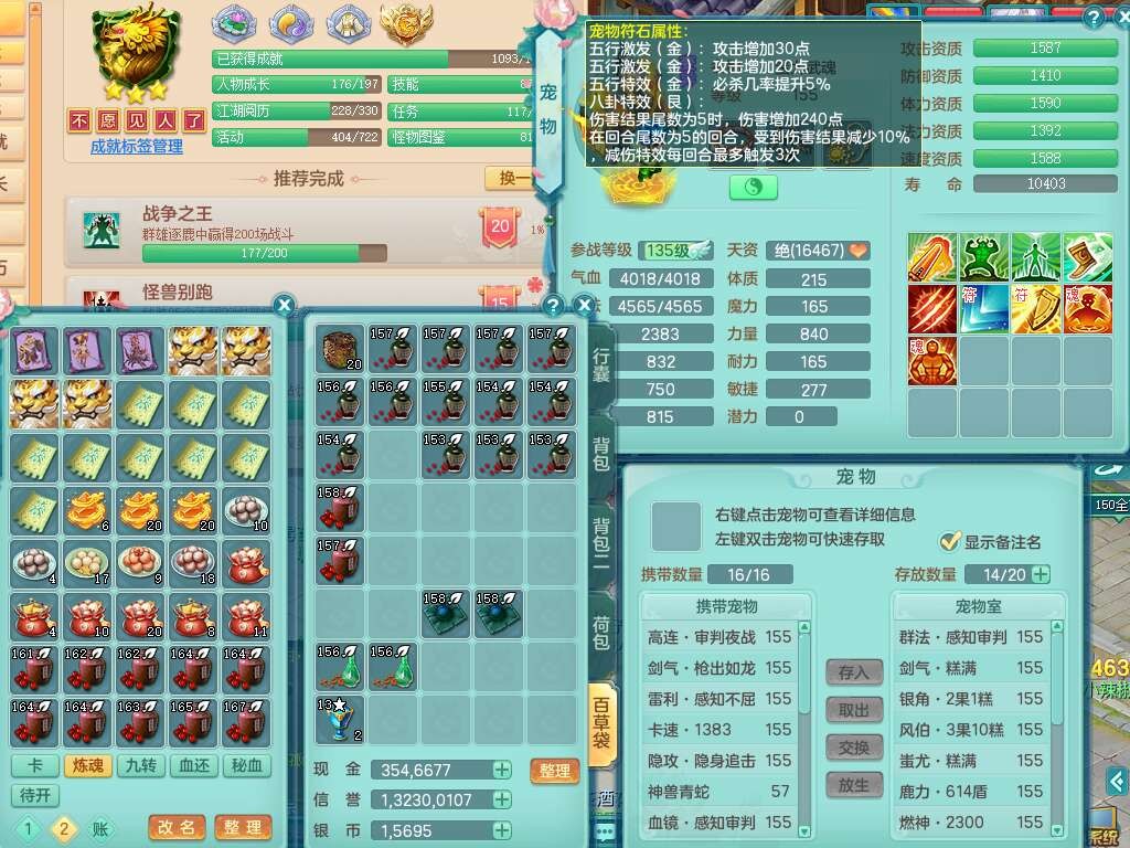 J22258超凡入圣159男灵月山,精灵舞,5龙(1龙没内),1内丹神,1破镜,【11觉醒,已潜龙】,8位靓号不含4(AABBBBAA),2宠皮,1特殊(羽袭),3只六技能镜花灵,1只六技能龙姬,易成长止戈单加54头,匠心四海项链,愤怒五特,5.5基础鼎+70攻+280血,8个纯六字,6个五字,15只满果子,仓库还有34个果子,宠排在榜,经验修炼在榜,3只双人坐骑,暴龙逍客+神驹马上发财+西瓜冰武器,带147天月卡。