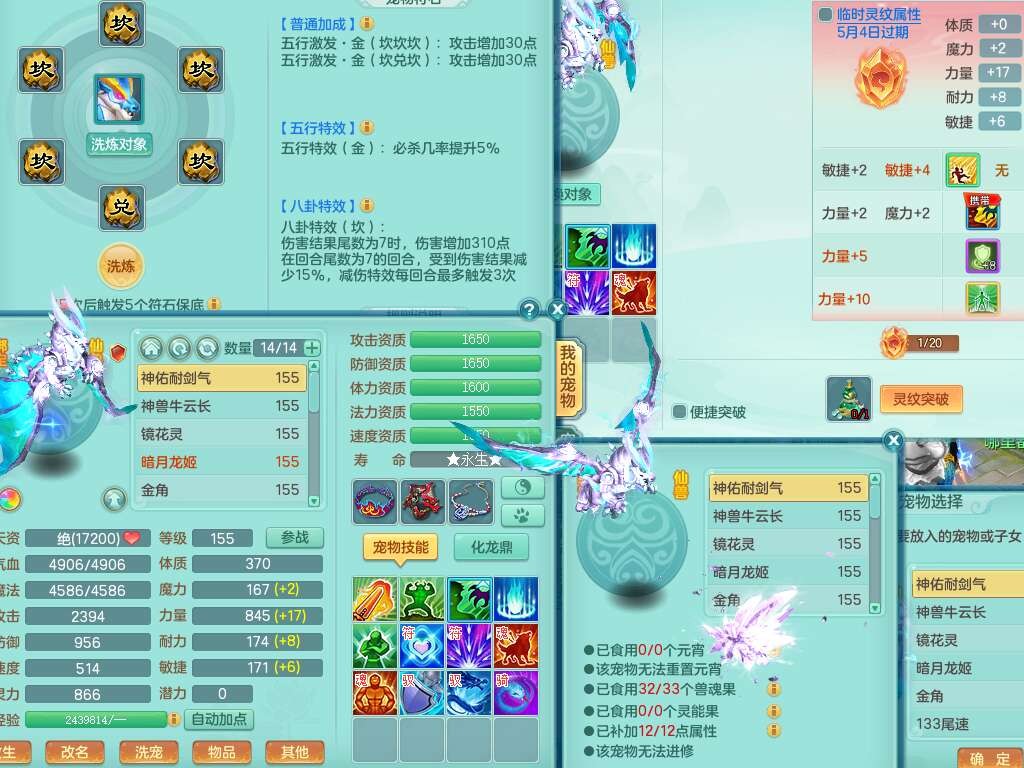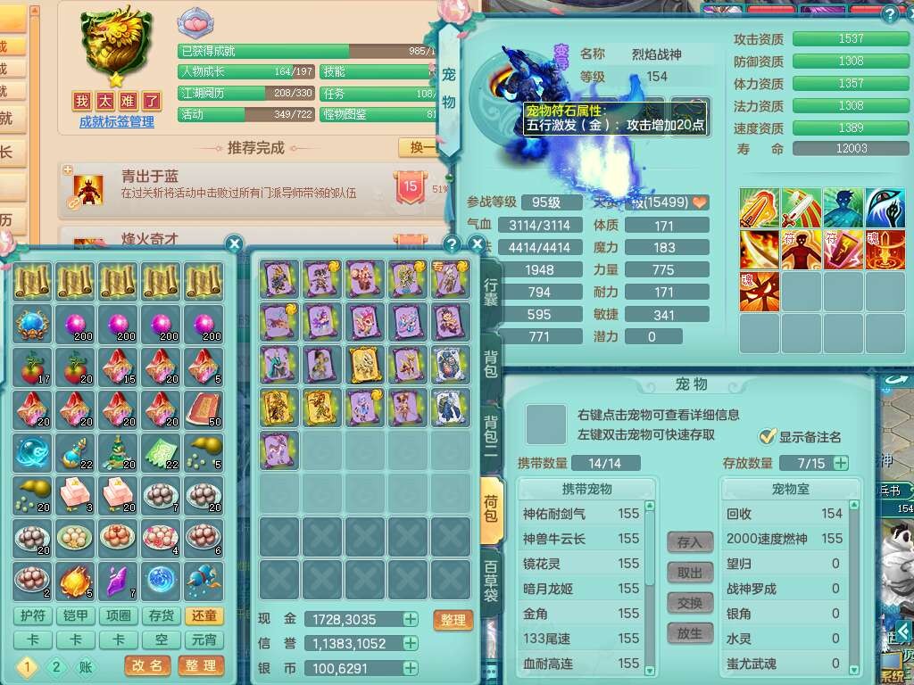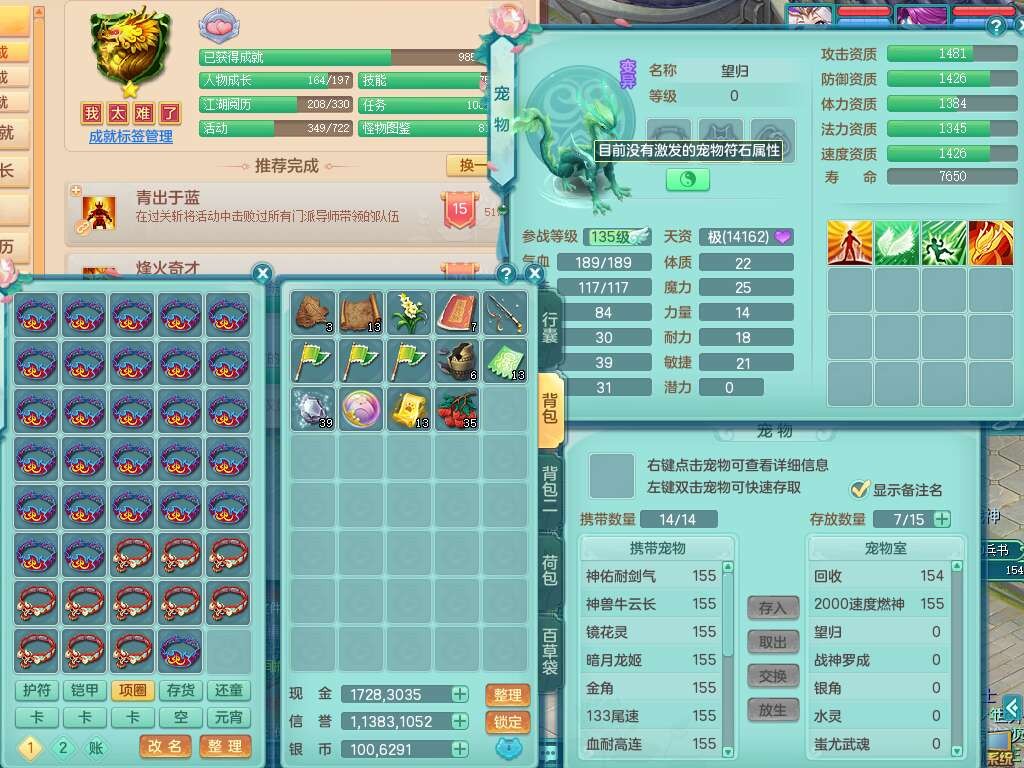 a22257风驰电掣154男盘丝,精灵舞,1内丹龙,1神兽,3觉醒,1只六技能镜花灵,1只六技能龙姬,易成长玉清单加53武器,震怒清心术单加51腰带,六特,4.5基础鼎,1个五字,1只满果子,仓库还有37个果子,带100w神武币,有安全证书,介意勿扰。