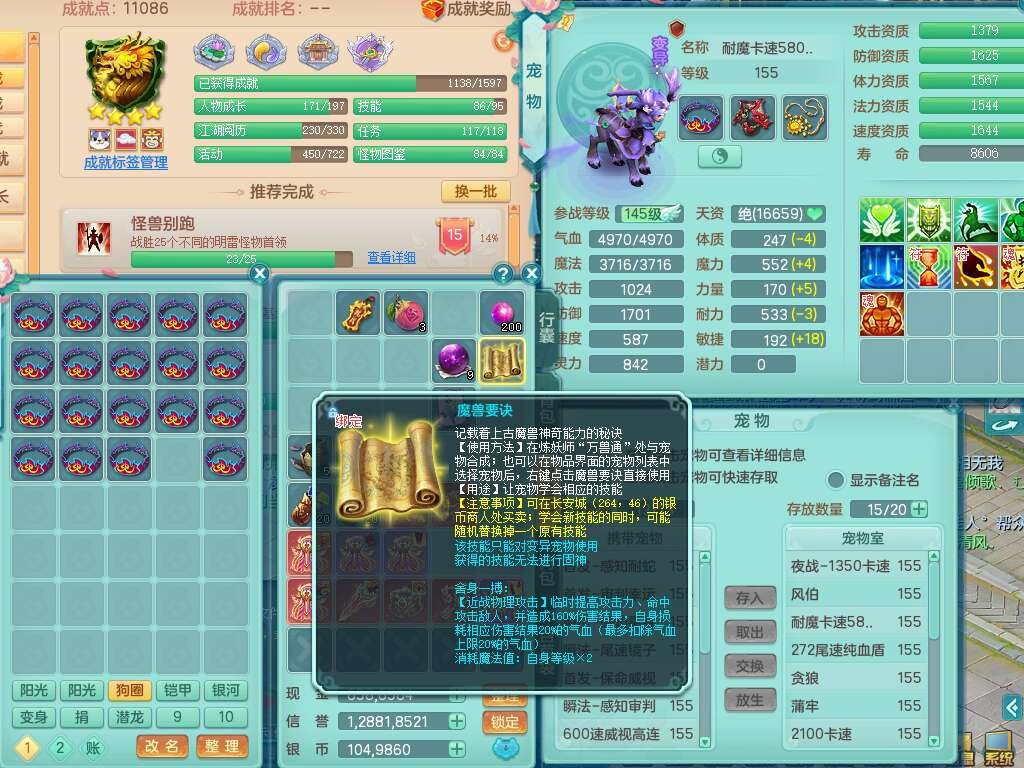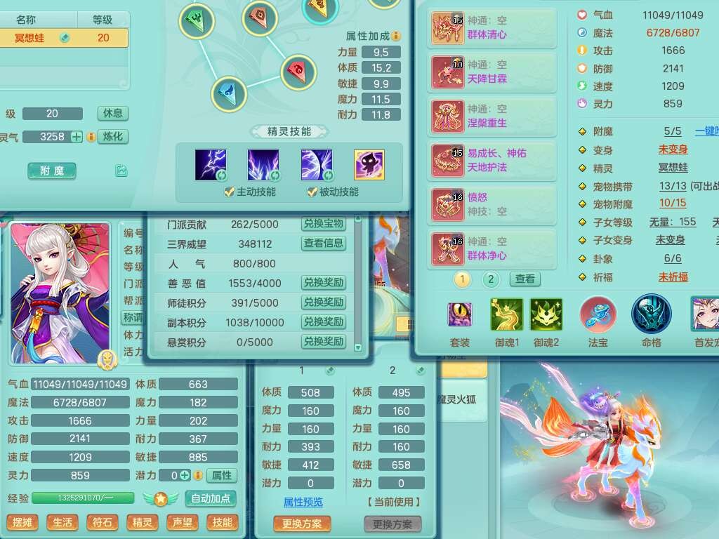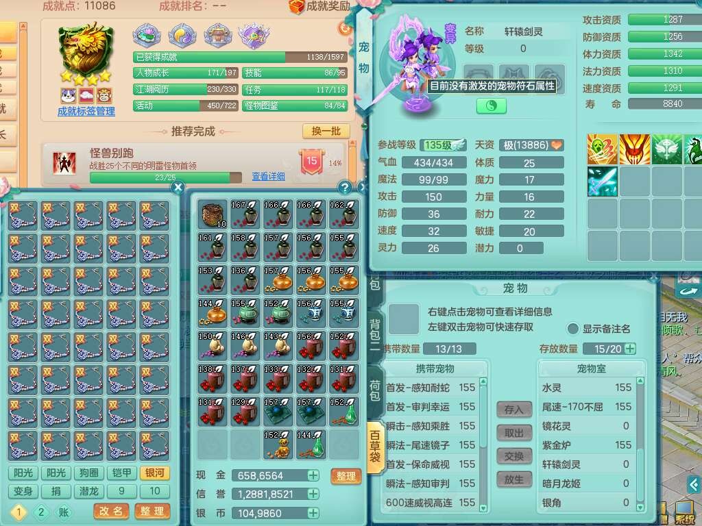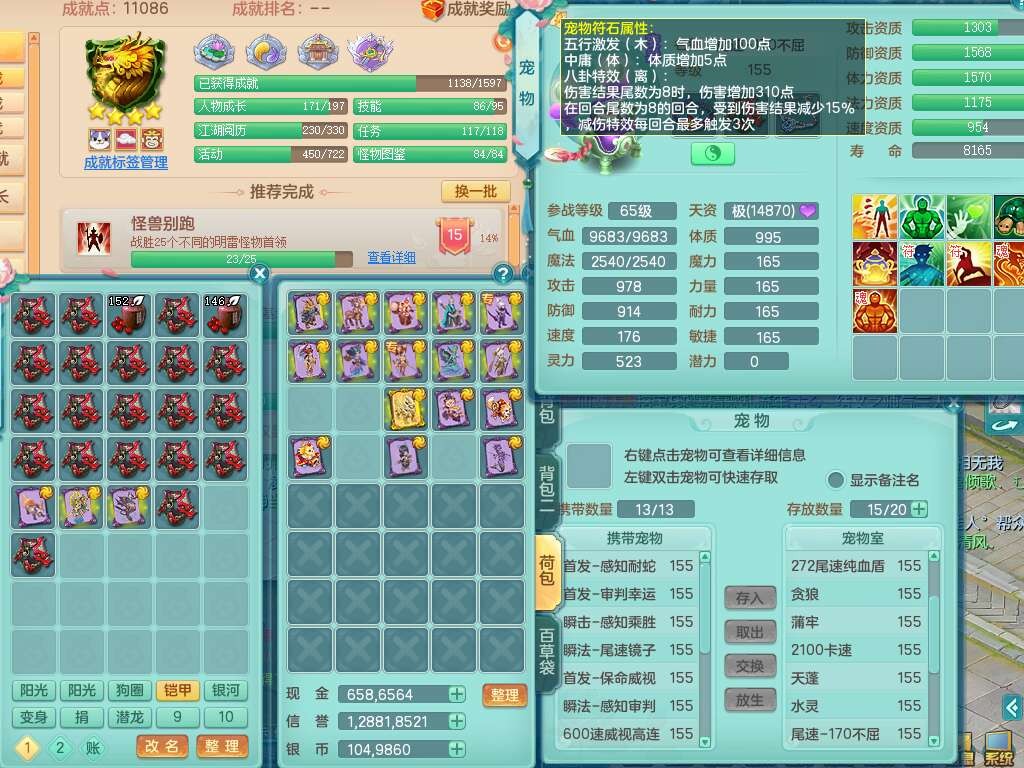 A22026彩云追月159女灵月山,精灵舞,1内胆神青蛇,3只神兽+33神兽内胆碎片,3只觉醒,1只六技能龙姬,3只六技能镜花灵,1特殊(舍身),三红易成长神佑罗汉项链,愤怒五特,躲避明镜单加50衣服,崩山衣服,狂暴破血武器,可转物理,2个五字,8只满果子,双人坐骑。