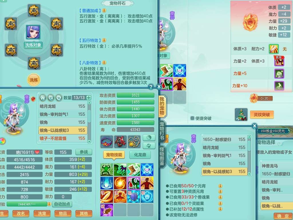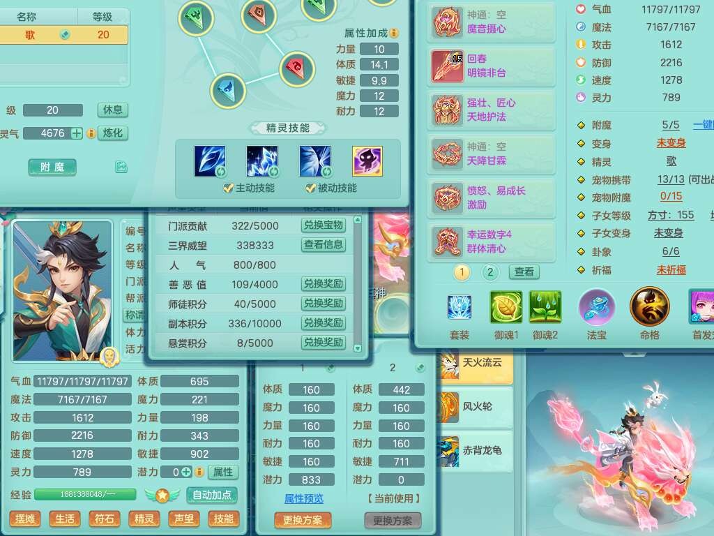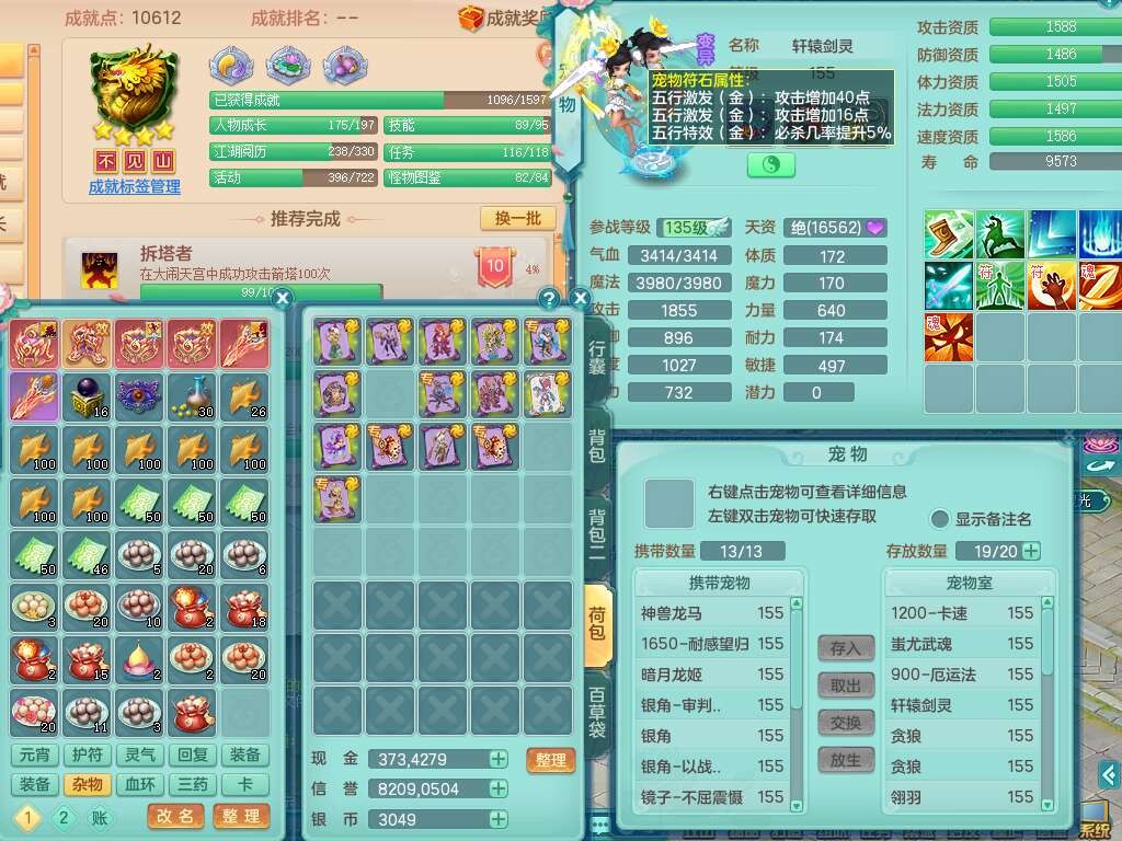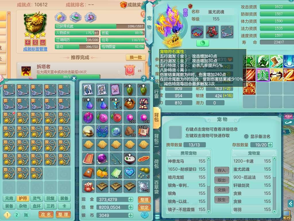 J22022龙腾九州159男普陀,精灵舞,1内胆神,5只觉醒(潜龙条件只差2只觉醒,1个6字),4特殊(以战,夺命,灵傀,虎虎),3只6技能镜花灵,1只6技能龙姬,三红愤怒易野兽腰带,回春愤怒6特,5.5基础鼎+70攻,280血,6个纯六字,1个5字,13只满果子,仓库24神兽内丹碎片,24仙兽蛋,双人坐骑。