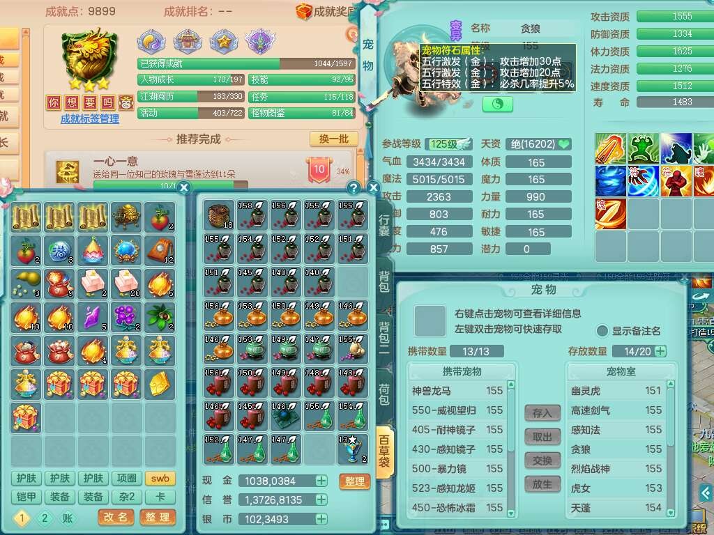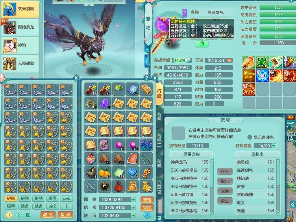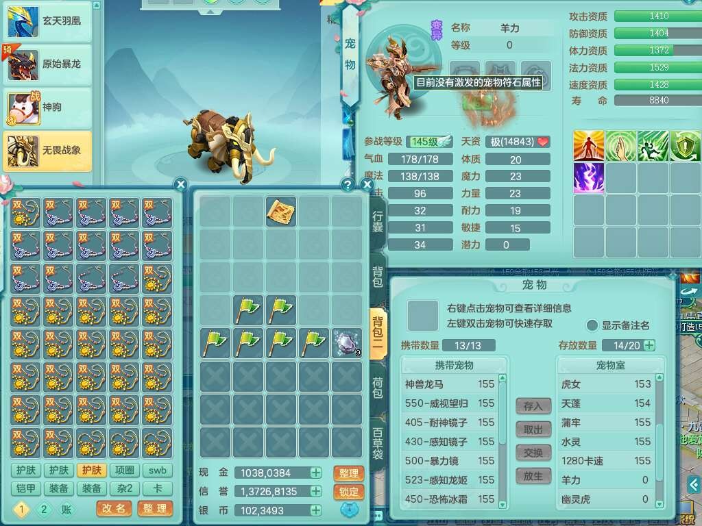 a22004今年勇159男天策,精灵歌,1内胆神,4只觉醒,3只6技能镜花灵,迅捷易单加51鞋子,934狂暴单加51武器,崩山衣服,愤怒单加腰带,4.5基础鼎,4只坐骑,暴龙洪荒+西瓜冰武器+神驹马到成功,带8787金币。➕159男方寸,精灵舞,1神兽(仓库48神兽内丹碎片),3只觉醒,3只觉醒,3特殊(影袭,藕断,流星),1只6技能镜花灵,封印精通愈心诀头,双红封锁武器,愤怒单加腰带,5特,5.0基础鼎,神驹马到成功+火焰之力。➕159女普陀,精灵歌,4.5基础鼎,带一百多万银币。