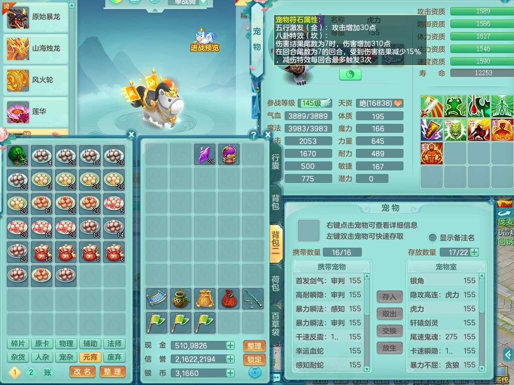 J21994超凡入圣159男万兽,精灵舞,5龙(1龙无内),1龙破镜,2内胆神+1颗神兽内丹,9只觉醒,1特殊(登云),4位靓号ABBB不含4,10宠皮,2只六技能镜花灵,934狂暴武器,崩山单加头,易成长群安单加55衣服,有件破血单加51衣服,有条272易成长单加链子,5.0基础鼎,13个格子,3个纯六字,2个五字,综合16只满果子,仓库还有118个果子,绝版原始暴龙逍客+西瓜冰武器皮肤+神驹马到成功,带152天月卡。