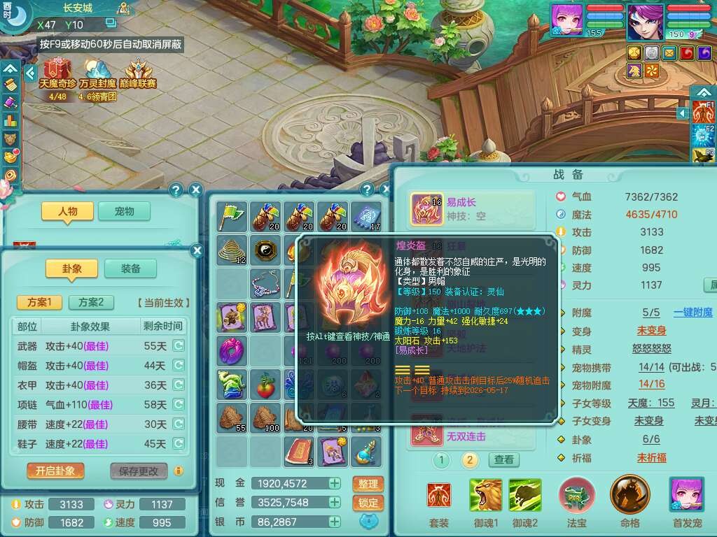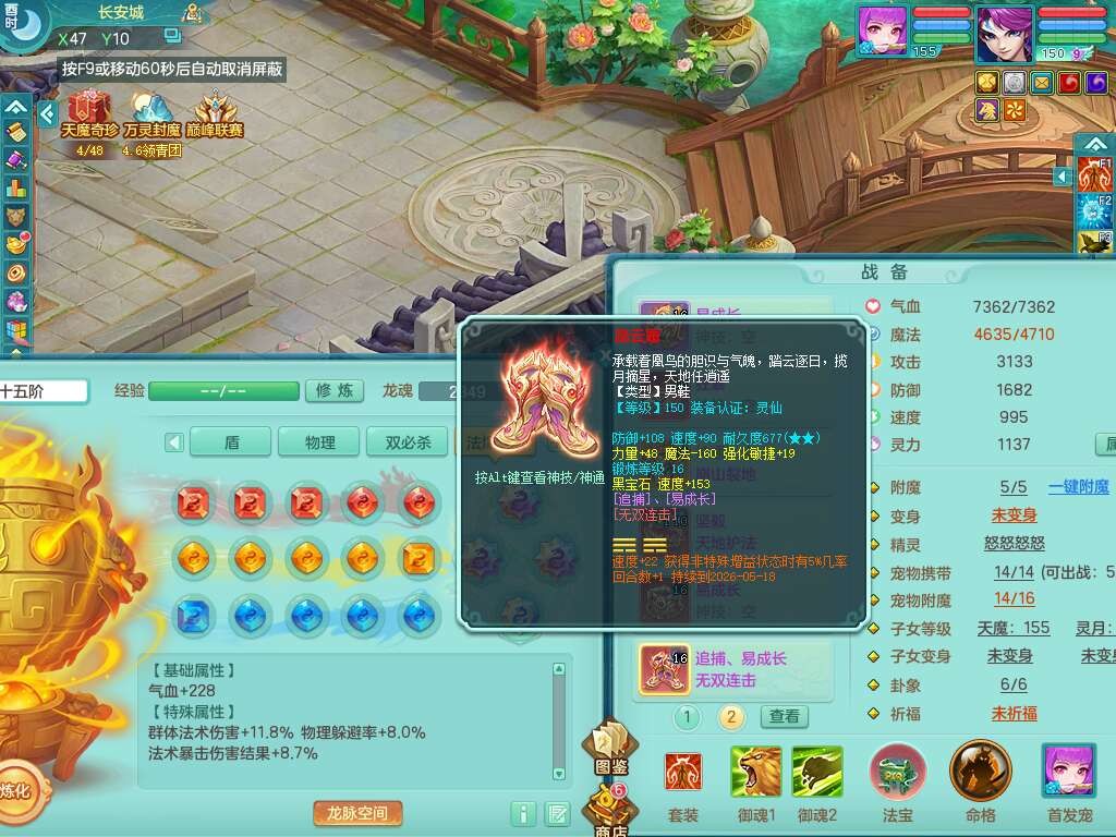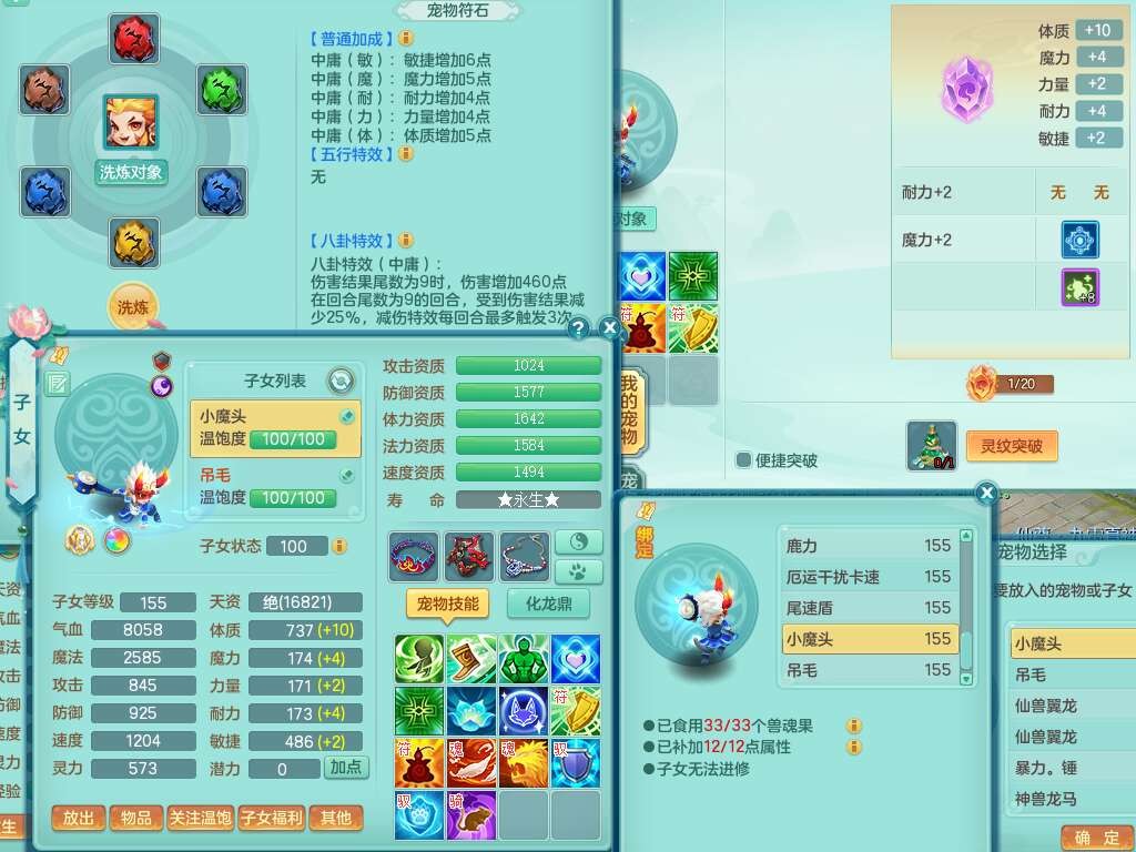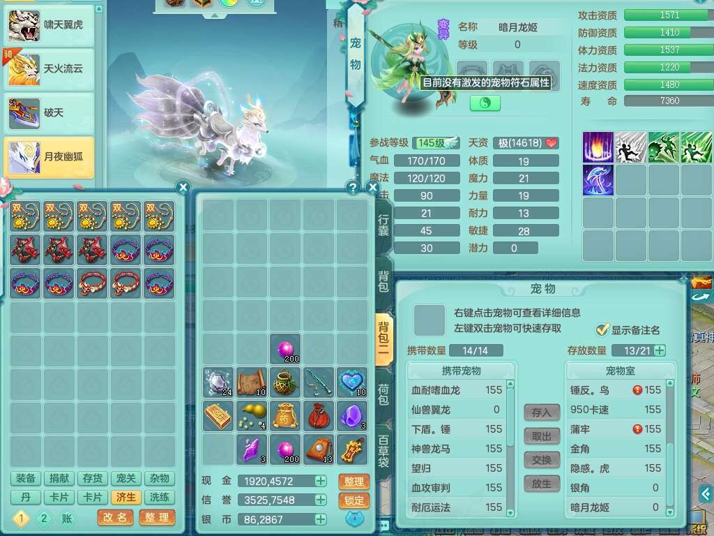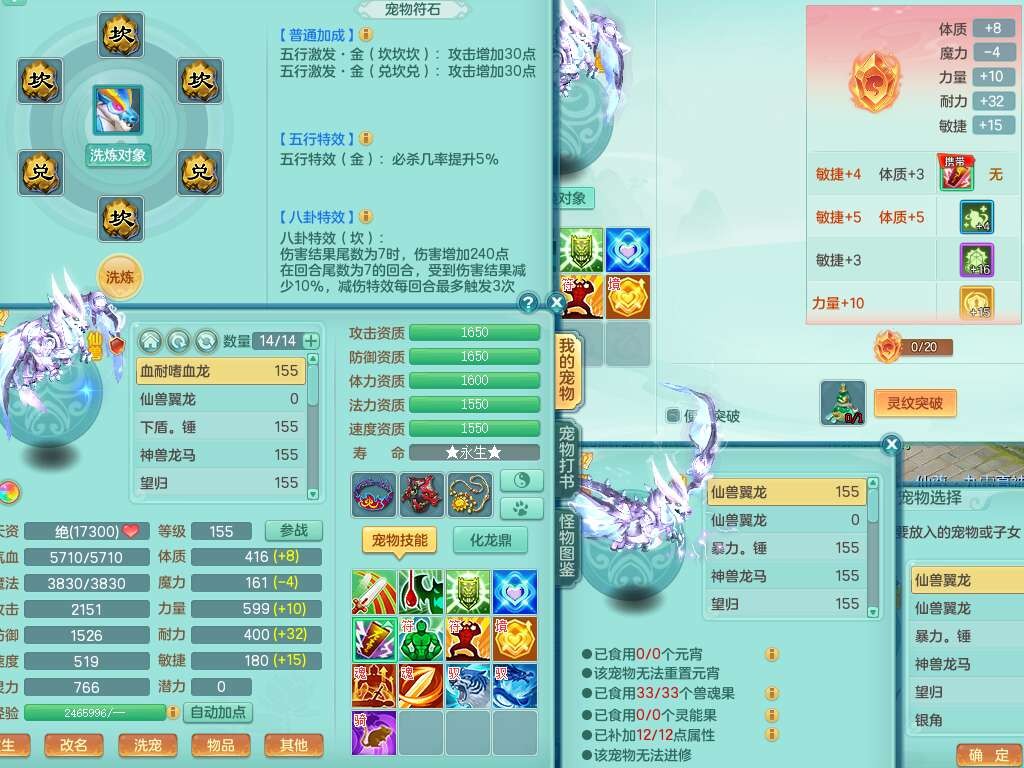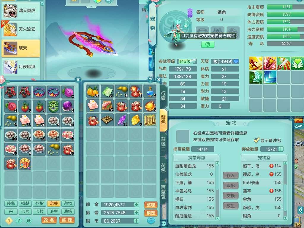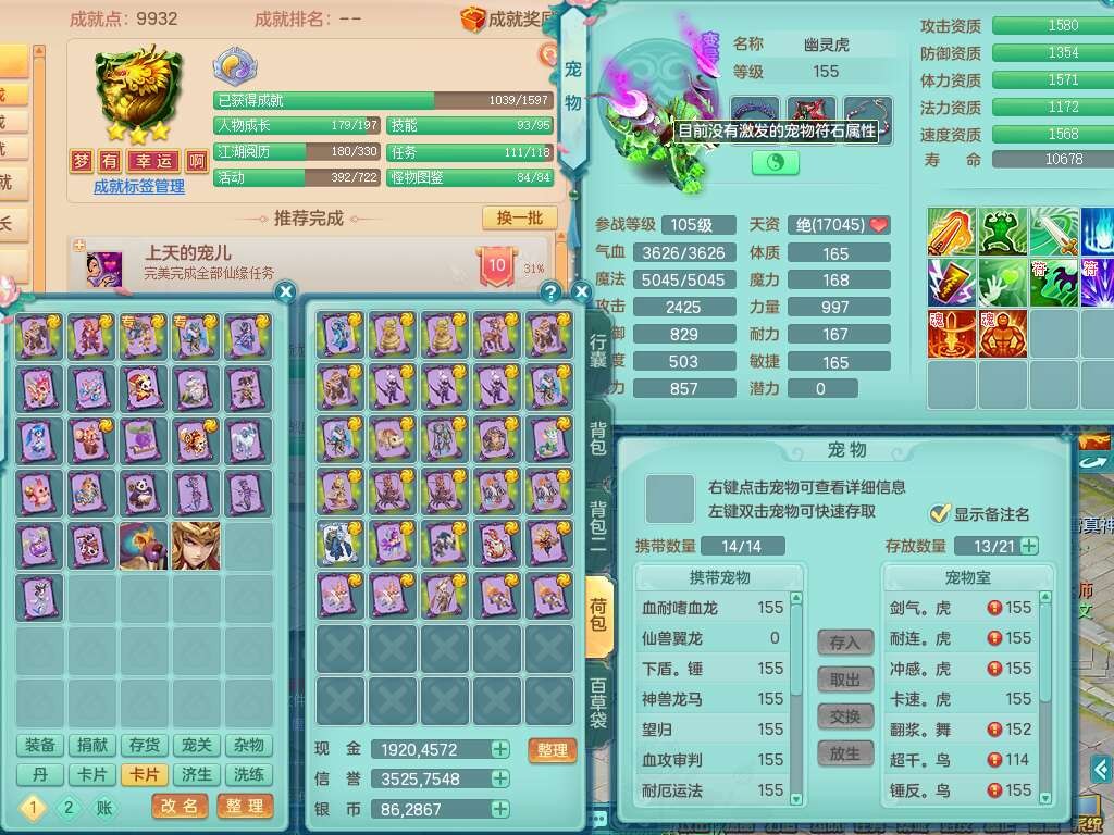 p21984阳春白雪159男万兽,精灵歌,2龙(1龙无内),2内胆神,1破镜,4只觉醒,1只6技能镜花灵,901狂暴单加武器,崩山衣服,坚毅罗汉链子,三红追捕易成长破血单加鞋子,4.5基础鼎,身上7只满果子,4只坐骑。