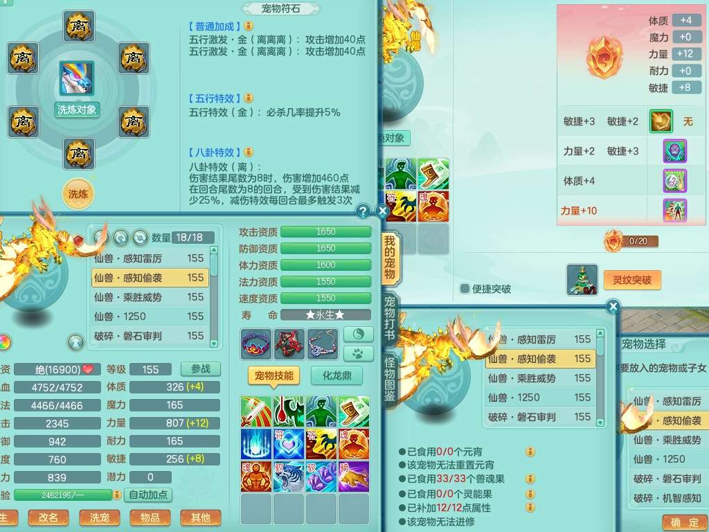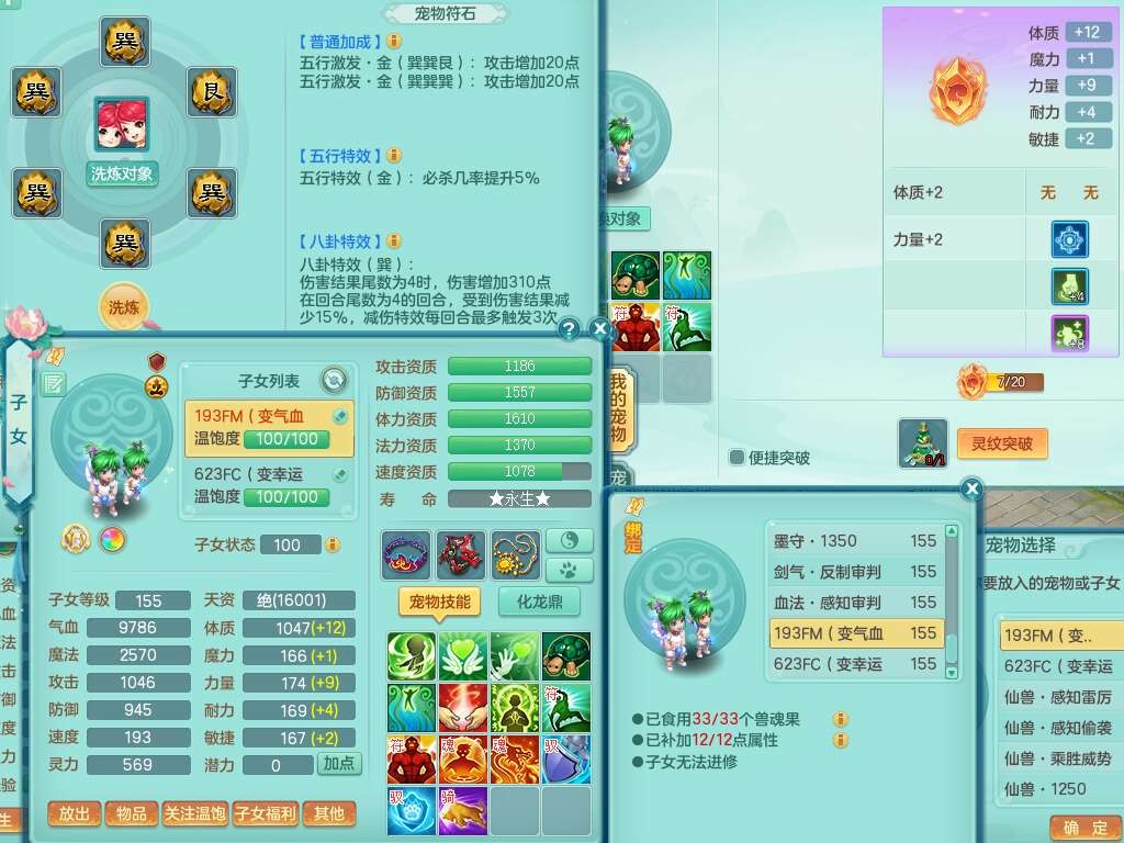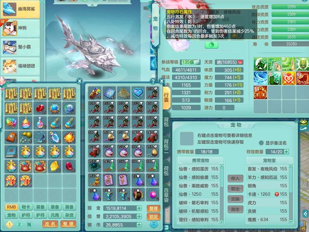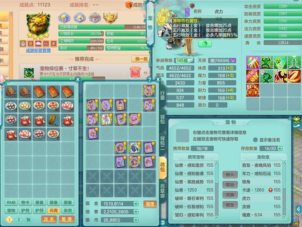 J21979扬名立万159男灵月山,精灵舞,4龙2内胆神,【12只觉醒,已潜龙】,6宠皮,4位靓号不含4,3只六技能镜花灵,2只6技能龙姬,3特殊(墨守,守护,翻江),愤怒六特,5.5基础鼎+70攻、280血,15个格子,11个纯六字,2个五字,23只满果子,宠排在榜,3只坐骑,神驹马到成功+火焰之力,月卡还有179天。带2个159奶粉。