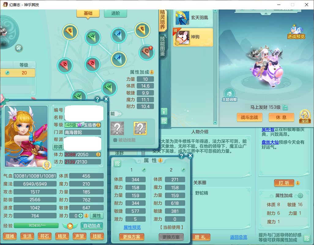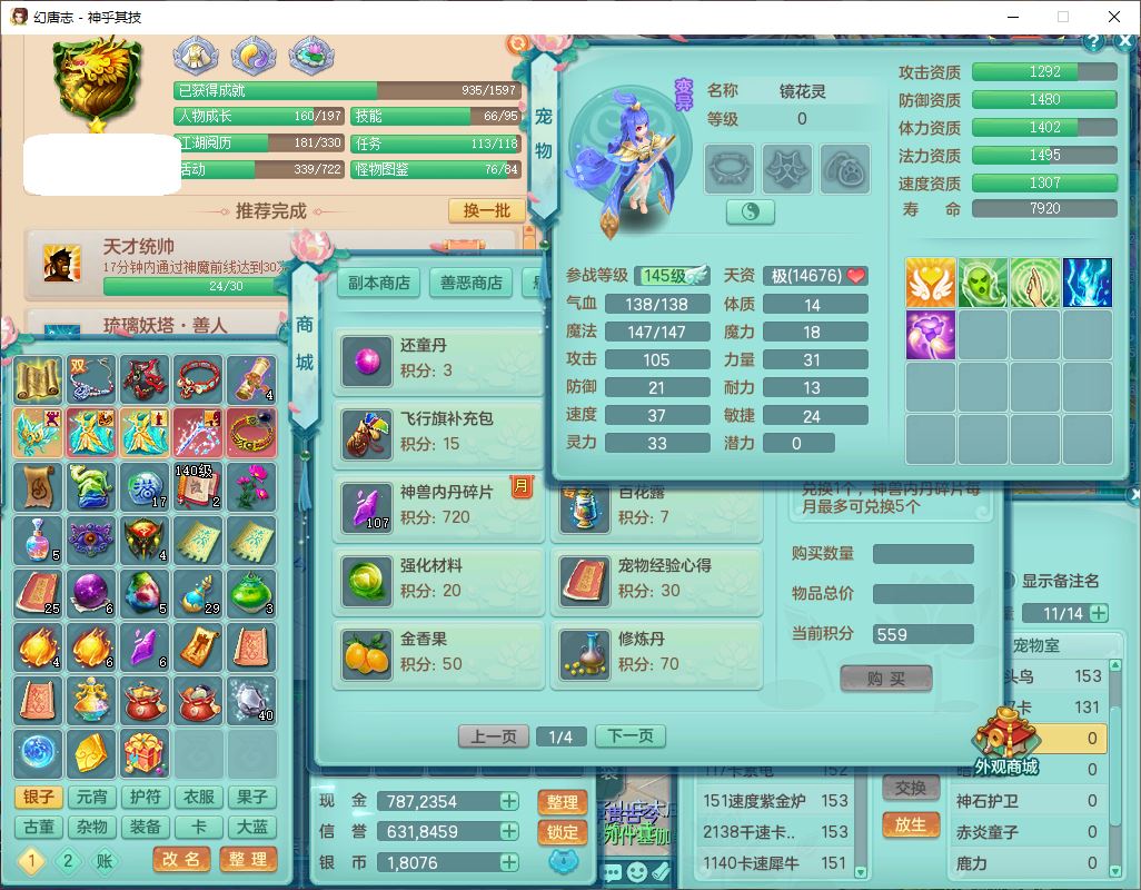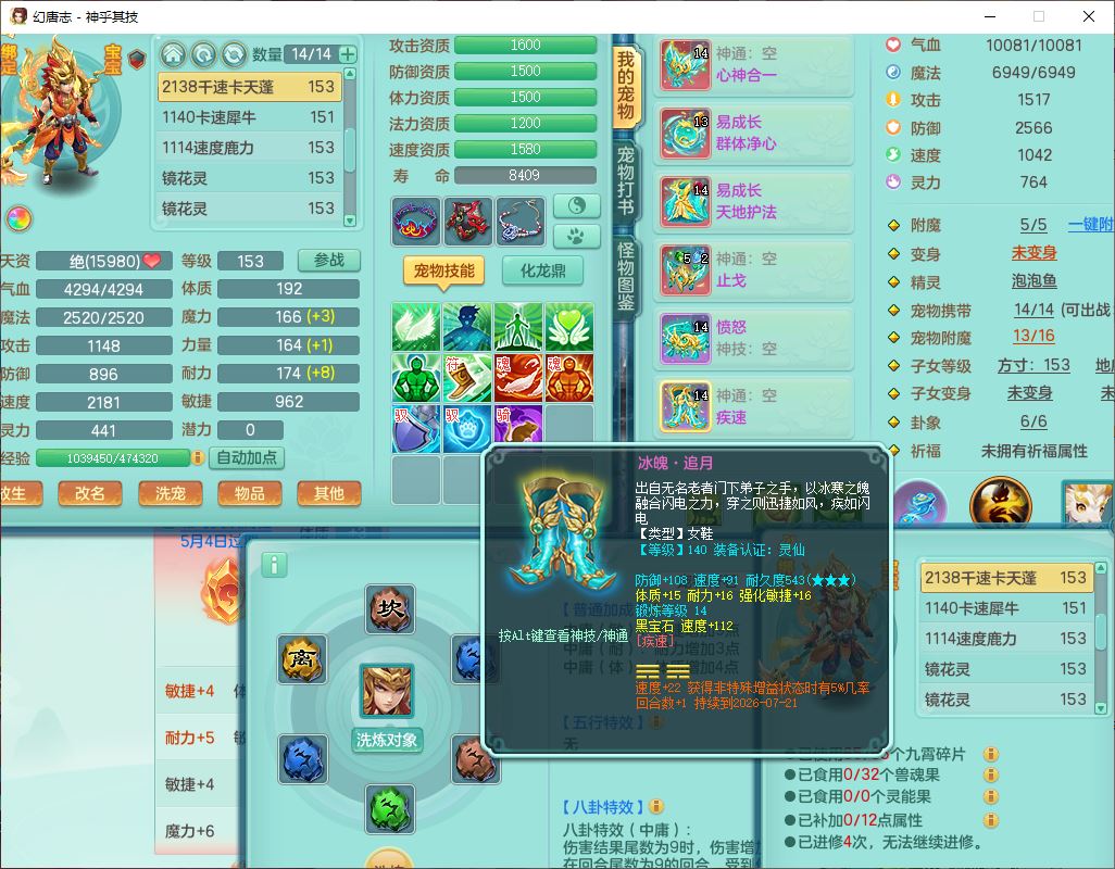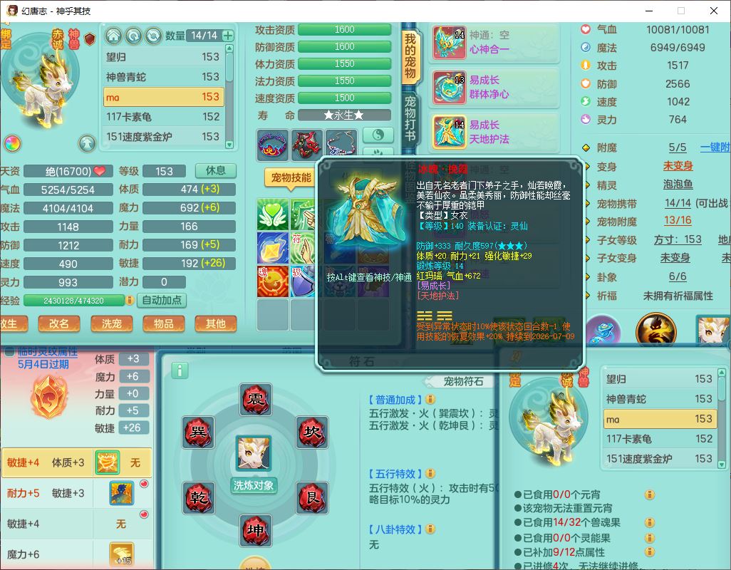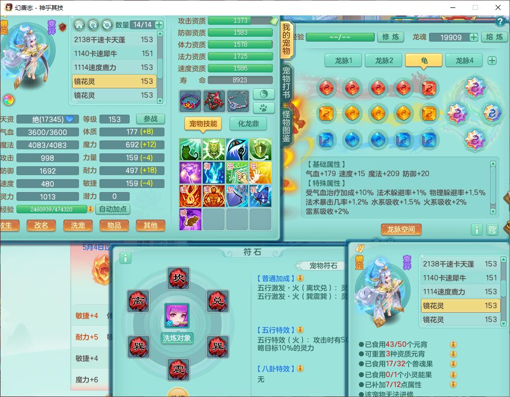 62437神乎其技148女普陀【马上发财】准精灵舞,2内(1青蛇1龙马)1望归1金炉2镜花1飞羽1童子,2宠皮2孩子(地府+方寸),8红装备,Y晶清武器,Y罗汉衣服,133天月卡,冰晶庭院195房屋186,永久背饰、精灵皮肤,经验、宠排在榜,1双人飞行坐骑,带双重