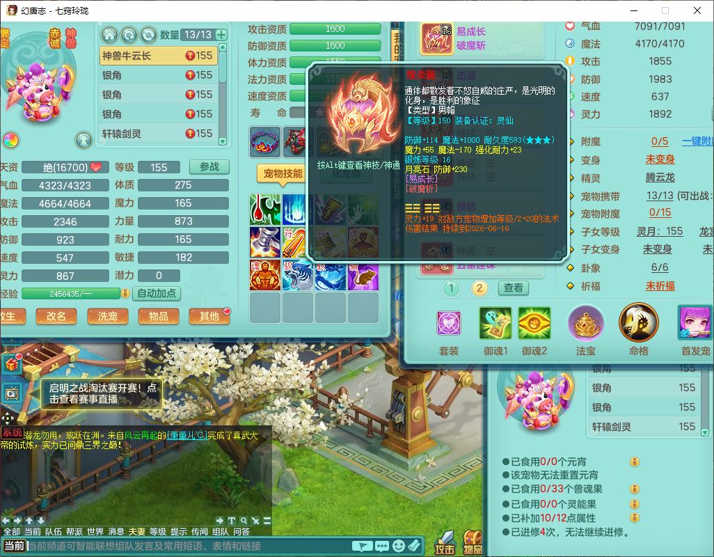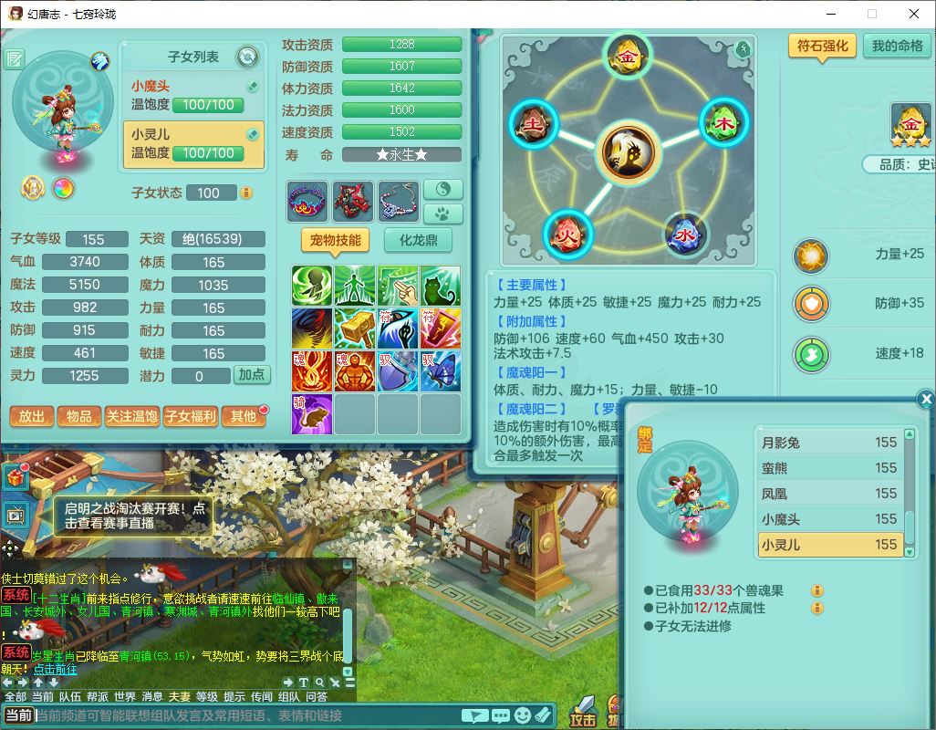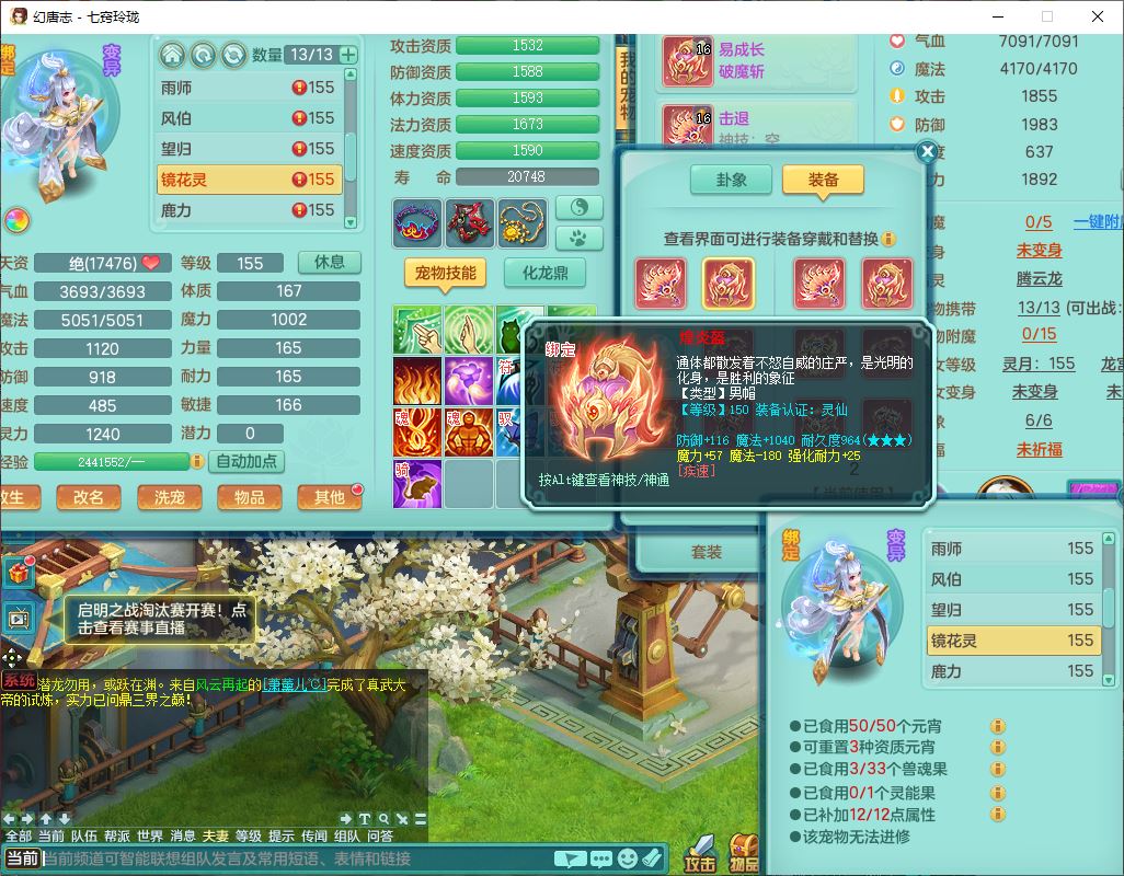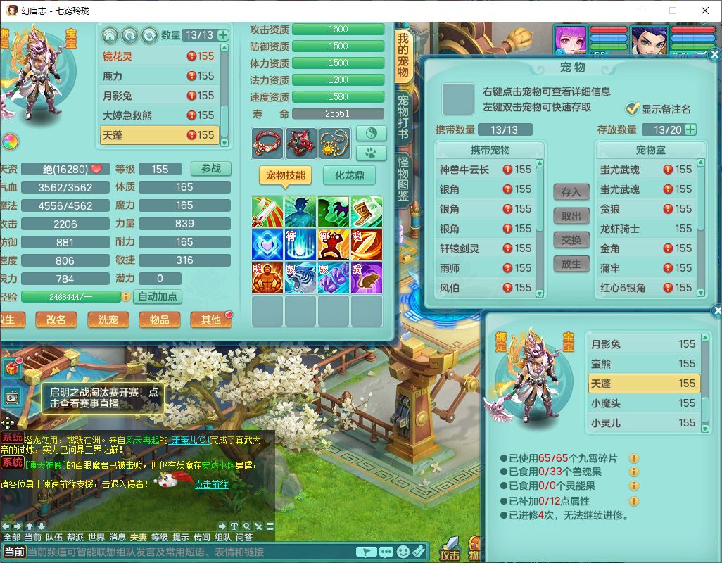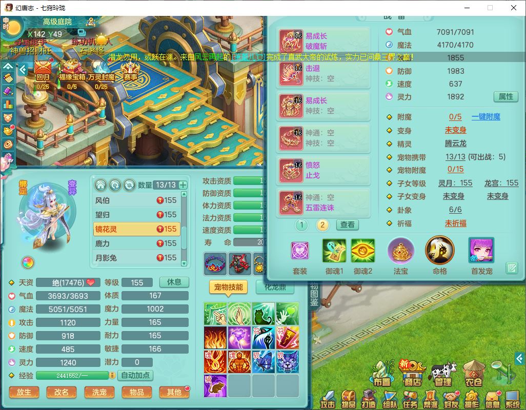24307七窍玲珑159男天宫精灵舞,1内5特殊(影袭、琴音,兽决登云、焚心、剑胆)1镜花,8只满果子,宝宝种类齐全,7红全单加装备,Y破魔帽子,愤怒止戈腰带,五雷鞋子,一套物理装备,狂暴破魔武器,神佑项链,鼎5.5,400多w神武币,2坐骑