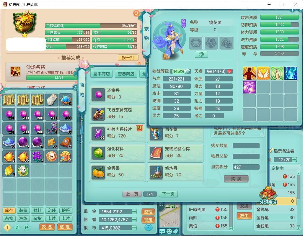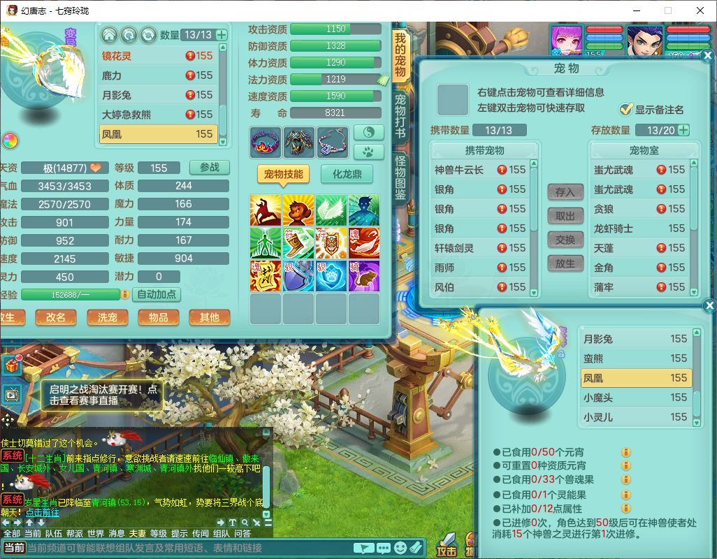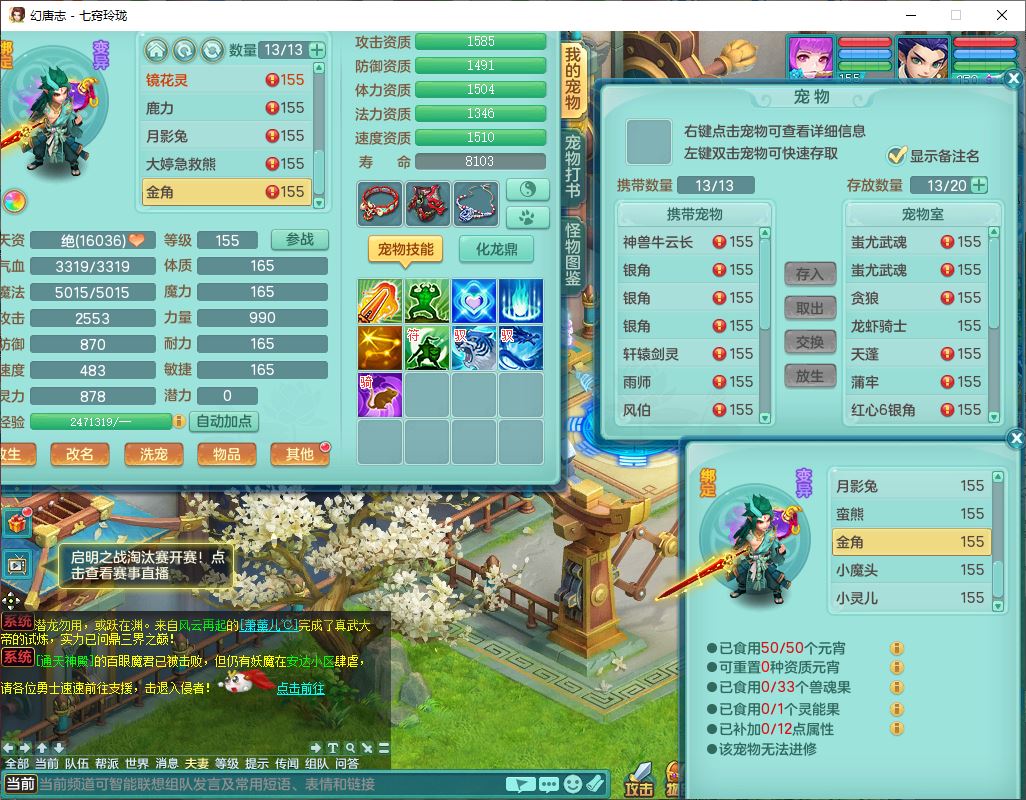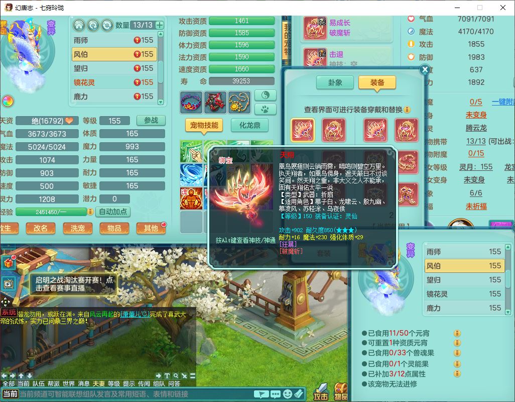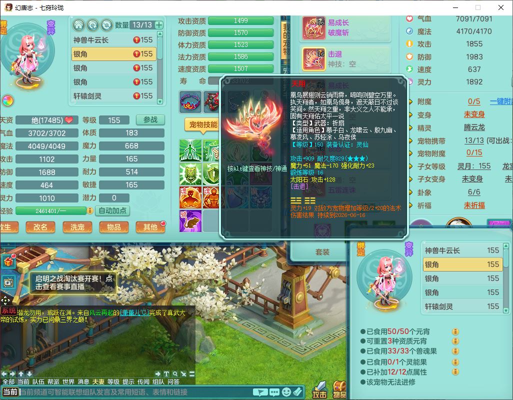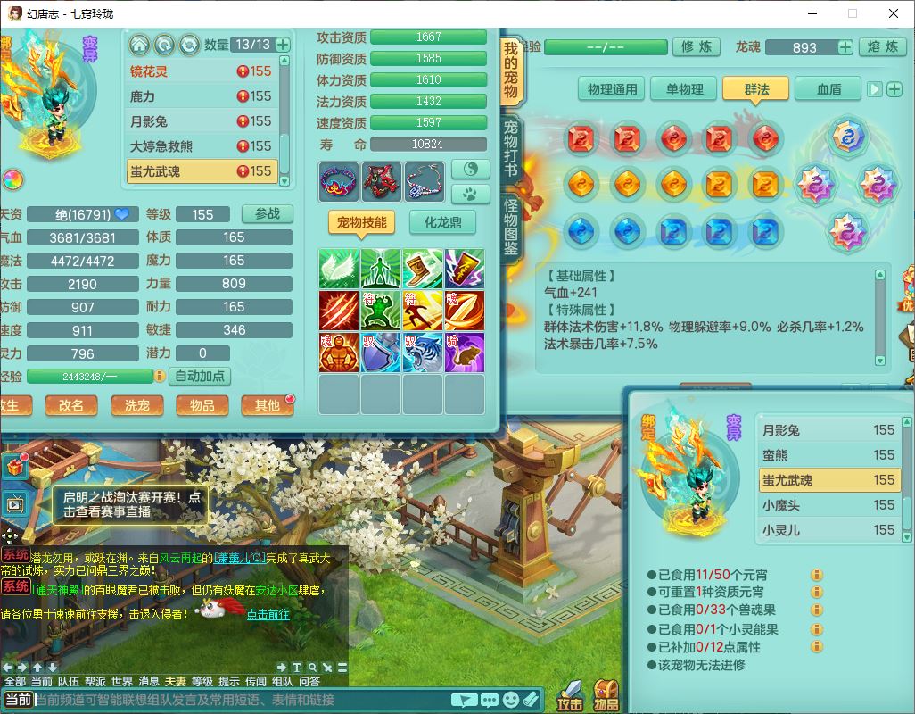 24307七窍玲珑159男天宫精灵舞,1内5特殊(影袭、琴音,兽决登云、焚心、剑胆)1镜花,8只满果子,宝宝种类齐全,7红全单加装备,Y破魔帽子,愤怒止戈腰带,五雷鞋子,一套物理装备,狂暴破魔武器,神佑项链,鼎5.5,400多w神武币,2坐骑