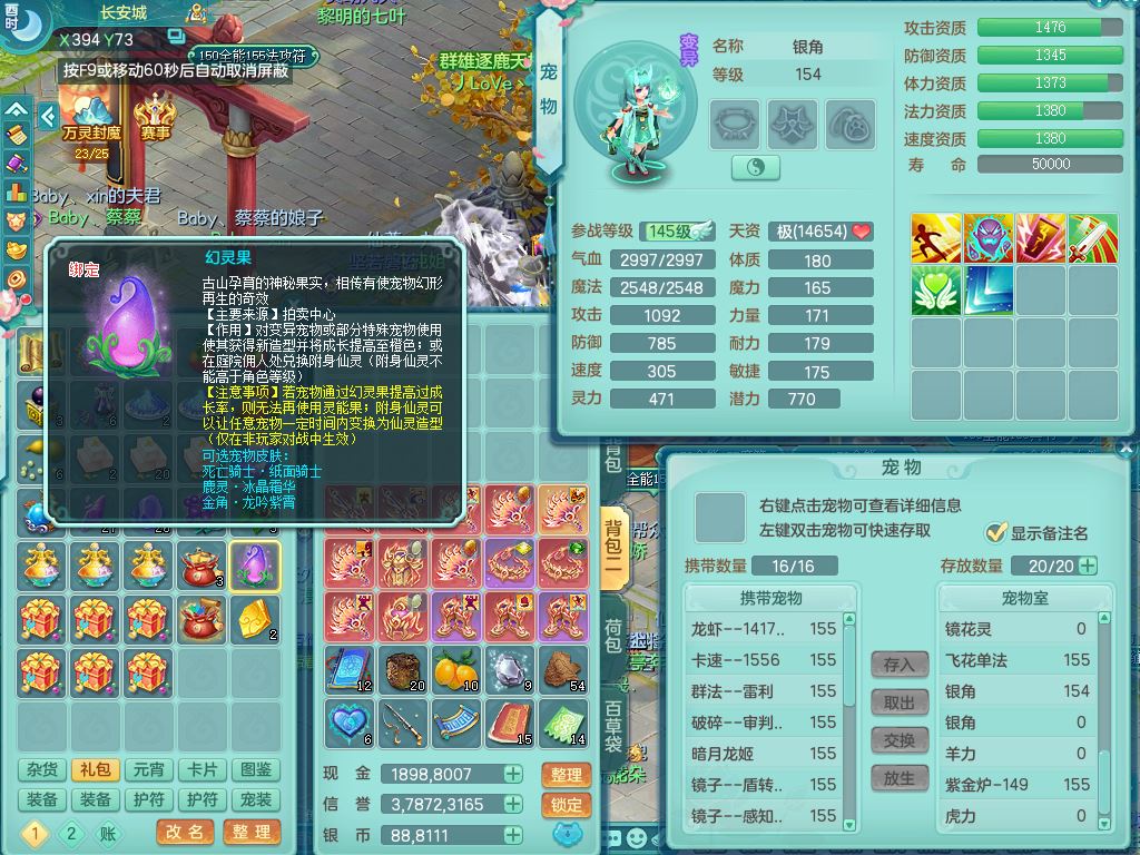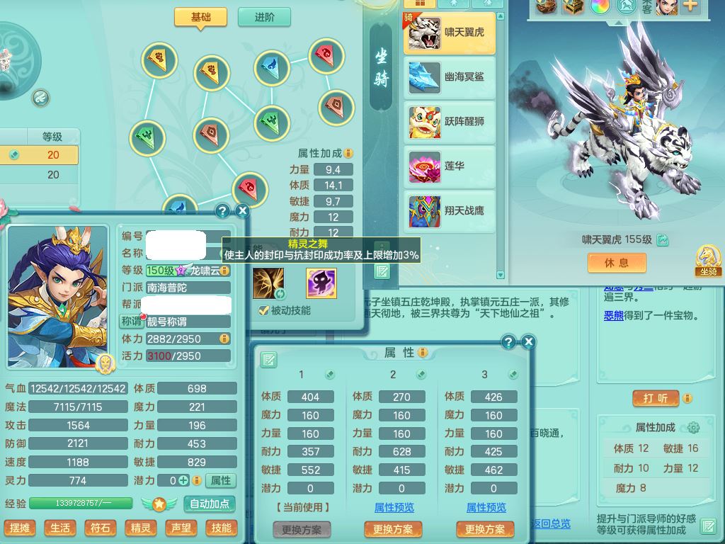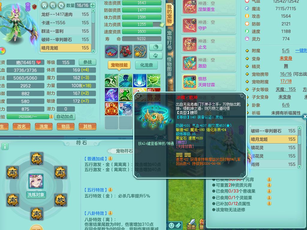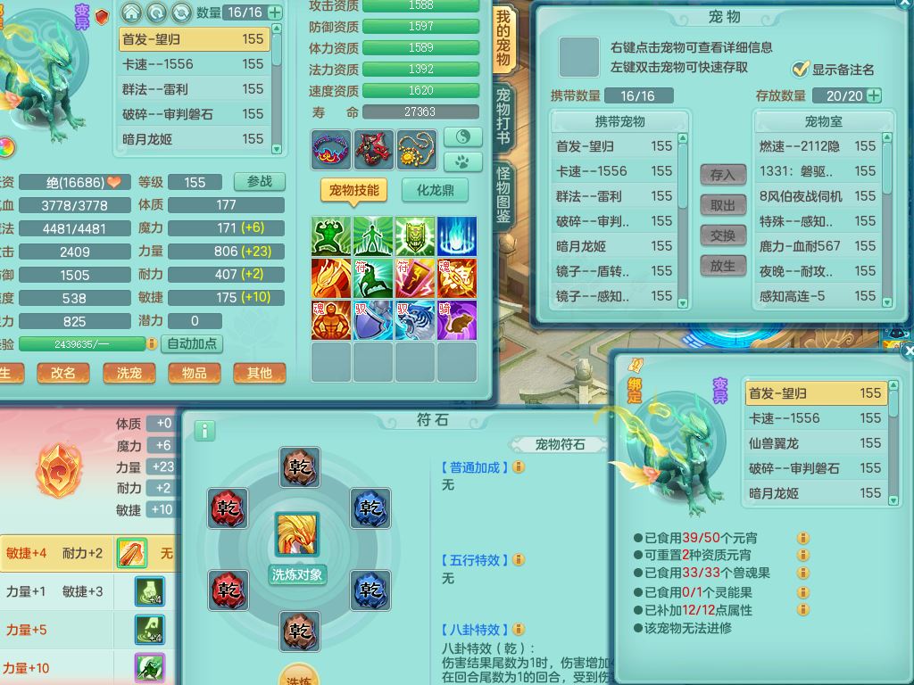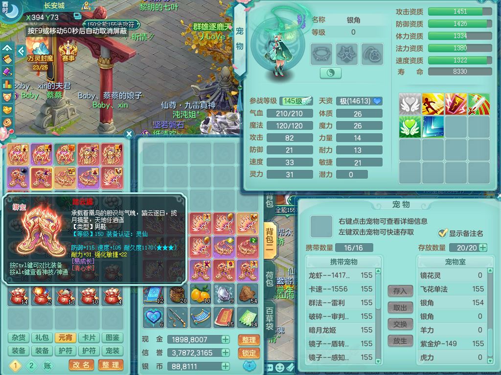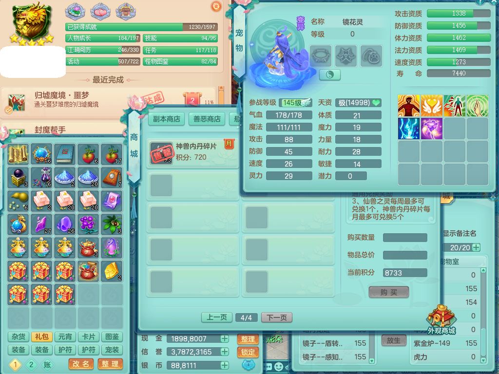 4370任剑逍遥159男普陀【潜龙过半】精灵舞,8字靓号,2内龙(换,1仙兽内丹)3内(1青蛇1龙马)3镜花1望归1特殊(禁锢、善恶,兽决琴音)4宠皮(1幻灵果),8觉醒8六字4五字9四字24只满果子,7红装备,愤怒四海腰带,鼎5.5+70+280,化龙鼎满足潜龙条件,2套符石,庭院163,房屋193,永久外观饰物、精灵皮肤,27内丹碎片,1168金币,3双人坐骑(1飞行)