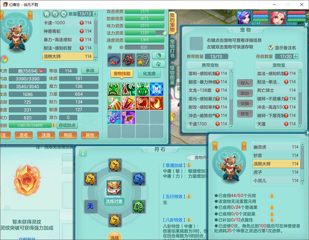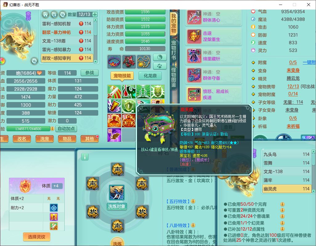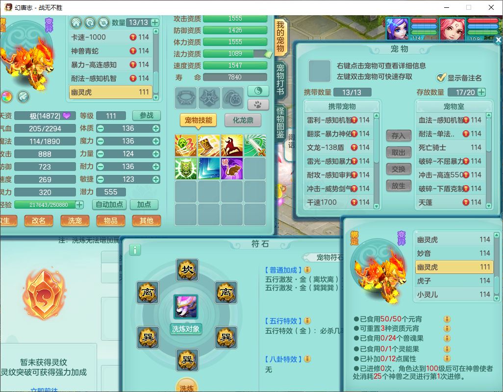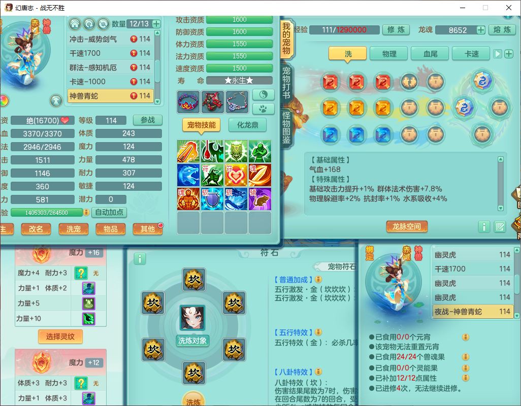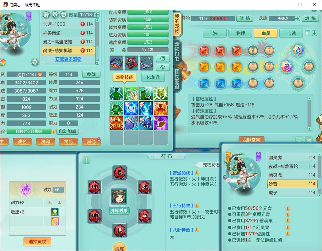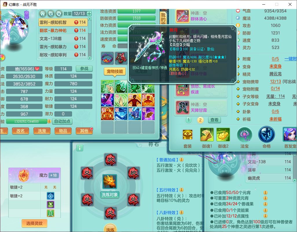 24305战无不胜109女方寸【潜龙过半】精灵舞,1内丹青蛇2羽袭1翻江1雷利8幽灵虎,4觉醒1宠皮3六字13四字(1洗练珠)13只满果子,9红全单加装备,击退慈航武器,愤怒Y疾速腰带,鼎2.5+42+168,100多w神武币,60个仙兽灵,1双人坐骑,带158奶粉