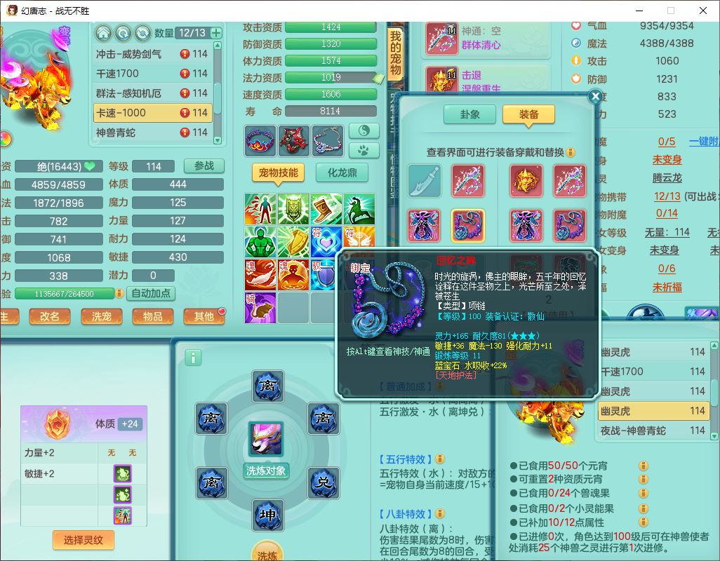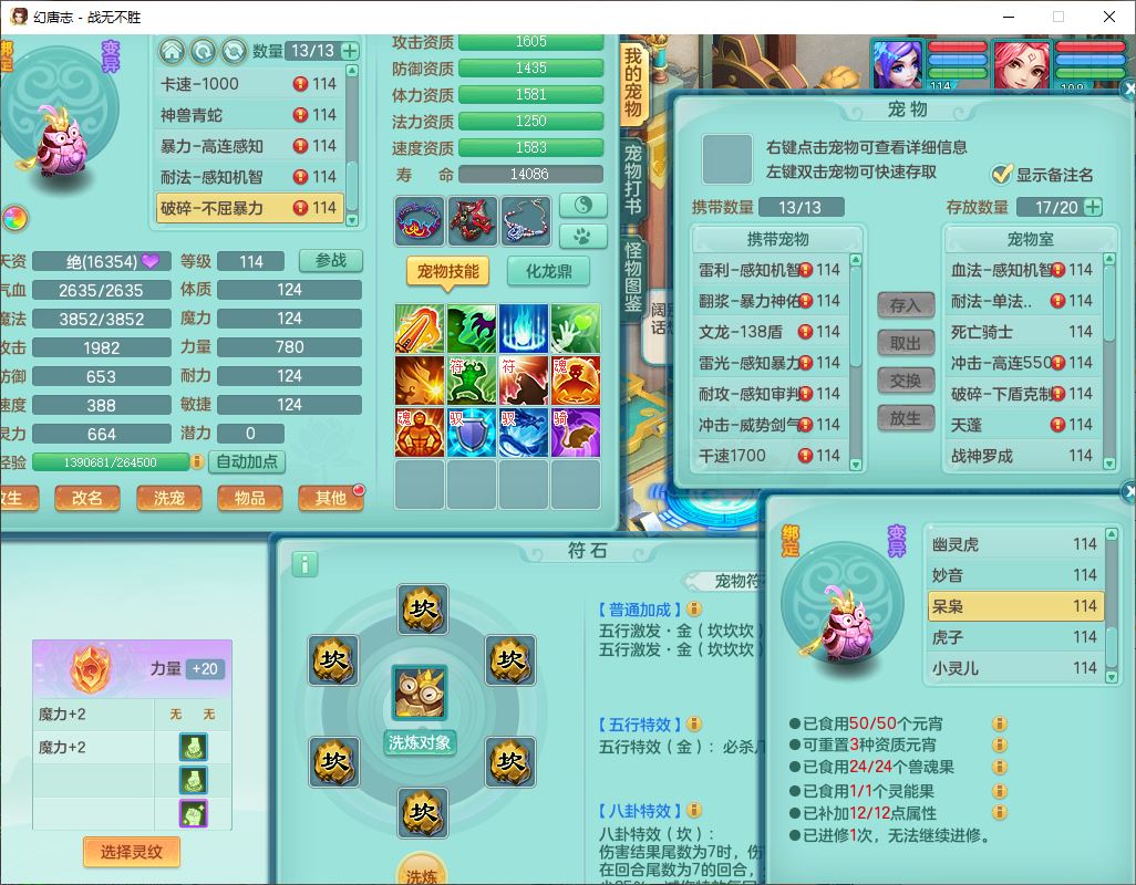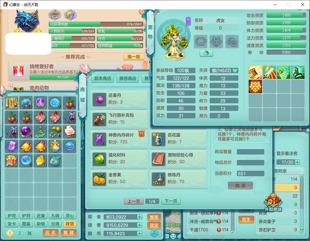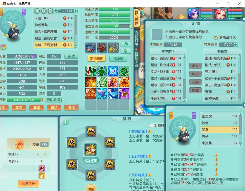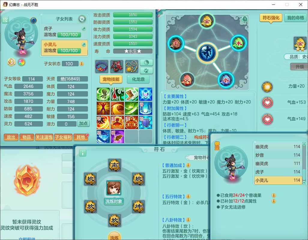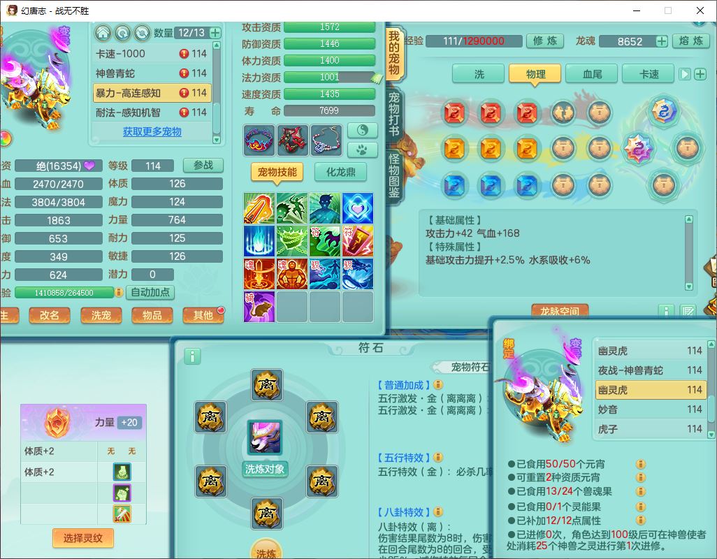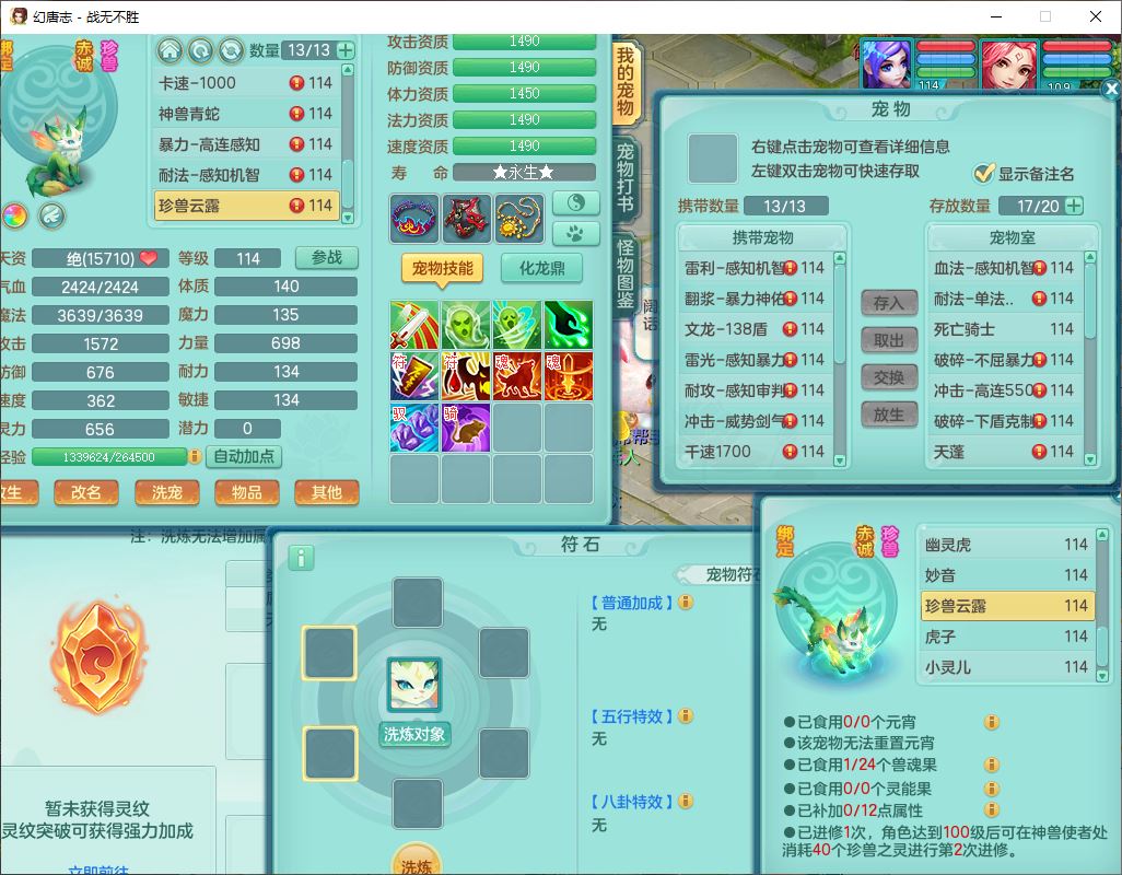 24305战无不胜109女方寸【潜龙过半】精灵舞,1内丹青蛇2羽袭1翻江1雷利8幽灵虎,4觉醒1宠皮3六字13四字(1洗练珠)13只满果子,9红全单加装备,击退慈航武器,愤怒Y疾速腰带,鼎2.5+42+168,100多w神武币,60个仙兽灵,1双人坐骑,带158奶粉
