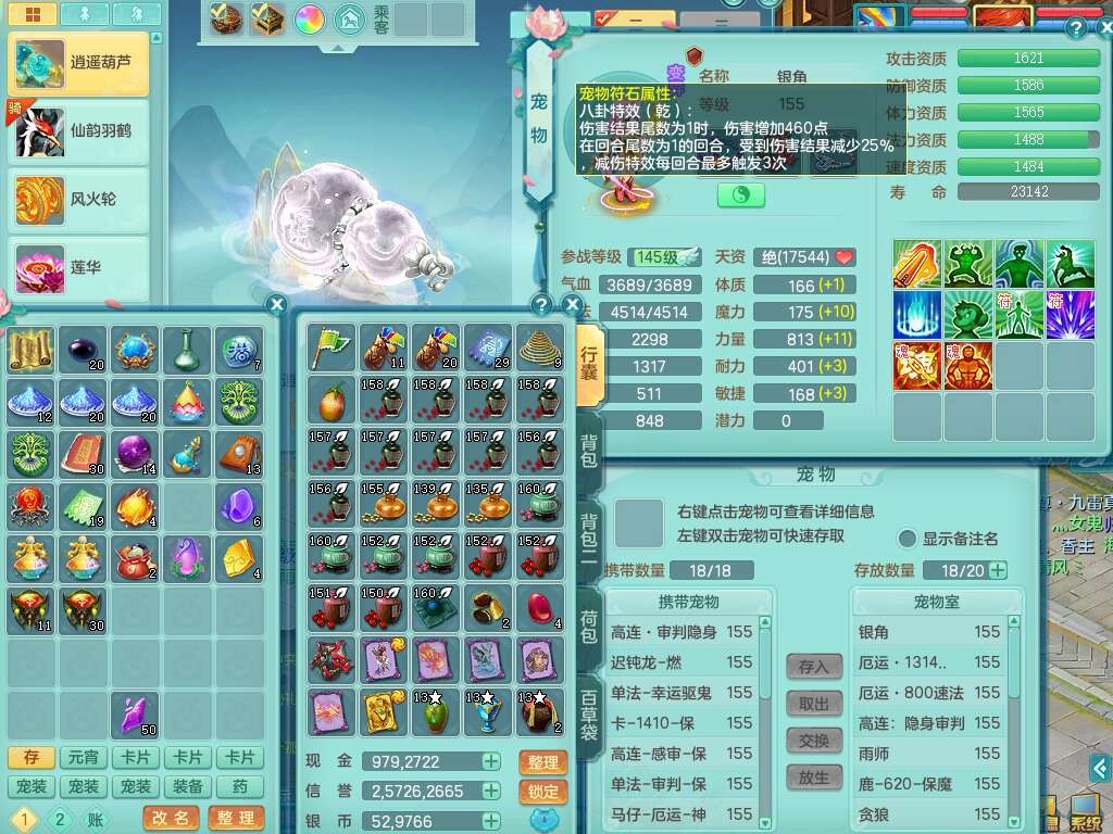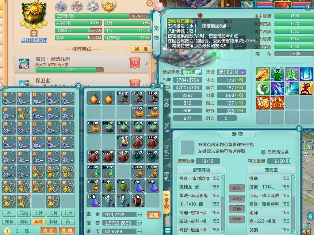 p22276九天揽月159男方寸,精灵舞,6龙2内胆神,4破镜,【12觉醒,已潜龙】,8位靓号AAAAAABB,9宠皮+1幻灵果,2特殊(上善,流星),5只六技能镜花灵,1只六技能龙姬,封锁四海单加52武器,三红易成长药王玉清链子,愤怒易成长单加50腰带,封系星辰之拥,法系易成长四海单加头,法爆单加武器,266易成长项链,五雷单加53鞋子,物理924易成长单加55武器,928狂暴武器,崩山衣服,神佑坚毅项链都有,破甲单加鞋,5.5基础鼎+70攻+280血,15个格子,14个纯六字,4个五字,26只满果子,宠排在榜,经验修炼成就在榜,永久称谓,双人坐骑,有3381金币,50个神兽内丹碎片,75天月卡。➕159女魔王,精灵歌,1神兽破镜,1只觉醒,1只六技能镜花灵,1只六技能龙姬,2特殊(焚心,烈焰),法爆单加52武器,易成长单加51衣服,275易成长单加50项链,愤怒五雷腰带,三红法缭幸运7四灵决鞋子,5.0基础鼎。