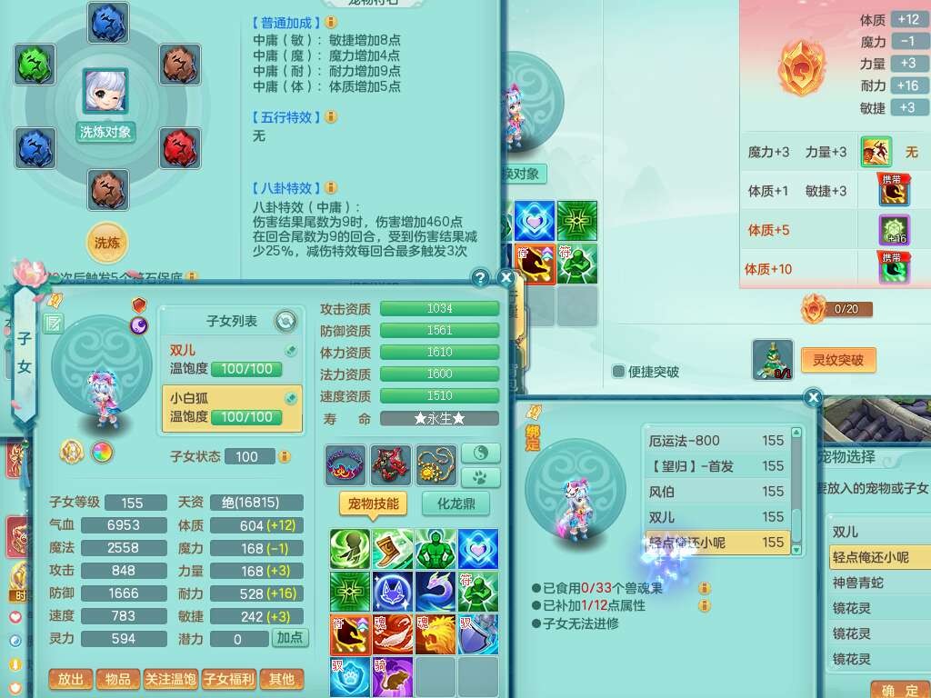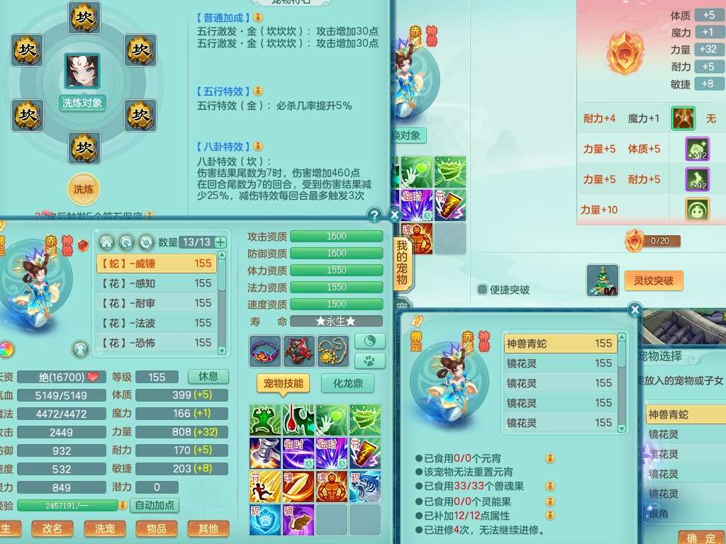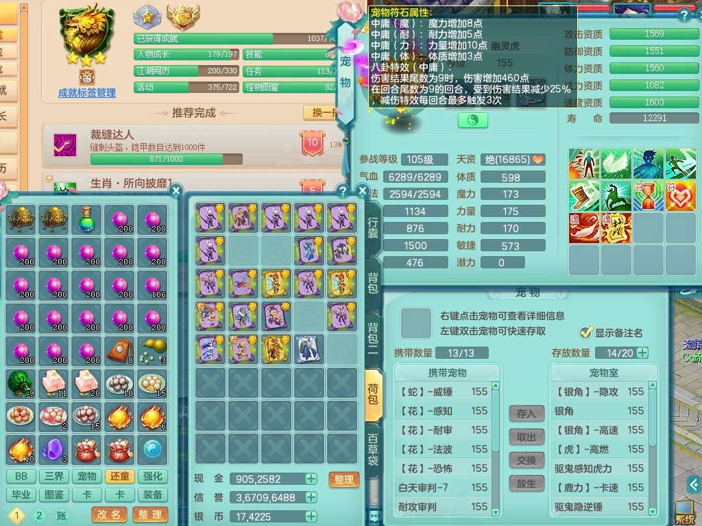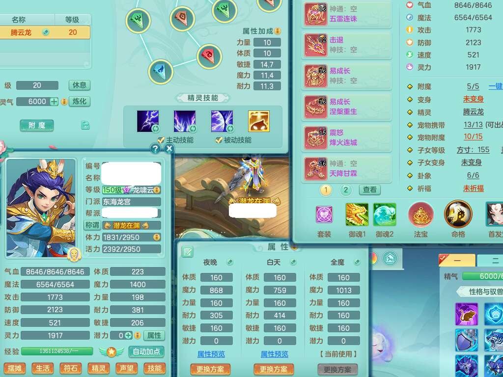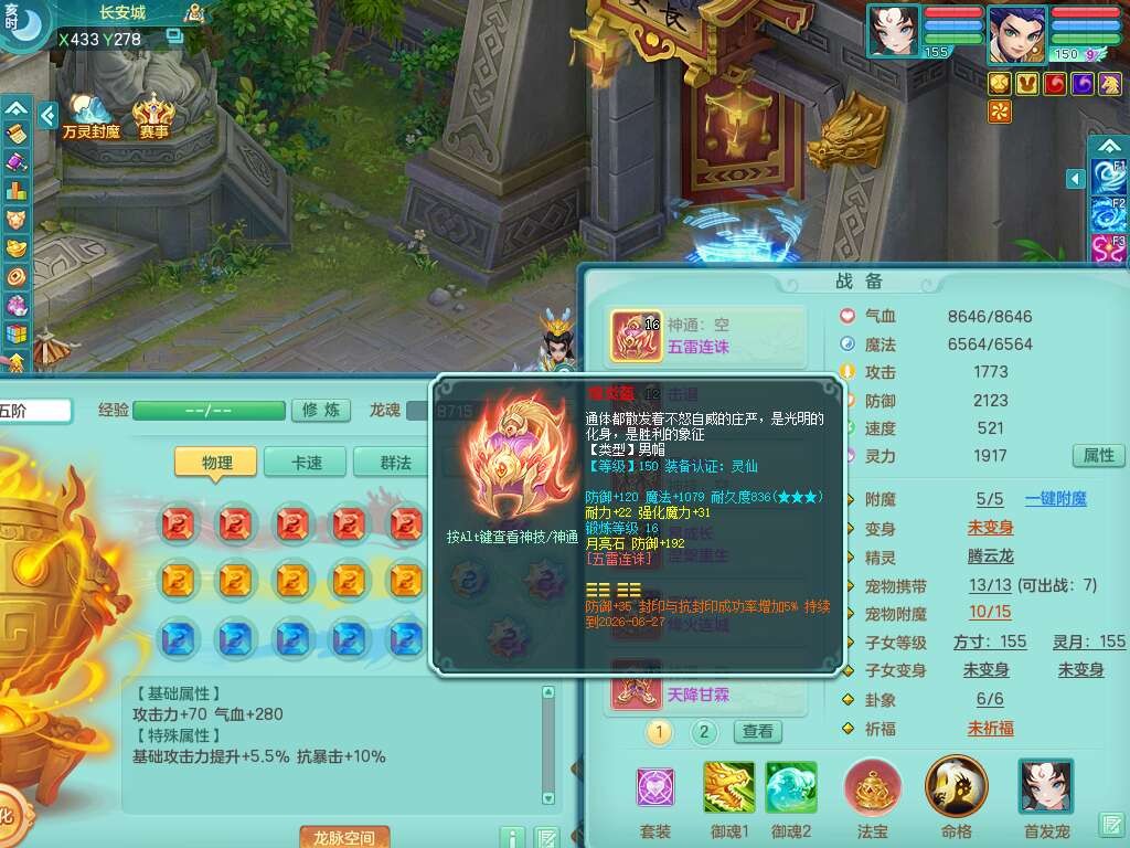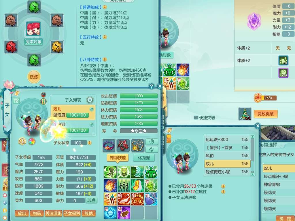 A22274七窍玲珑159男龙宫,精灵歌,1内胆神,【13觉醒,已潜龙】,3特殊(羽袭,琴音,上善),4只六技能镜花灵,五雷头,击退单加54武器,易成长单加50衣服,271易成长慈航链子,震怒烽火单加57腰带,5.5基础鼎+70攻+280血,7个纯六字,1个五字,13只满果子,宠排在榜,有63个神兽内丹碎片。➕159女灵月山奶粉,双红躲避玉清单加衣服,双红愤怒烽火腰带,六特,4.5基础鼎。