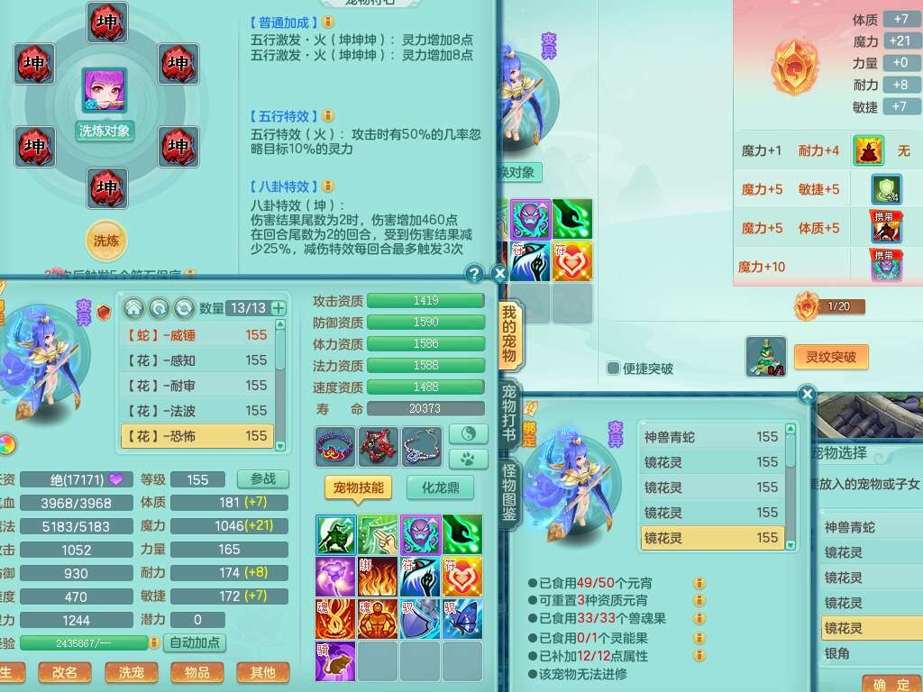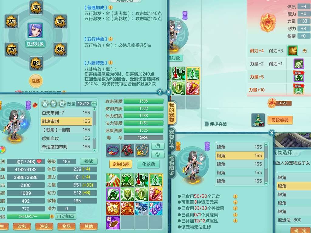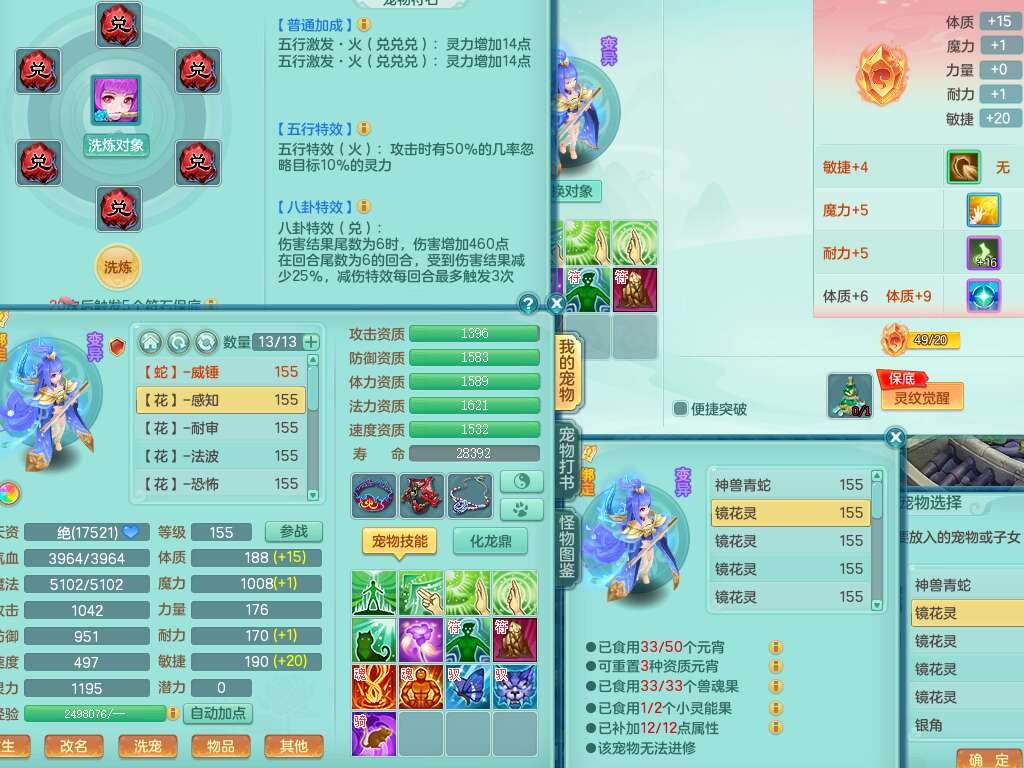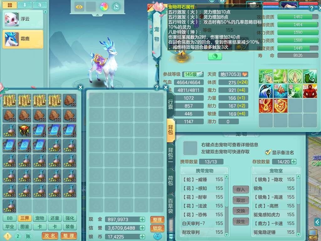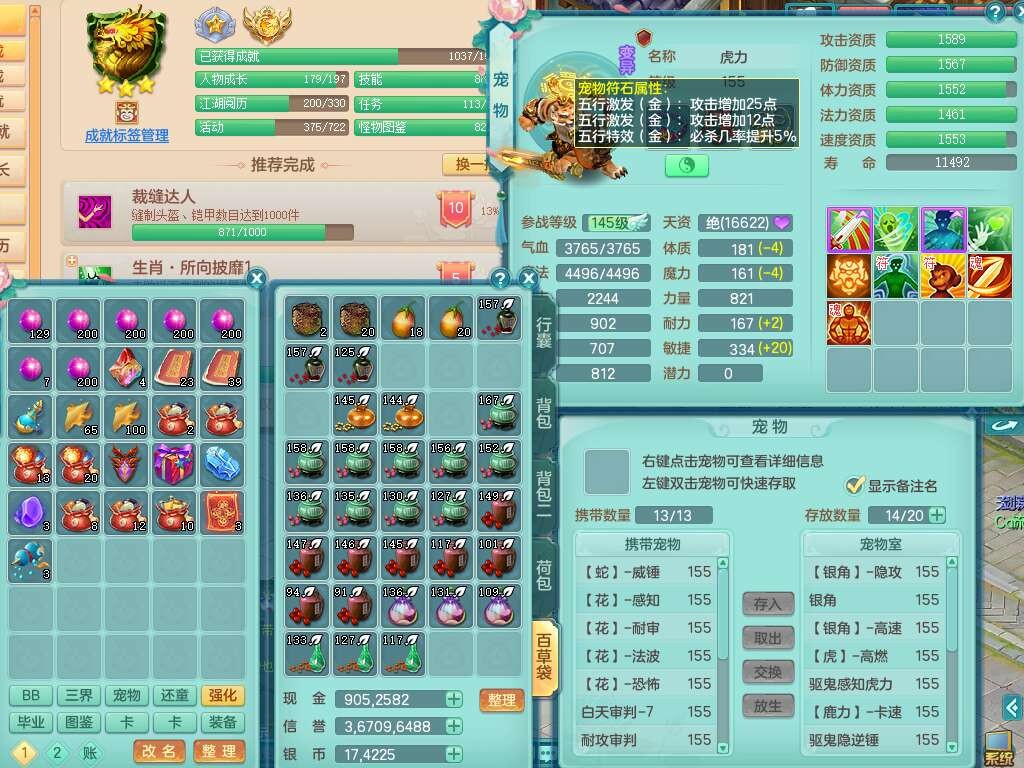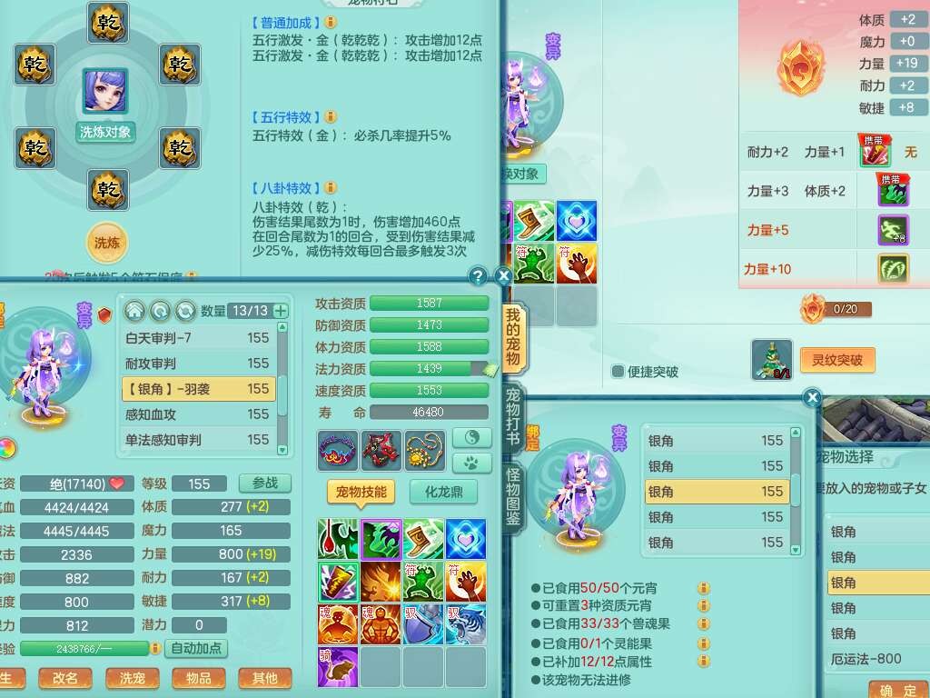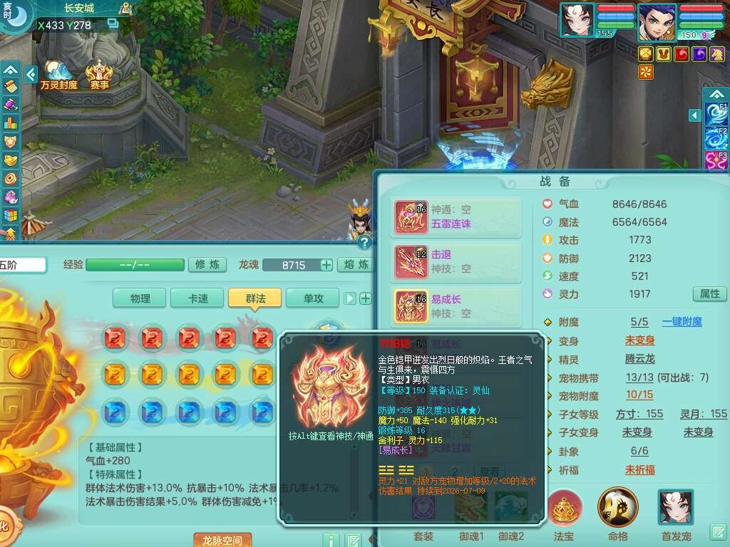 A22274七窍玲珑159男龙宫,精灵歌,1内胆神,【13觉醒,已潜龙】,3特殊(羽袭,琴音,上善),4只六技能镜花灵,五雷头,击退单加54武器,易成长单加50衣服,271易成长慈航链子,震怒烽火单加57腰带,5.5基础鼎+70攻+280血,7个纯六字,1个五字,13只满果子,宠排在榜,有63个神兽内丹碎片。➕159女灵月山奶粉,双红躲避玉清单加衣服,双红愤怒烽火腰带,六特,4.5基础鼎。