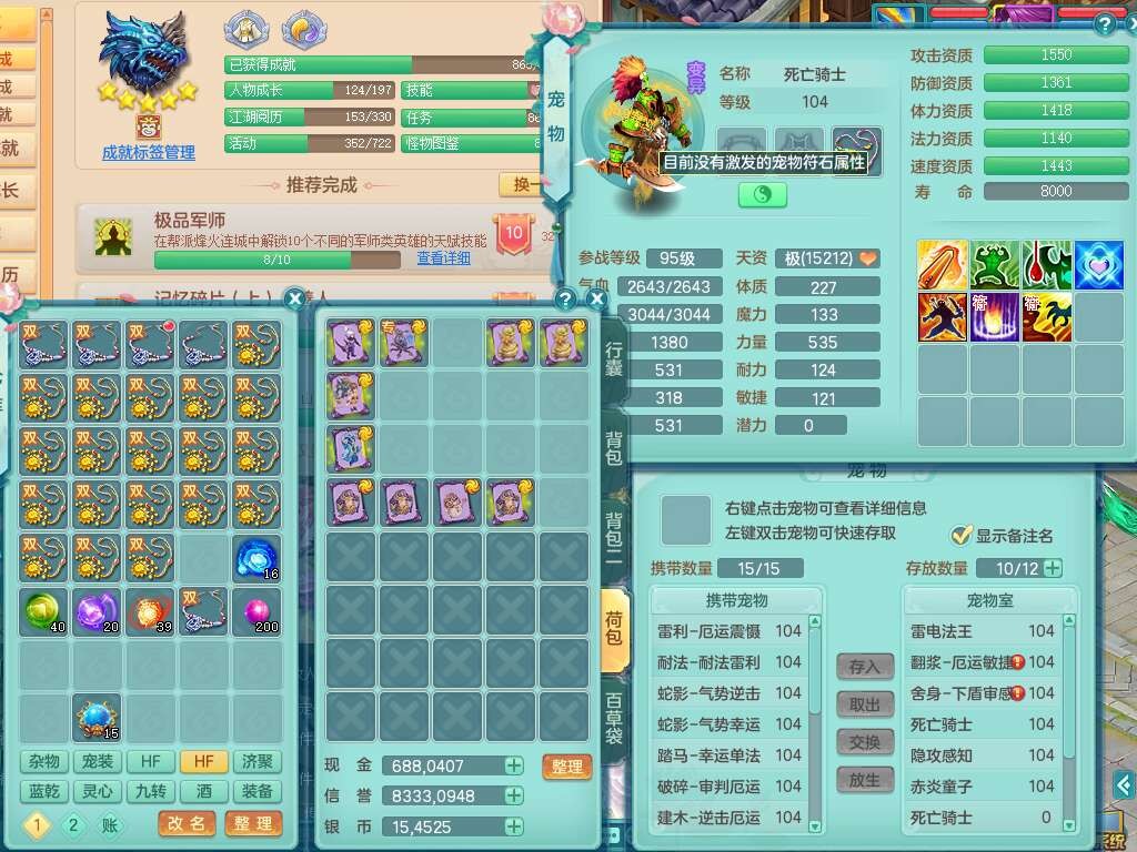 p22272,2024区99男无名谷,2龙4内胆神,3破镜,10觉醒,4宠皮,易成长单加32头,556易成长武器,神佑破血链子,崩山单加34腰带,易成长单加34鞋子,3个纯六字,1个五字,16只满果子,宠排在榜,双人坐骑,西瓜冰武器,81天月卡。