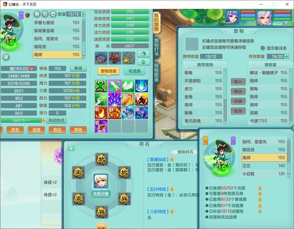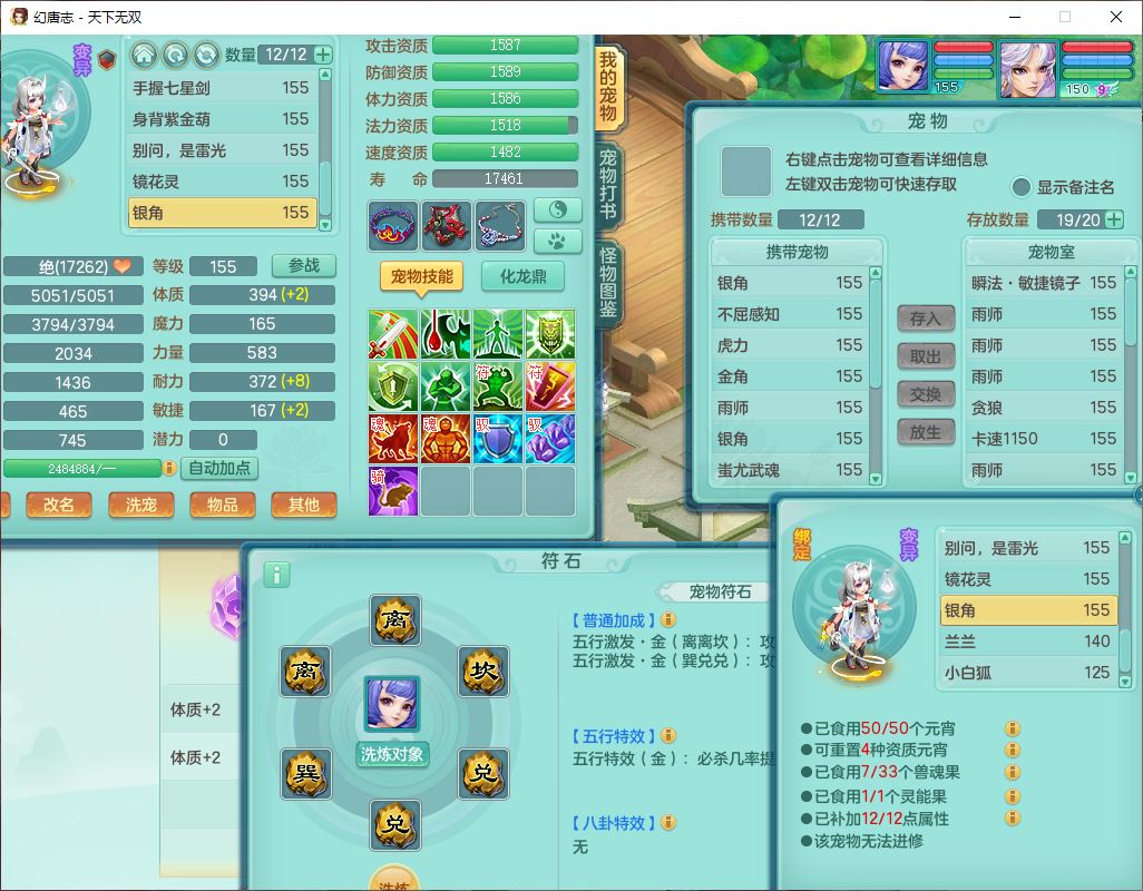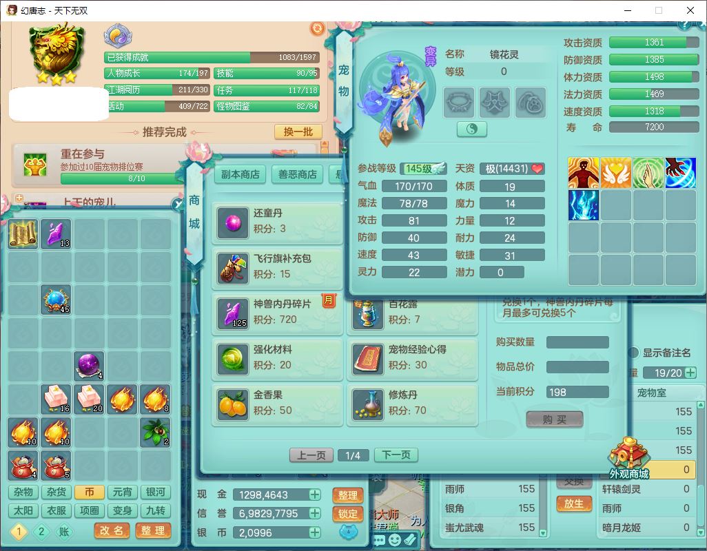 tx10387天下无双159男万兽精灵歌,3镜花1特殊(雷光)3金角,4觉醒7四字综合8只满果子,全单加9红装备,Y罗汉帽子,934必杀武器,崩山衣服,震怒Y罗汉腰带,鼎5.0,永久头饰、精灵皮肤,45个仙兽灵,13个内丹碎片,1双人飞行坐骑