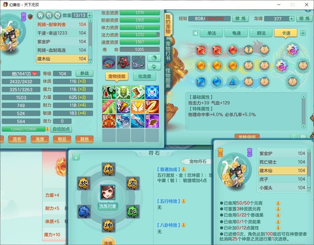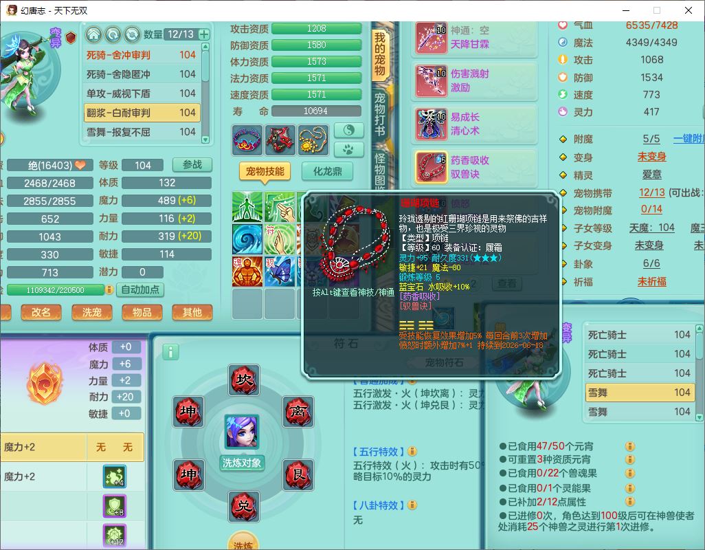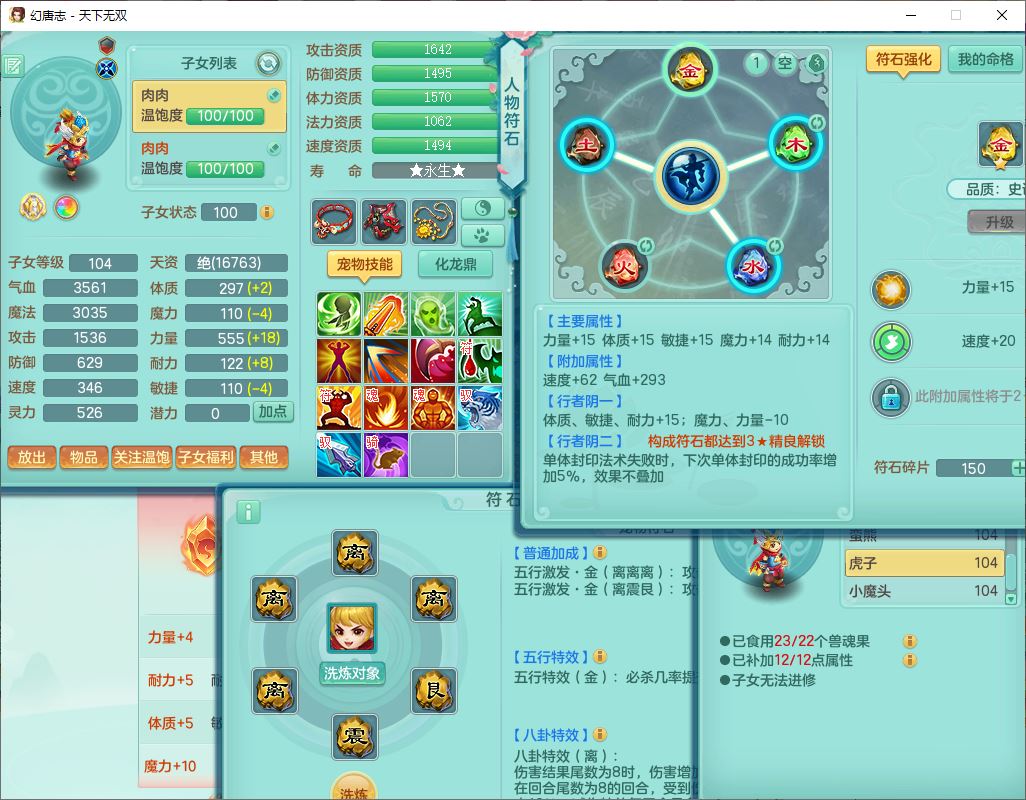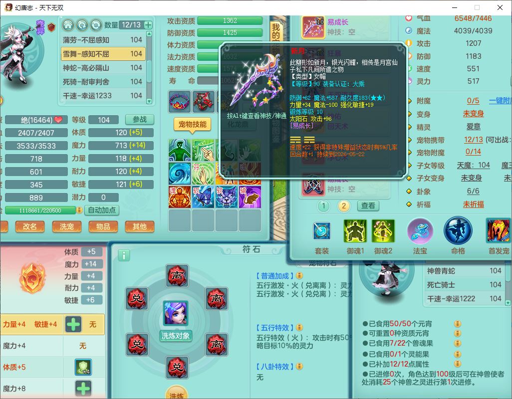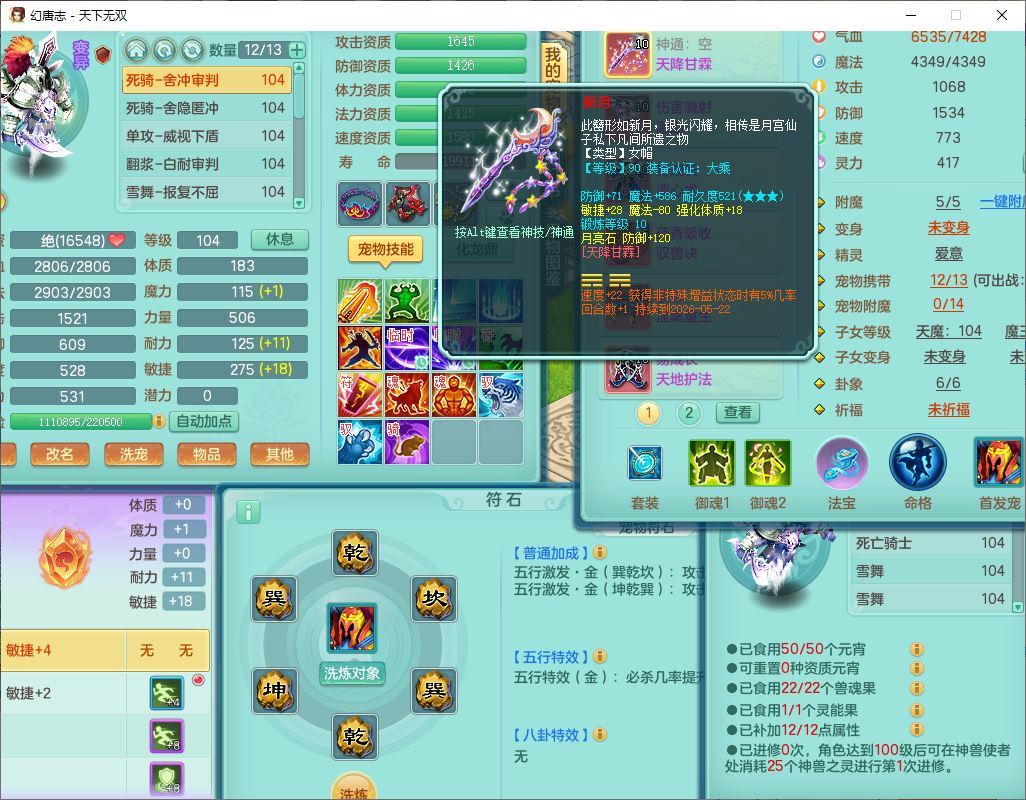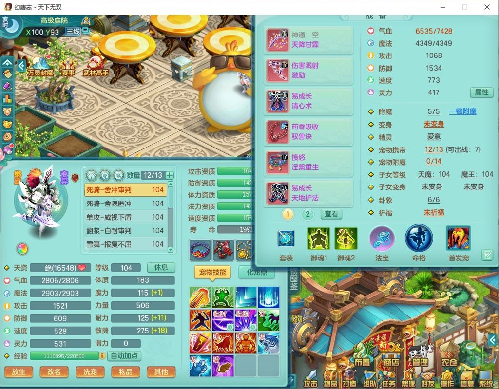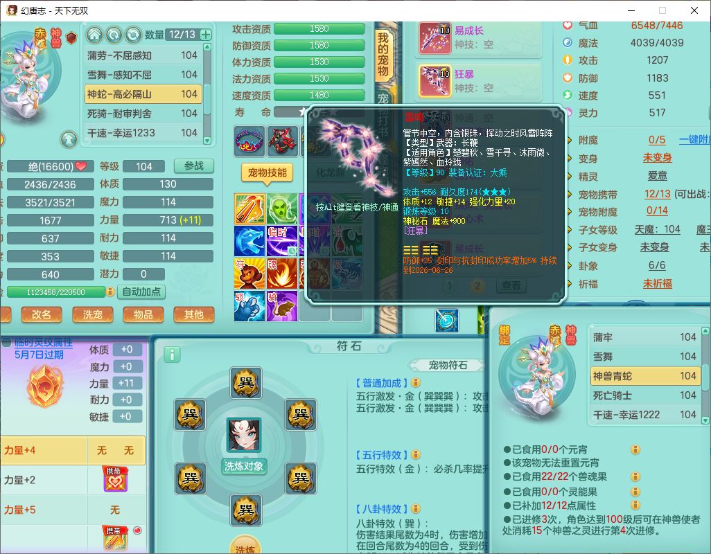 tx10396天下无双99女无量体敏耐、力敏双精灵,1内丹青蛇3翻江3舍身1金炉1建木1童子胚子,2六字2四字综合9只满果子,11红装备,伤害溅射激励武器,Y水清衣服,药香驭兽项链,愤怒慈航,Y罗汉鞋子,一套9红物理装,狂暴武器,神佑回天项链,指挥Y净心腰带,2套符石,庭院150房屋146,永久外观、精灵皮肤,21个内丹碎片,1双人飞行坐骑