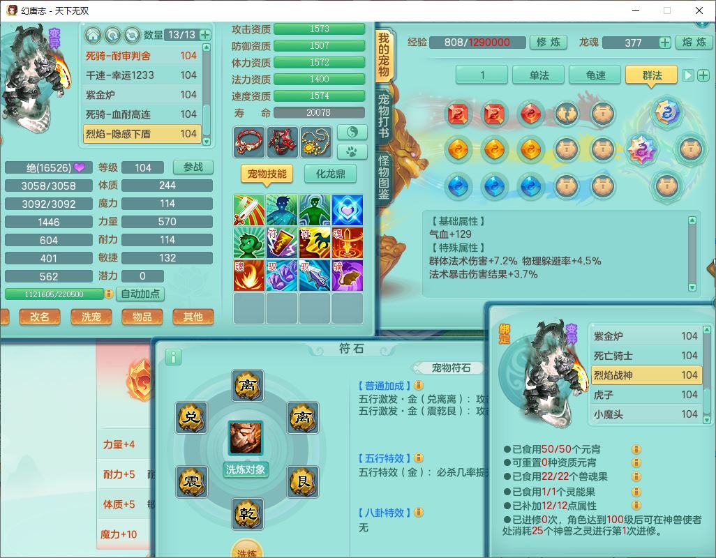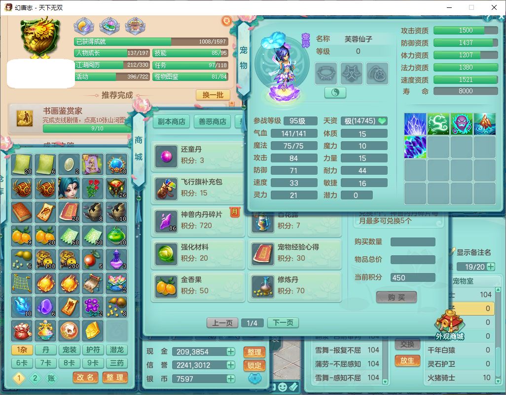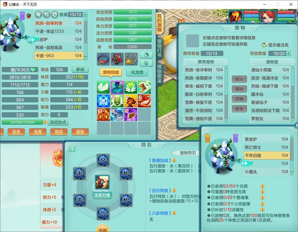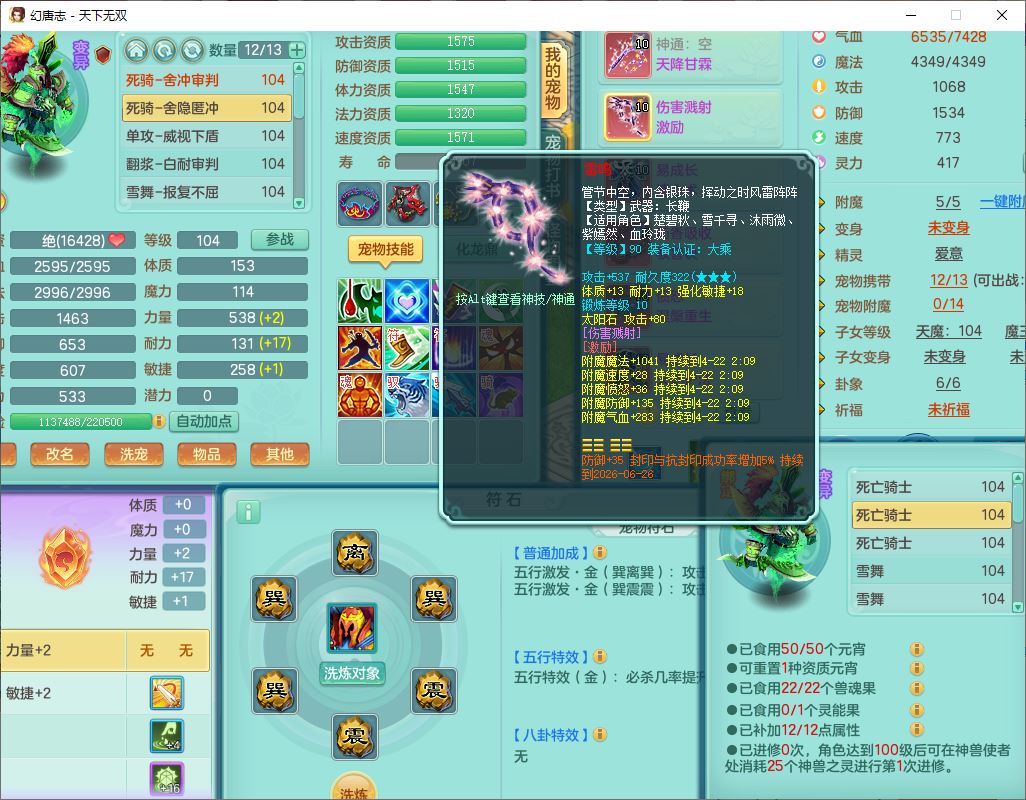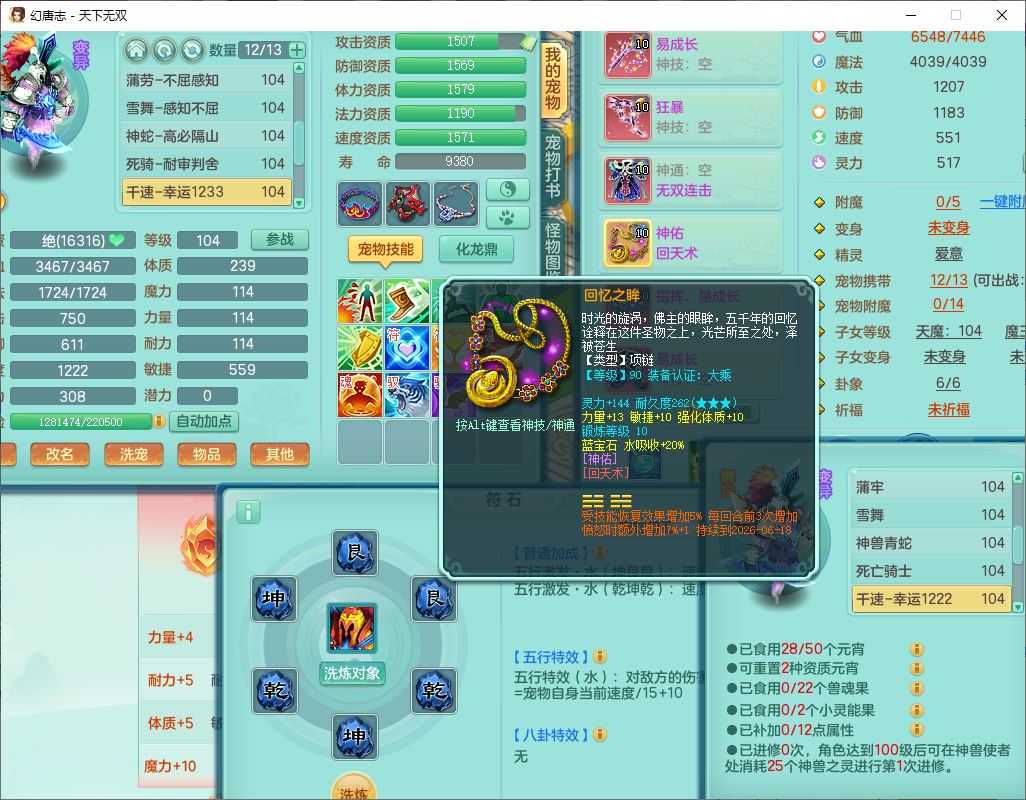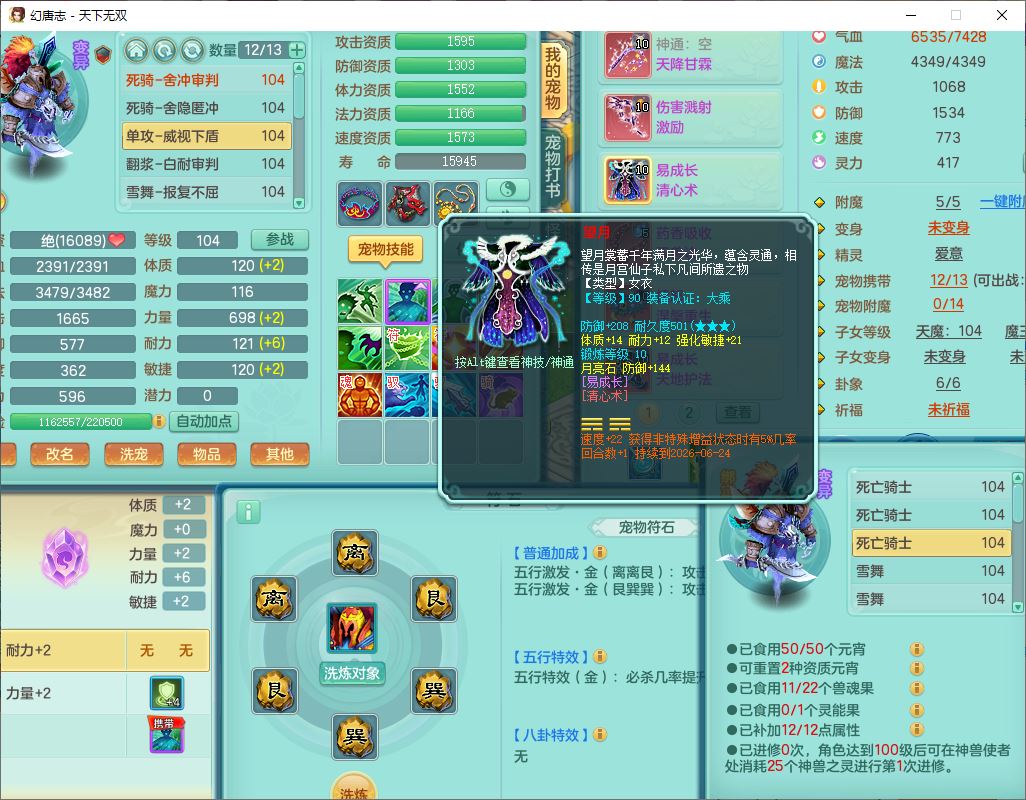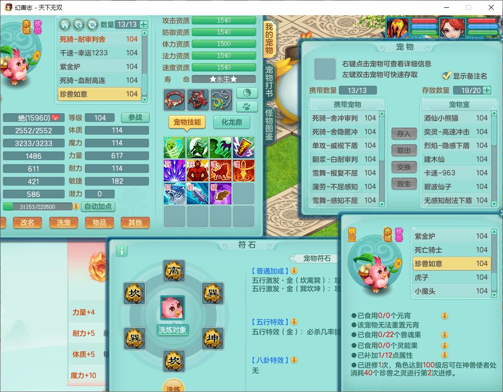 tx10396天下无双99女无量体敏耐、力敏双精灵,1内丹青蛇3翻江3舍身1金炉1建木1童子胚子,2六字2四字综合9只满果子,11红装备,伤害溅射激励武器,Y水清衣服,药香驭兽项链,愤怒慈航,Y罗汉鞋子,一套9红物理装,狂暴武器,神佑回天项链,指挥Y净心腰带,2套符石,庭院150房屋146,永久外观、精灵皮肤,21个内丹碎片,1双人飞行坐骑