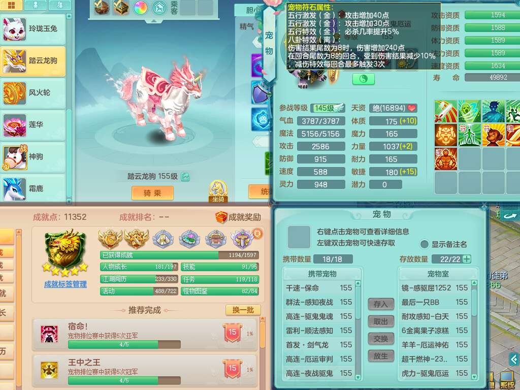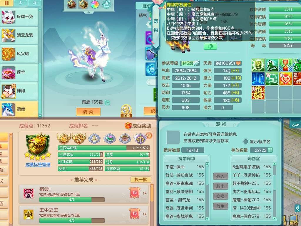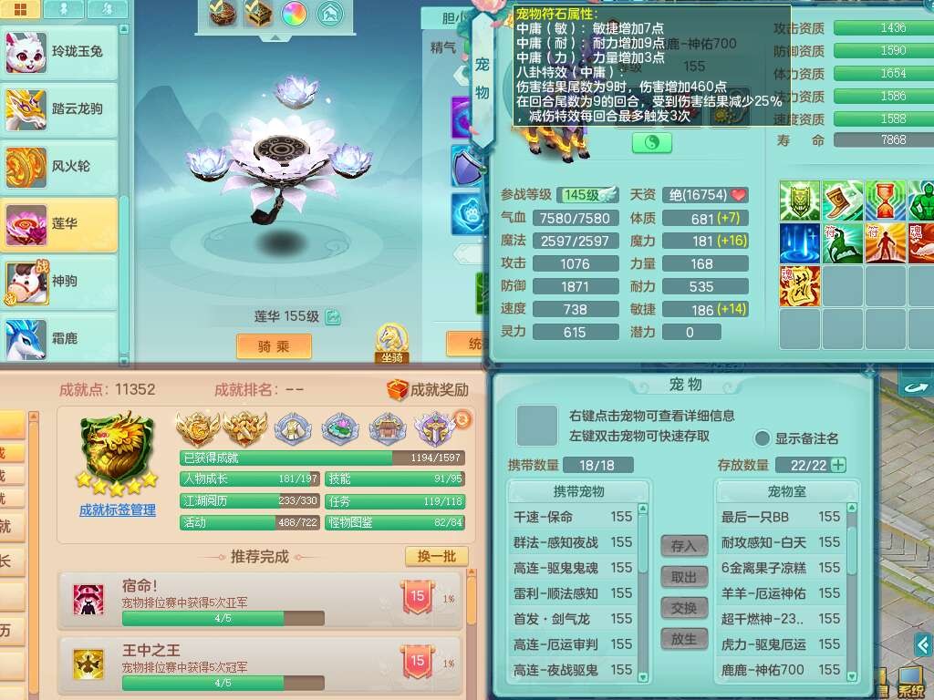 J22290任剑逍遥159男地府,精灵歌+舞,8龙4内胆神(3马1蛇),8破镜,【18只觉醒,已潜龙】,4位靓号不含4,1宠皮,1特殊(上善),5只六技能镜花灵,1只六技能龙姬,冷却罗汉头,格挡守护衣服,愤怒幸运4单加52腰带,易成长四海单加50鞋子,易成长玉清单加52武器,有回春清心术武器,封锁武器,法系双法缭,法缭单加衣服,法缭移魂单加鞋子,五雷单加53头,266易成长单加50项链,914法爆单加51武器,物理双破甲,破甲单加头,破甲鞋子,崩山衣服,神佑止戈项链,坚毅单加55项链,超多双红装备,5.5基础鼎+70攻+280血,15个永久格子,23个纯六字,1个五字,30+只满果子,宠排在榜,经验在榜,永久称谓,仓库42神兽内胆碎片,11个坐骑,暴龙泰坦+神驹心想事成+火焰之力+西瓜冰,冰晶庭院。