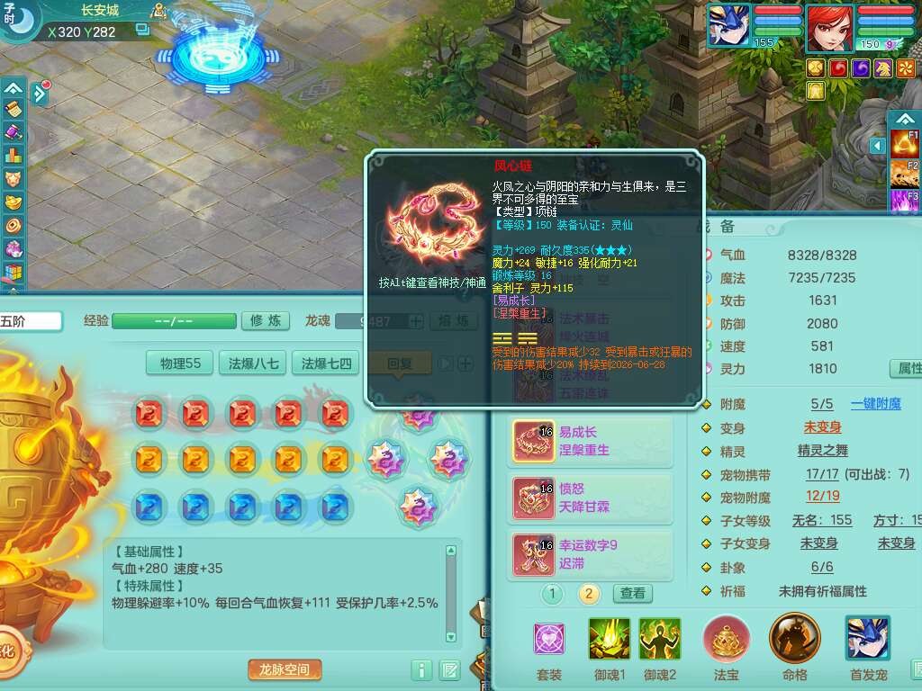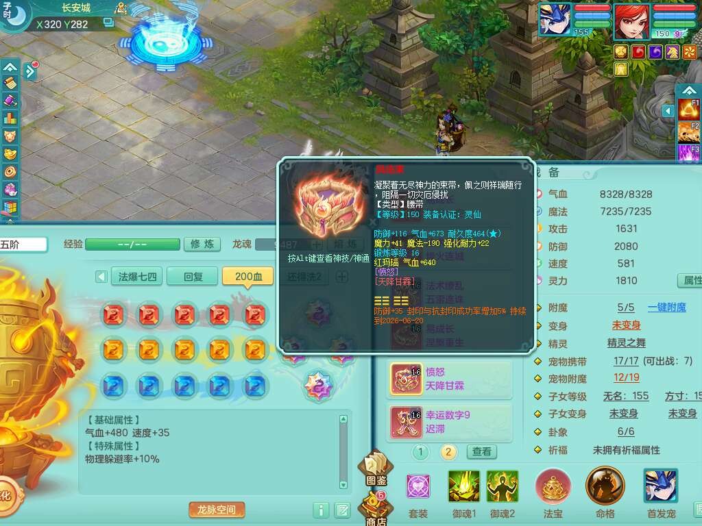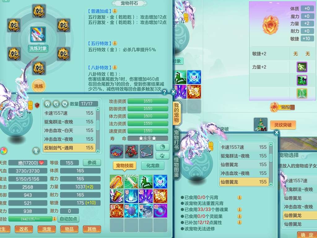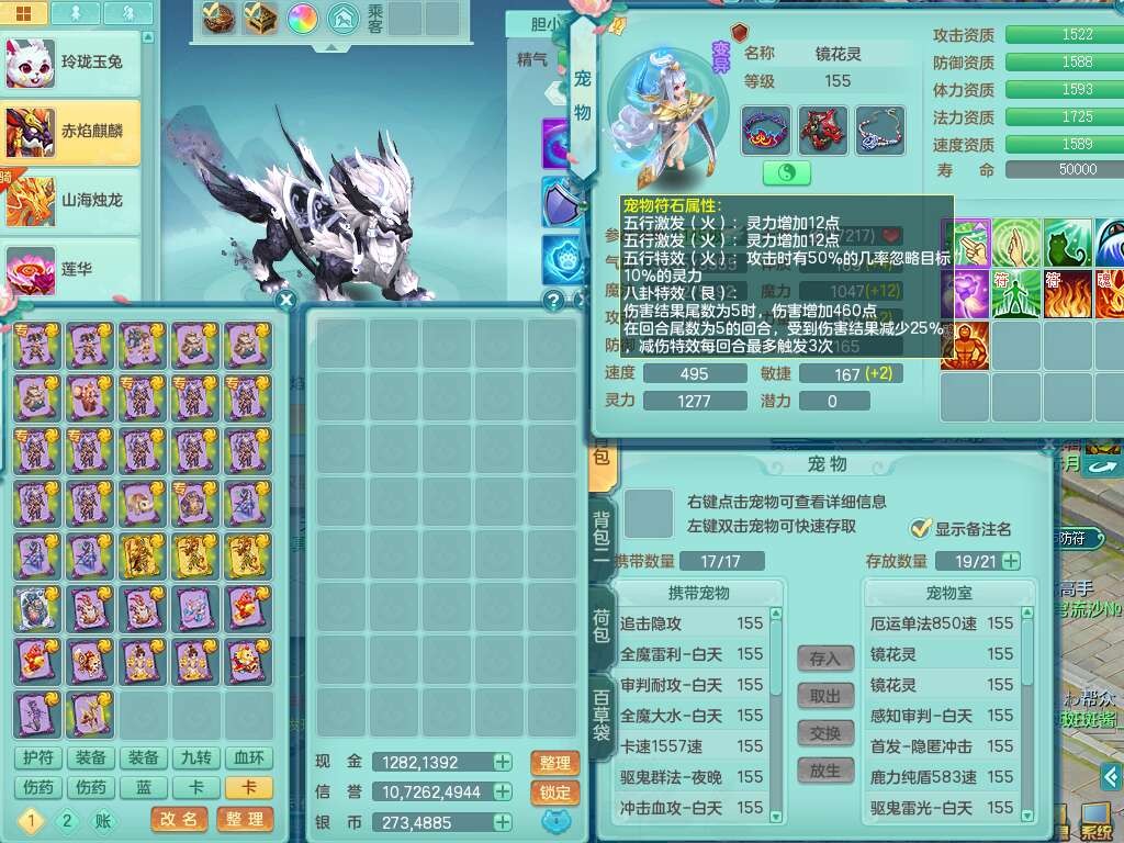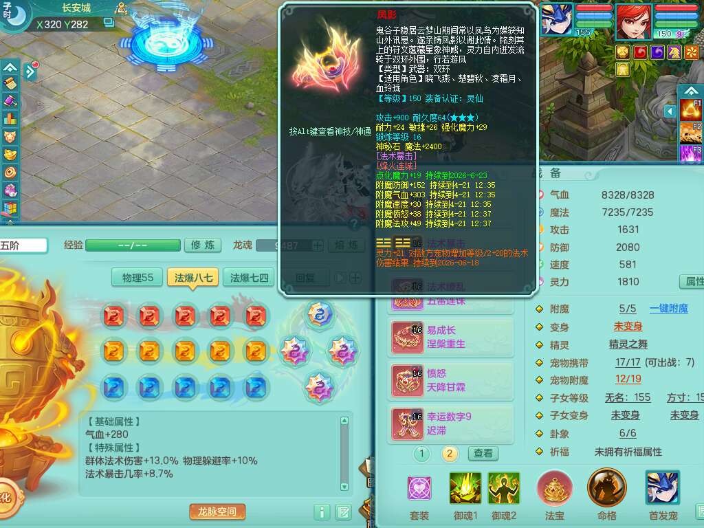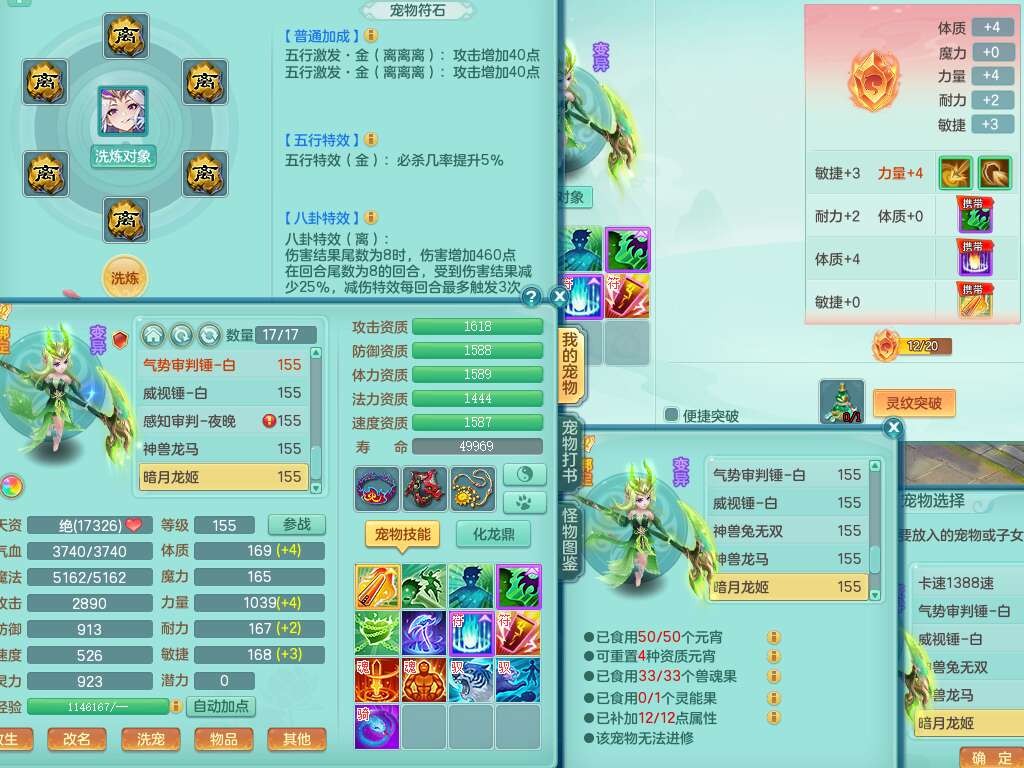 S22289风华绝代159女魔王,精灵舞,12龙4内胆神,1破镜,【16只觉醒,已潜龙】,4位靓号不含4,2宠皮,4特殊(夺命,祈雨,藕断,烈焰),2只六技能镜花灵,1只六技能龙姬,法爆烽火武器,法缭五雷衣服,269易成长慈航项链,愤怒四海单加腰带,法系星辰之拥,5.5基础鼎+70攻+280血,物理躲避10%,法爆8.7%,15个永久格子,24个纯六字,1个五字,27只满果子,宠排在榜,永久称谓,4个坐骑,带273万神武币。带157男方寸奶粉,精灵舞。
