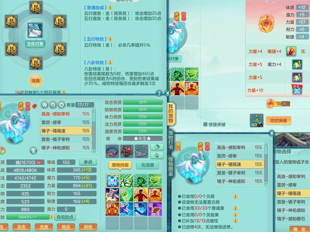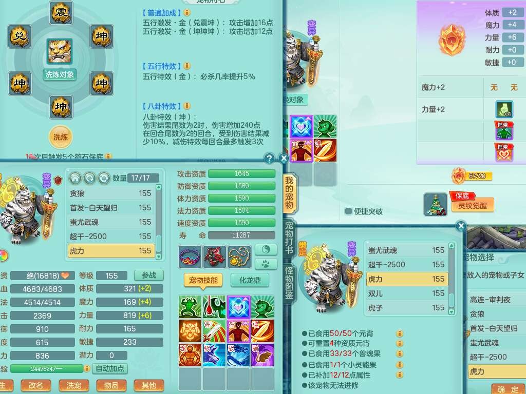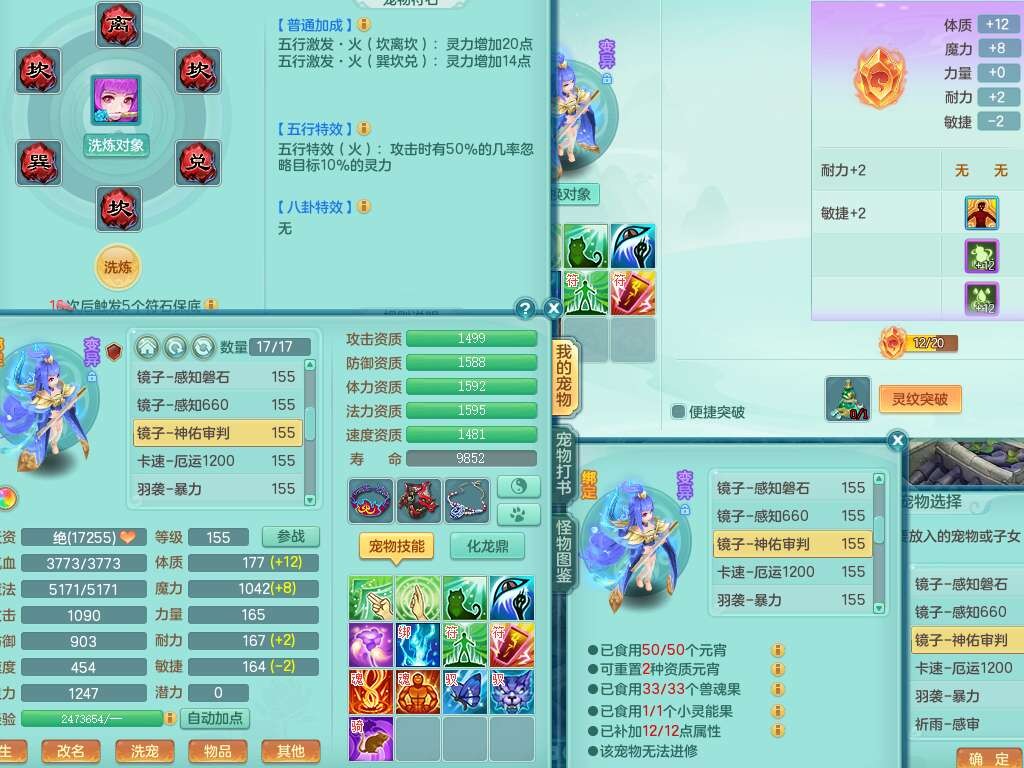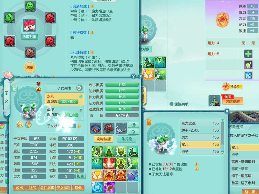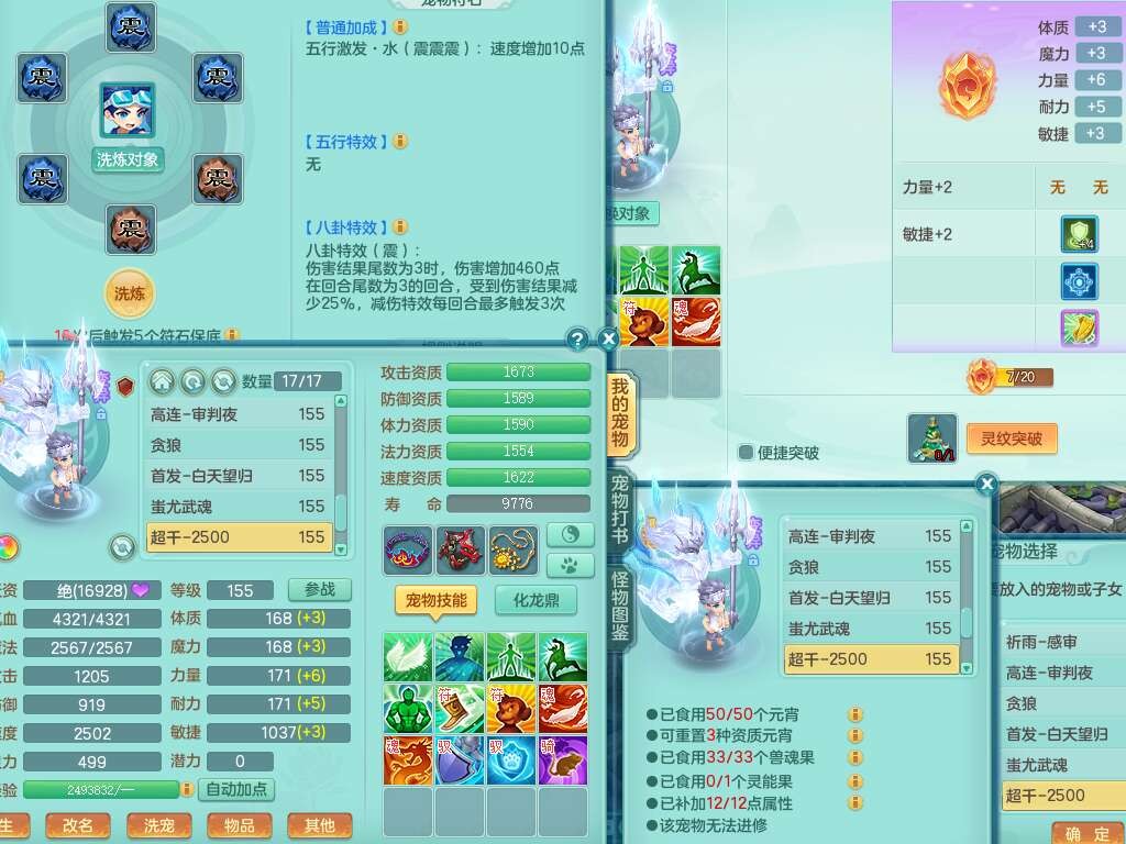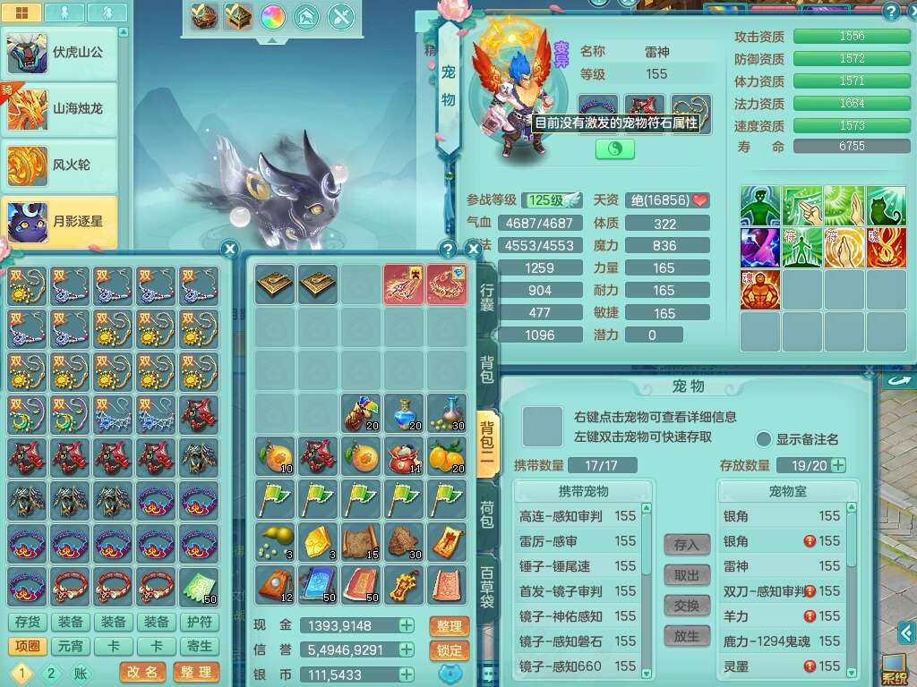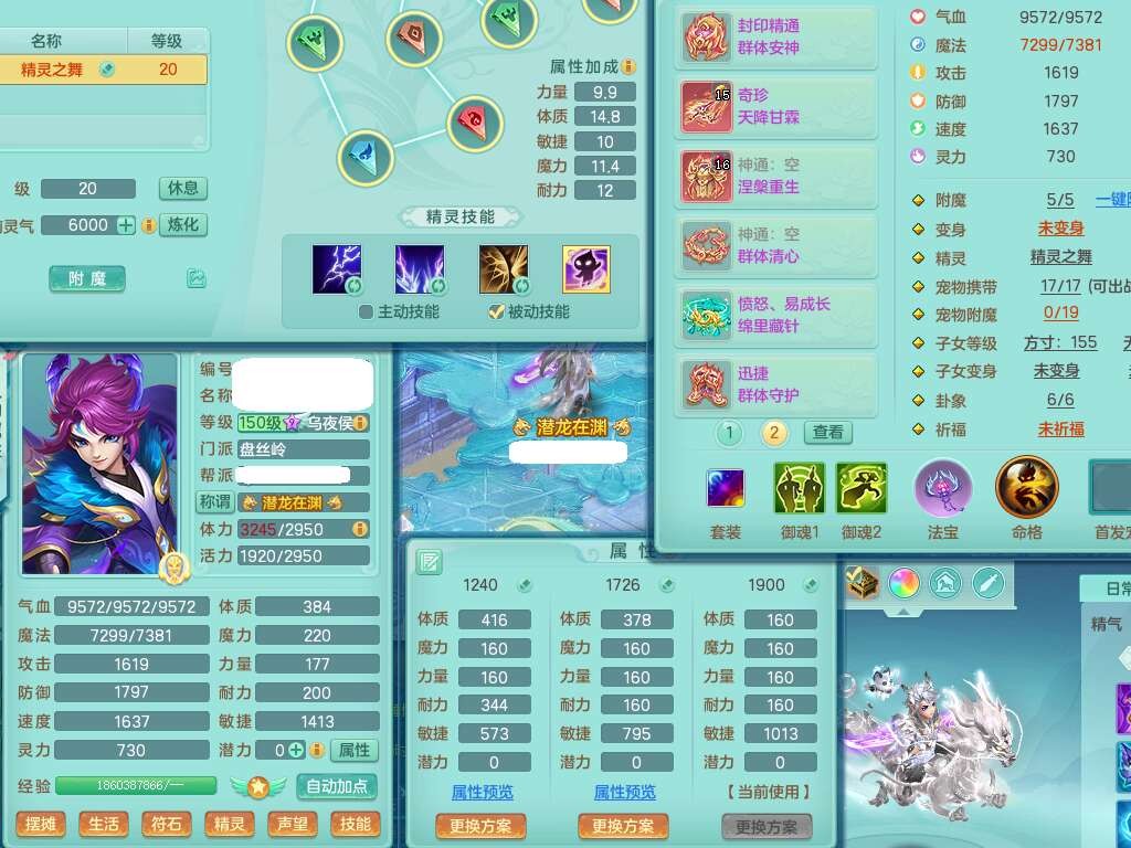 A22285风驰电掣159男盘丝,精灵舞,2龙1内胆神,1神兽+56个神兽内丹碎片,【9觉醒,已潜龙】,4位靓号,6宠皮,3特殊(羽袭,祈雨,号角),5只六技能镜花灵,1只六技能龙姬,双红封印精通群体安神头,双红奇珍四海单加50武器,三红愤怒易成长笑里单加腰带,迅捷群体守护单加鞋子,六特,法系装备有法暴单加53武器,265易成长单加51链子,法缭衣服,物理装备有,921易成长单加54武器,崩山衣服,易成长单价57头,神佑神佑坚毅项链都有,5.0基础鼎+70攻+280血,15个永久格子,7个纯六字,23只满果子,宠排在榜,经验在榜,双人坐骑,冰晶庭院,有70天月卡。