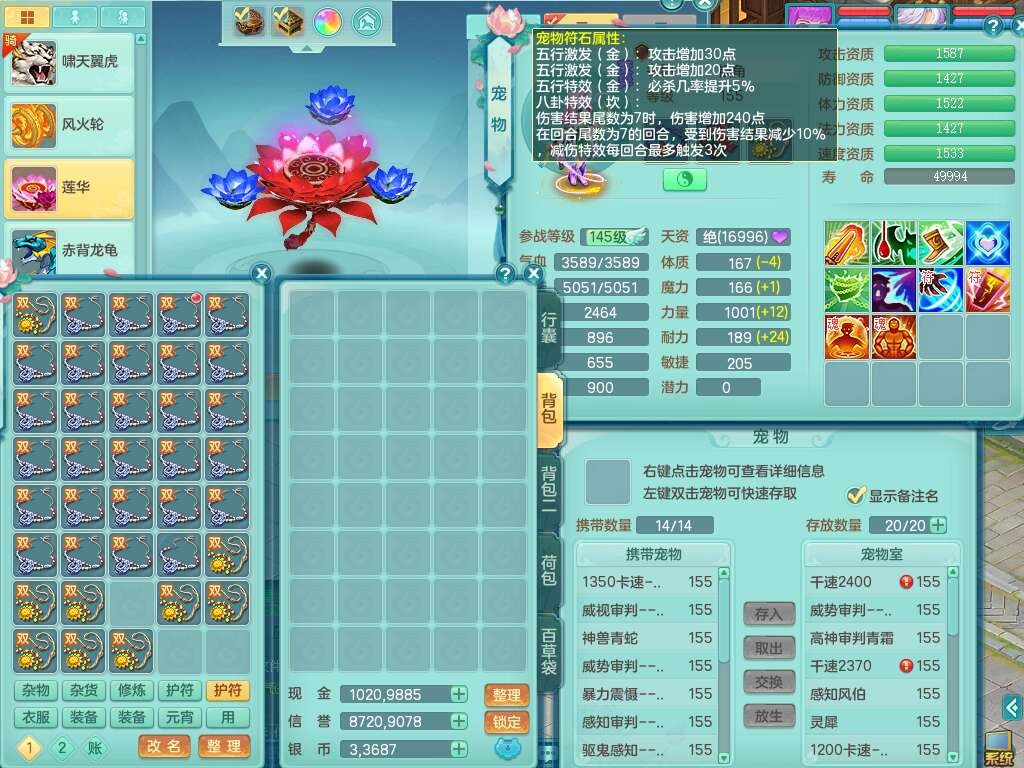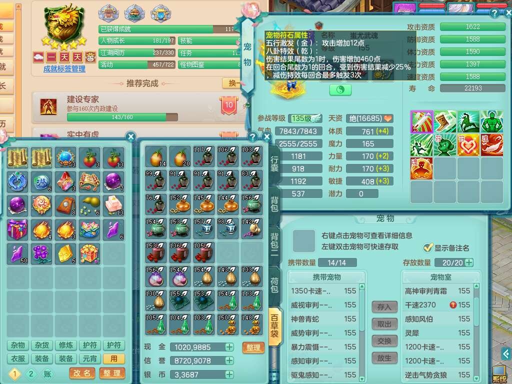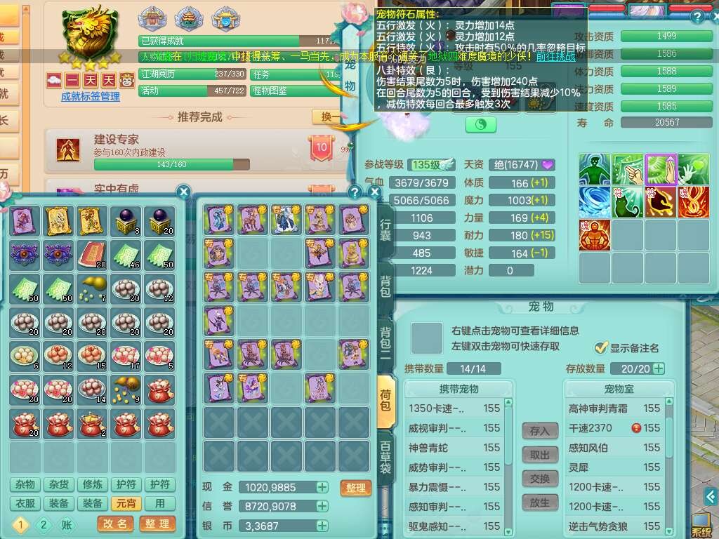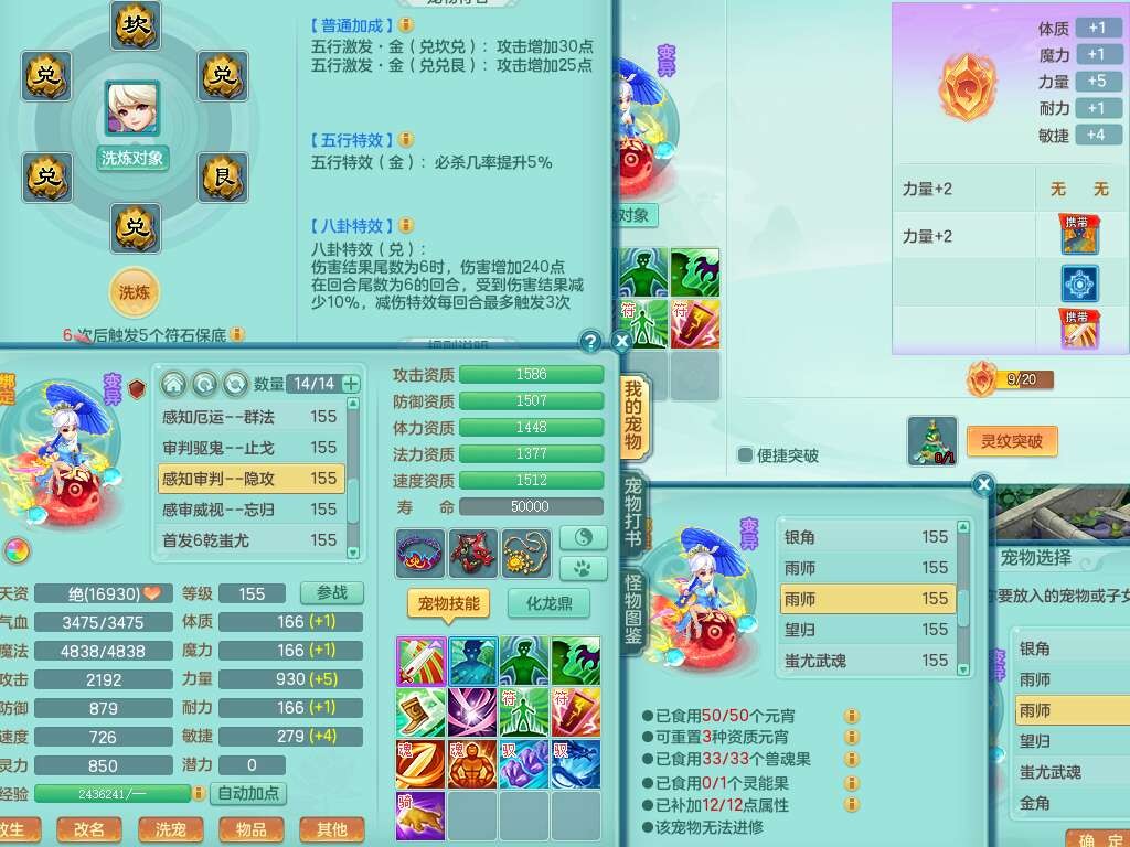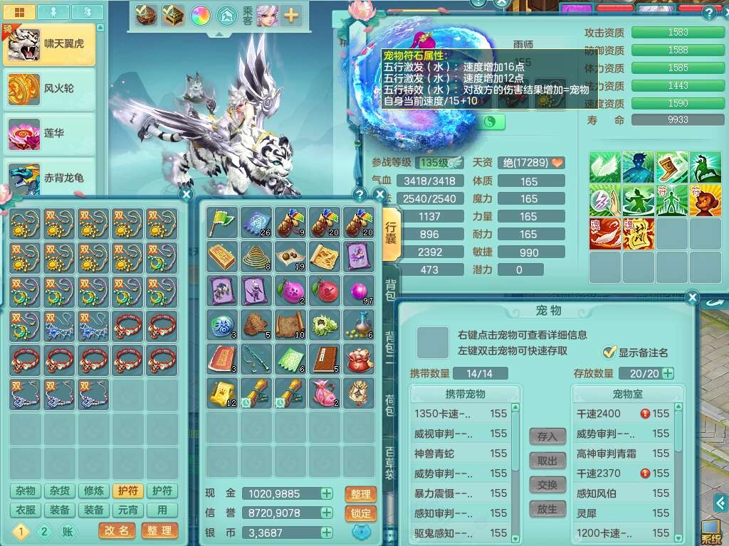 K22281紫气东来159男万兽,精灵歌,2龙(1龙没内),2内胆神,1神兽龙马+56个神兽内丹碎片,8觉醒,4特殊(雷光,以战,影袭,夺命),2只六技能镜花灵,易成长罗汉单加55头,924必杀单加武器,崩山衣服,神佑链子,易成长单加腰带,易成长回天术单加54鞋子,法系装备有双法缭,法缭衣服,法缭单加鞋子,270易成长单加53链子,五雷腰带,5.0基础鼎,2个纯六字,2个五字,11只满果子,宠排在榜,成就在榜,双人老虎。