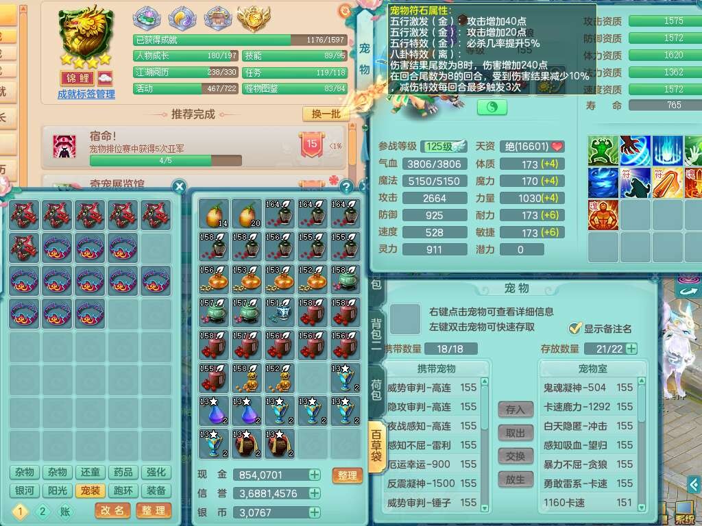 a22279少年游159男普陀,精灵舞,7龙(1龙无内),3内胆神(2马),1破镜,【11只觉醒,已潜龙】,5位靓号不含4,9宠皮,2特殊(墨守,流星),5只六技能镜花灵,2只六技能龙姬,愤怒野兽单加53腰带,回春罗汉武器,六特,15个永久格子,5.5基础鼎+70攻+280血,9个纯六字,2个五字,22只满果子,宠排在榜,成就在榜,5只坐骑,神驹红红火火+火焰之力,带103天月卡。
