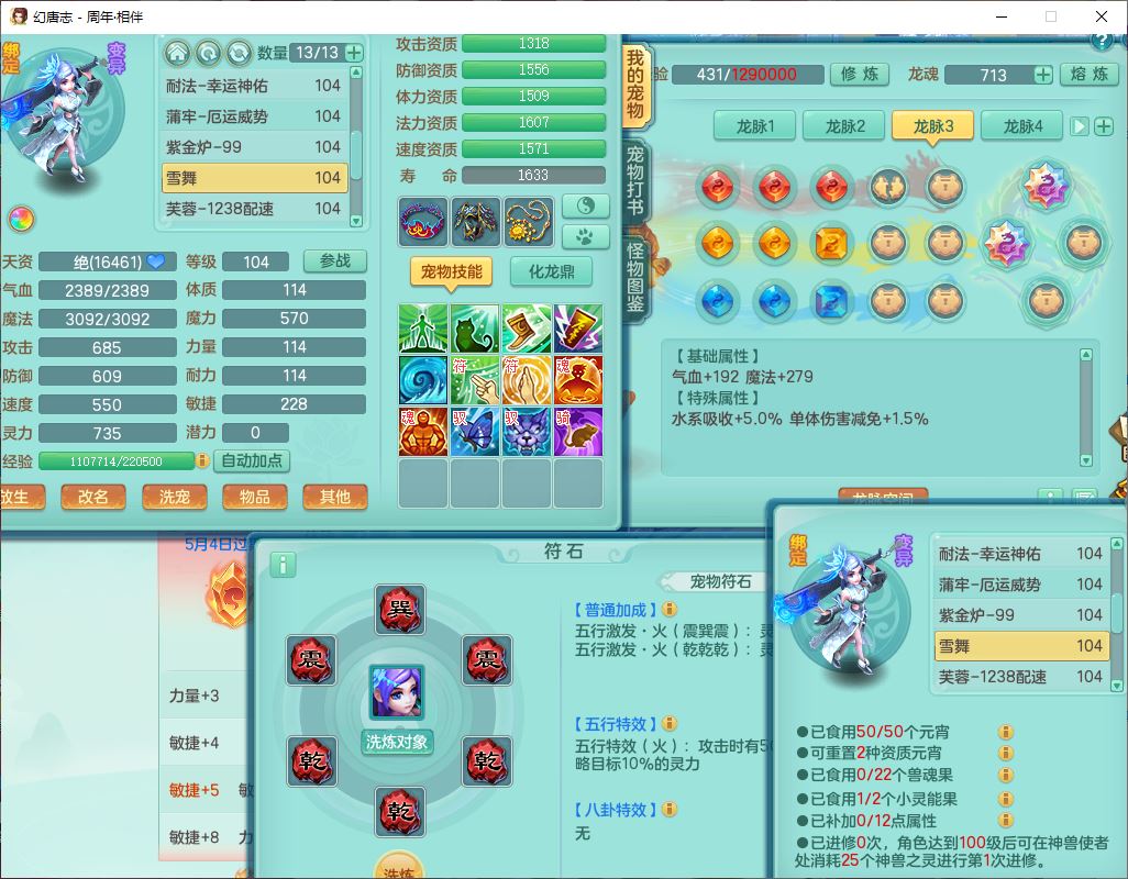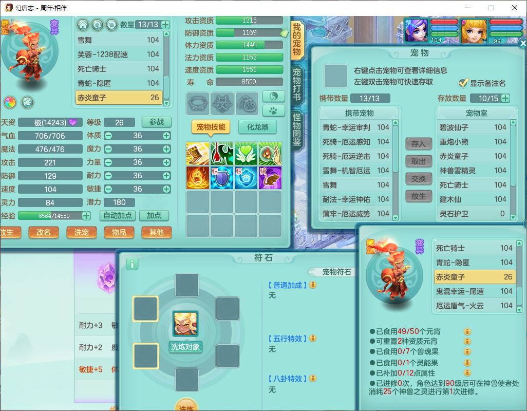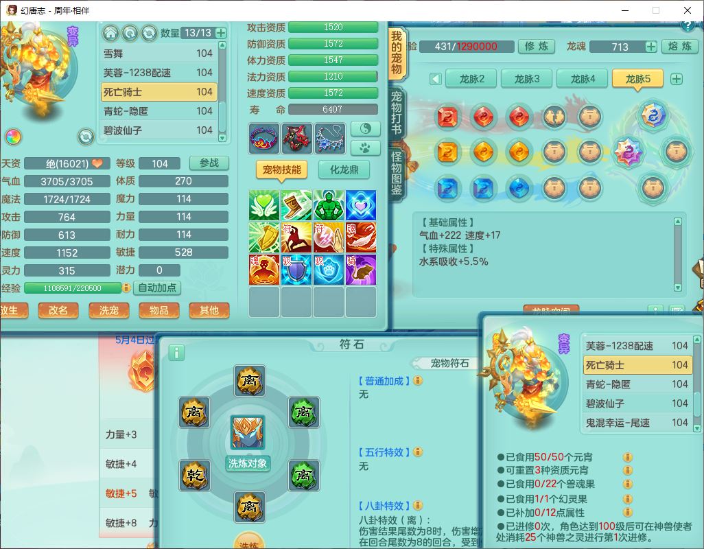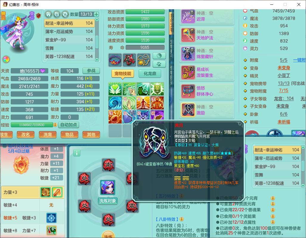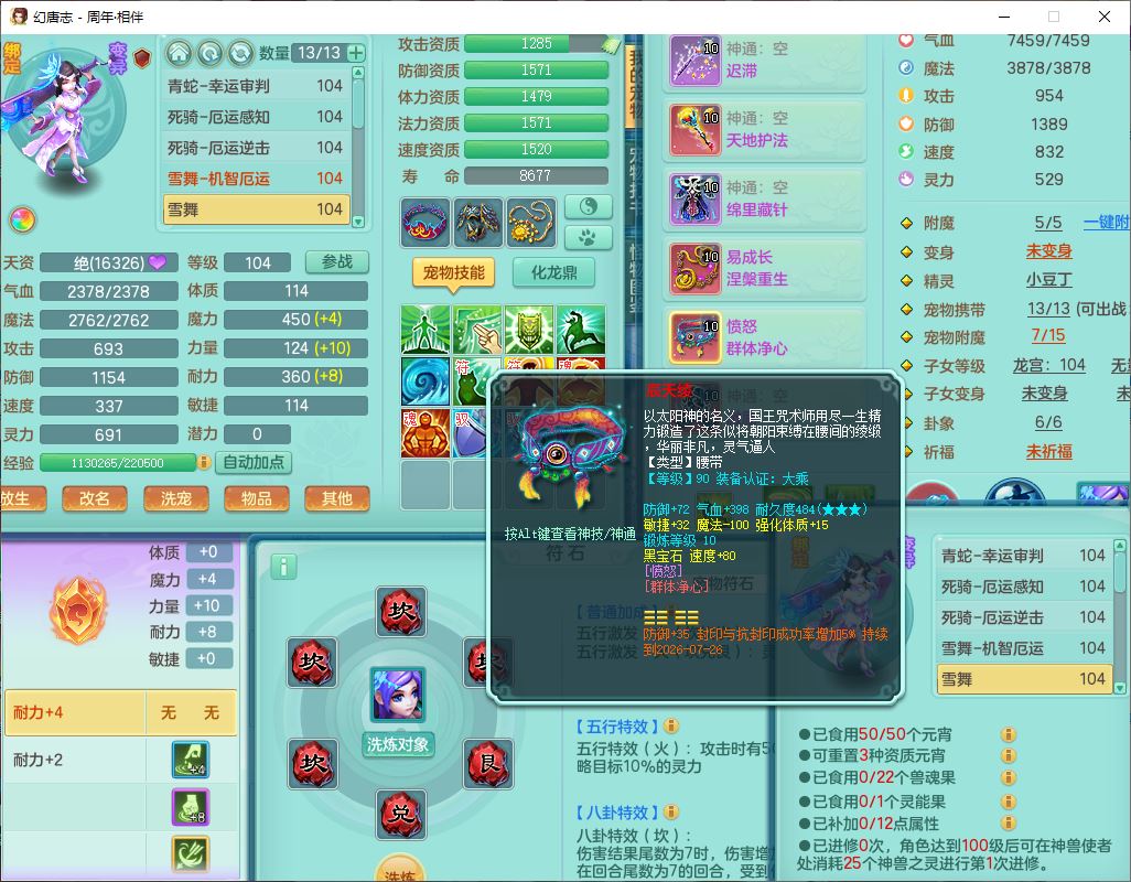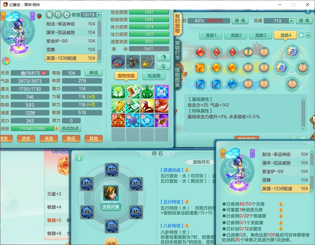 52695周年相伴99女普陀体敏精灵,1内(带蛇影)1青蛇(无内)4翻江2舍身1金炉1童子,4觉醒3宠皮2五字8四字7只满果子,8红装备,Y慈航项链,愤怒晶清腰带,鼎2.0,27天月卡,冰晶庭院153,永久头饰、精灵皮肤,57个内丹碎片,1双人飞行坐骑