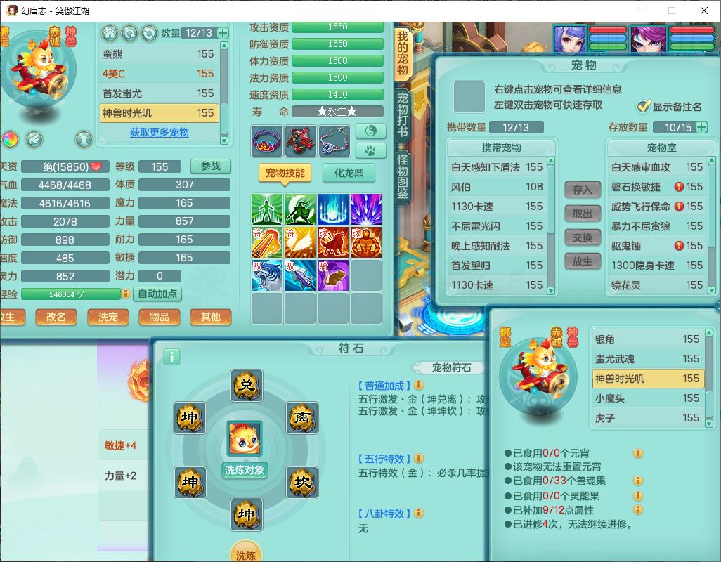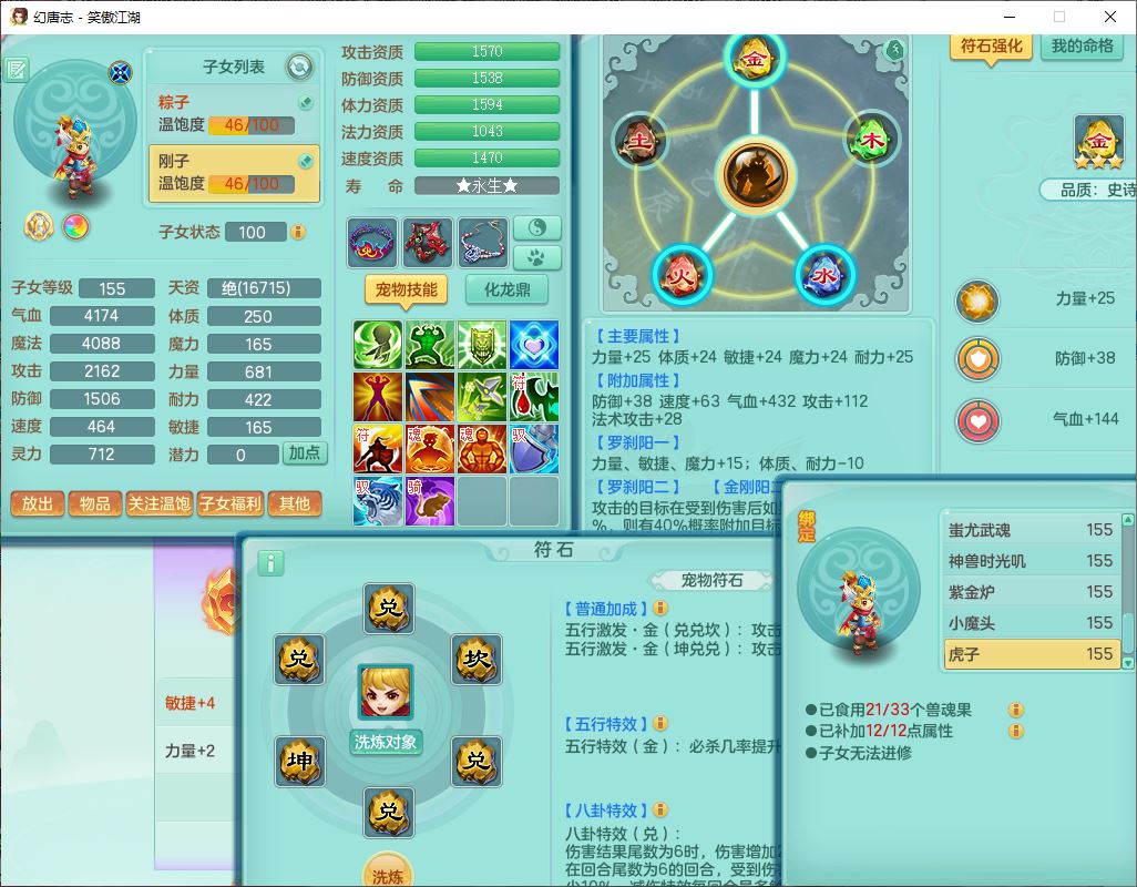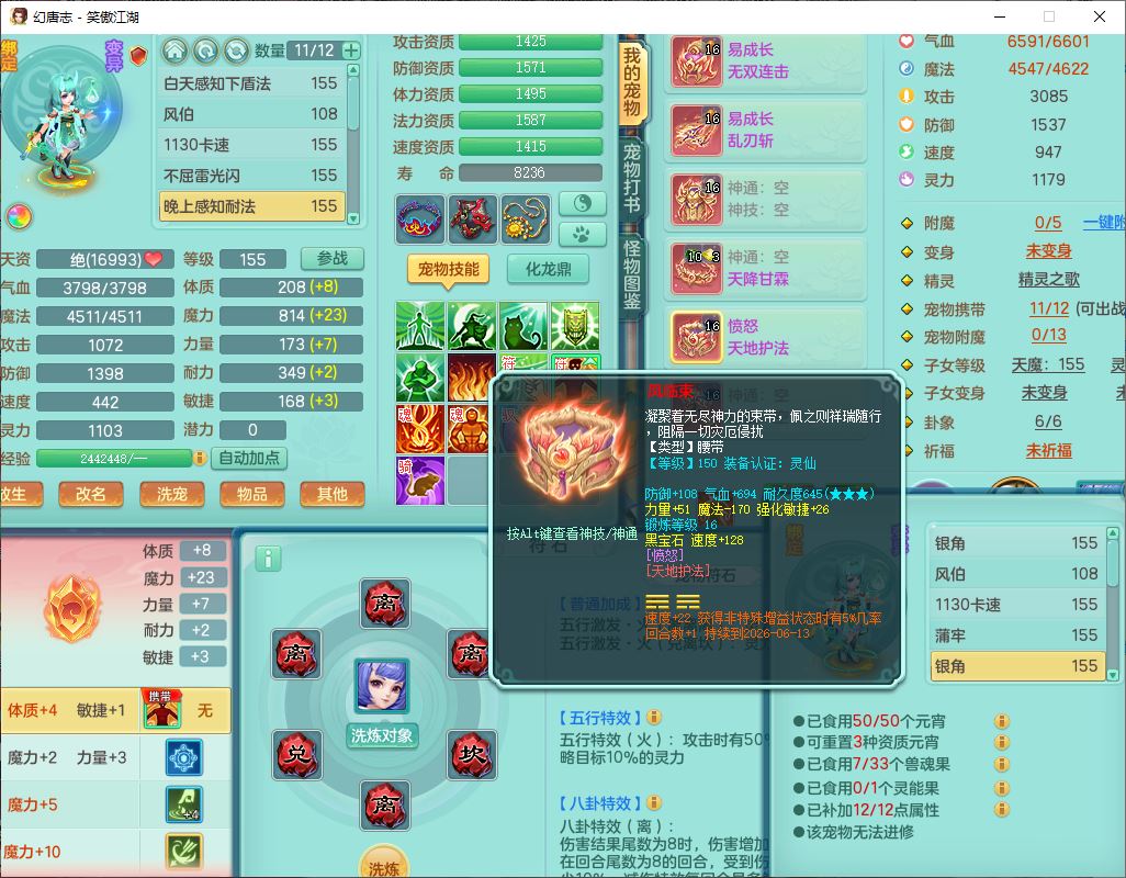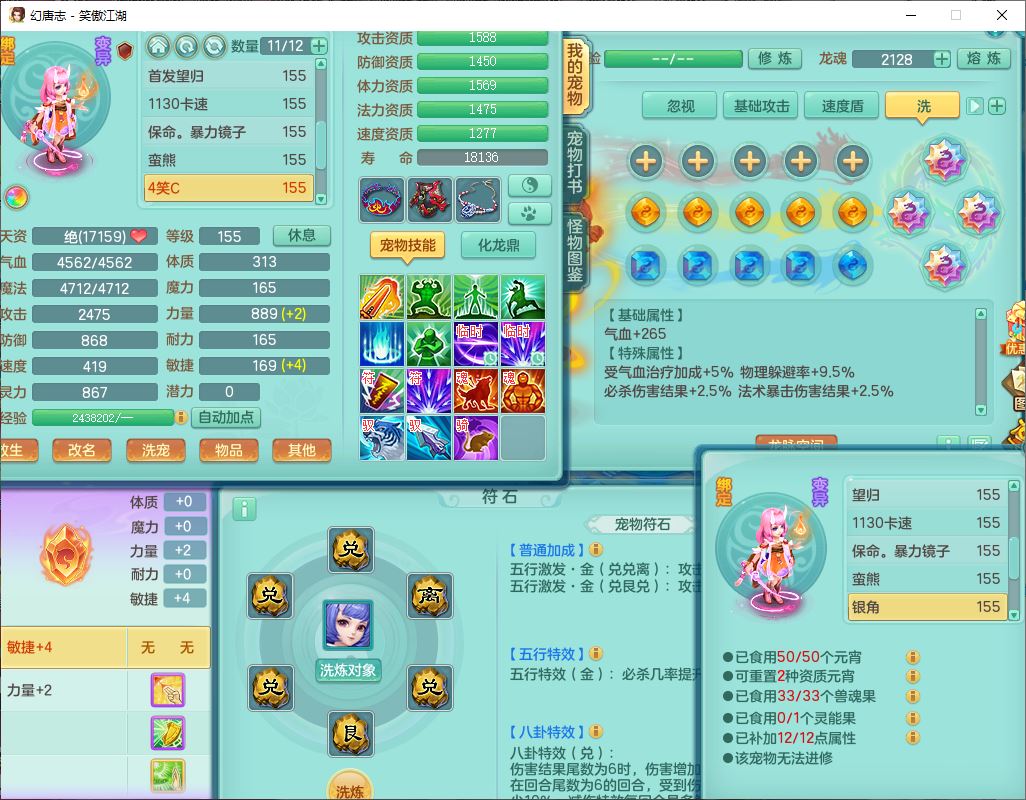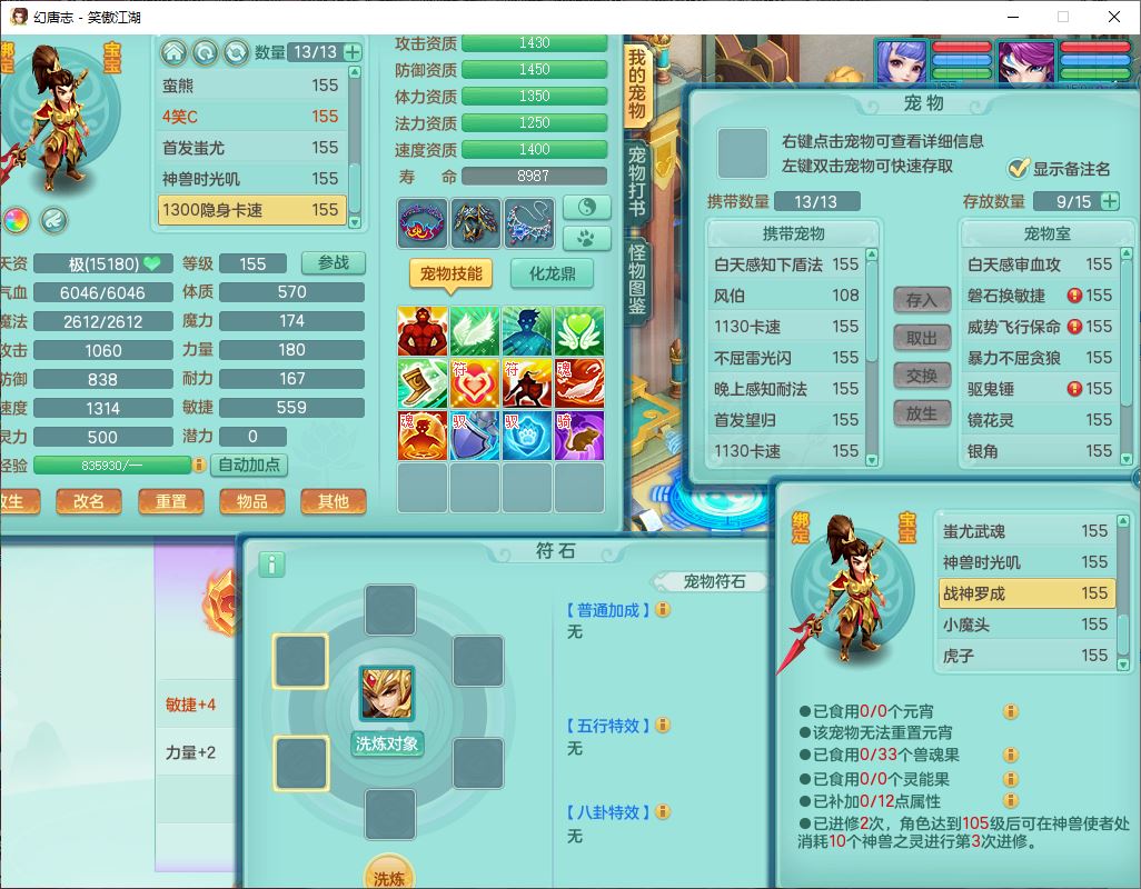 4374笑傲江湖159夫妻号,男万兽精灵歌,1神兽(无内)1望归1镜花,3觉醒,全单加7红装备,Y破血帽子,Y乱刃武器,愤怒罗汉腰带,鼎5.5,46个内丹碎片,带女方寸精灵舞,1神兽(无内)1望归2镜花1龙姬4特殊(夺命,兽决雷光、焚心、羽袭),1觉醒,9红装备,强壮慈航衣服,Y笑里项链,愤怒Y腰带,有法系装备,274Y慈航项链,法缭衣服、鞋子,41个内丹碎片