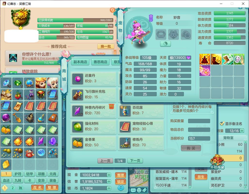 24327笑傲江湖109男方寸精灵舞,1内(带蛇影)1翻江1建木1羽袭,5觉醒,11红装备,Y晶清帽子,Y四海衣服,坚毅笑里项链,愤怒慈航腰带,Y明镜鞋子,一套法系装备,单加Y衣服,Y烽火帽子,180Y项链,法缭以战鞋子,仓库多装备,封锁群体安神武器,鼎1.5,法爆5.0,人物主符石满足潜龙要求11个仙兽灵,1单人飞行坐骑