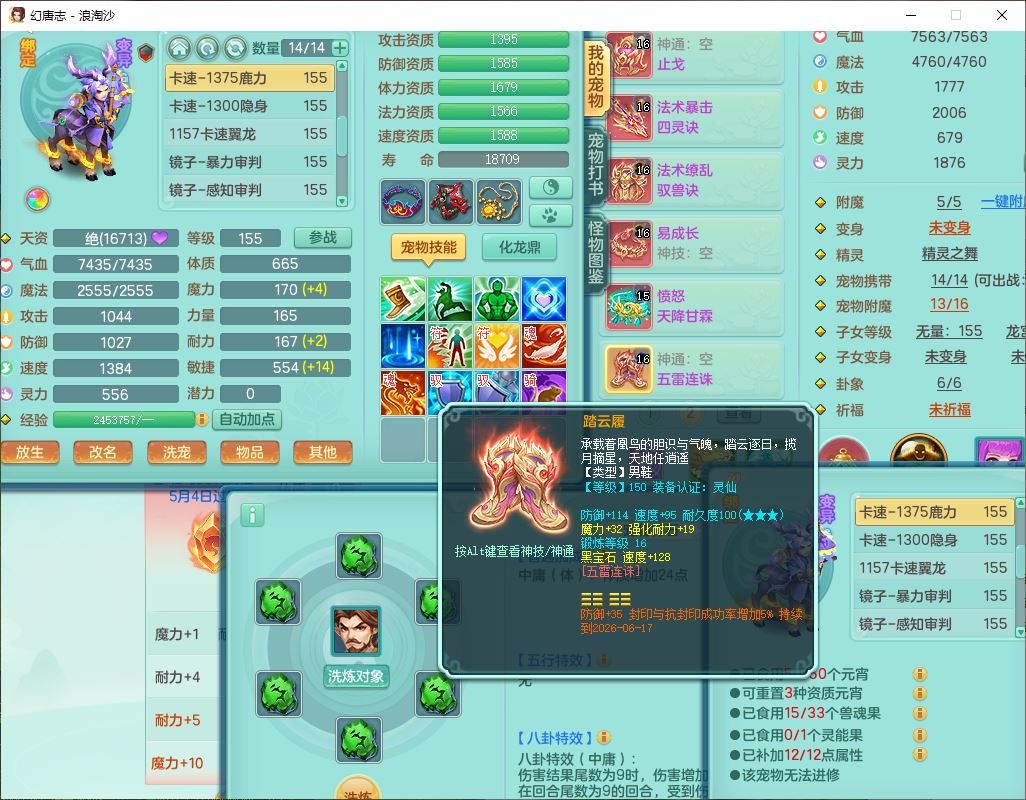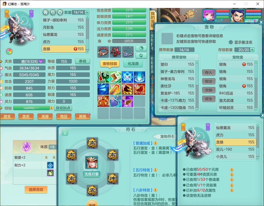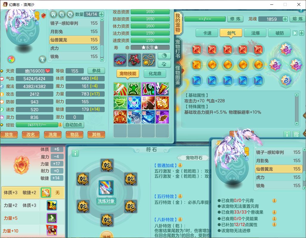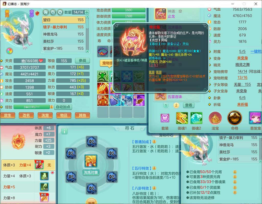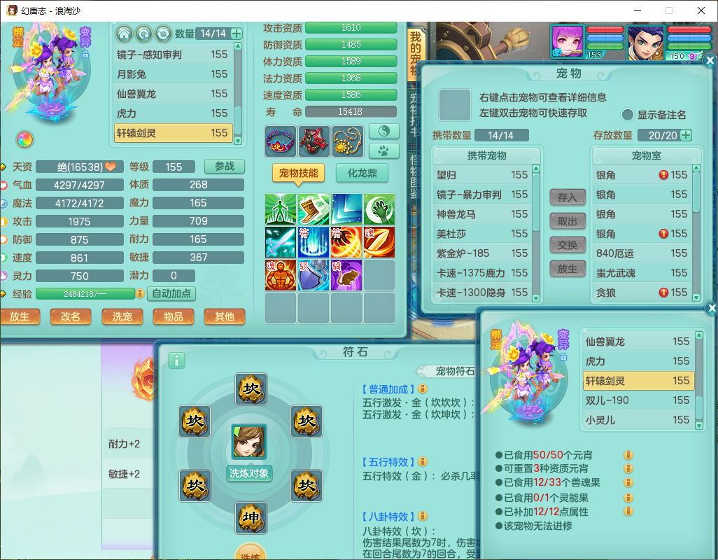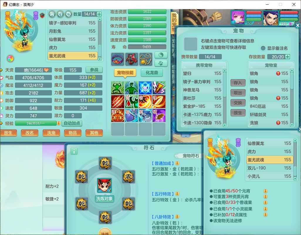 99792浪淘沙159男龙宫【暴龙逍客】精灵舞,2龙(1换)2内(1青蛇1龙马,1破境)1望归4镜花1金炉1特殊兽决(上善),5觉醒3宠皮5六字5五字3四字13只满果子,9红星辰之拥装备,法爆四灵武器,法缭驭兽衣服,愤怒四海腰带,五雷鞋子,有物理装,Y疾速武器,崩山衣服,神佑项链,Y驭兽鞋子,鼎5.5+70,156天月卡,庭院162房屋158,永久外观、精灵皮肤,14个内丹碎片,4双人坐骑(1飞行)