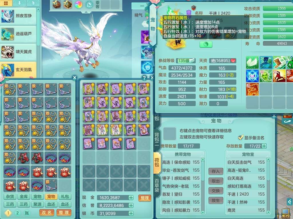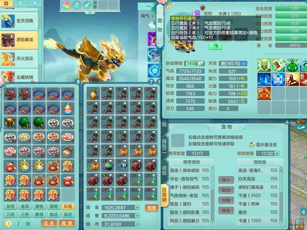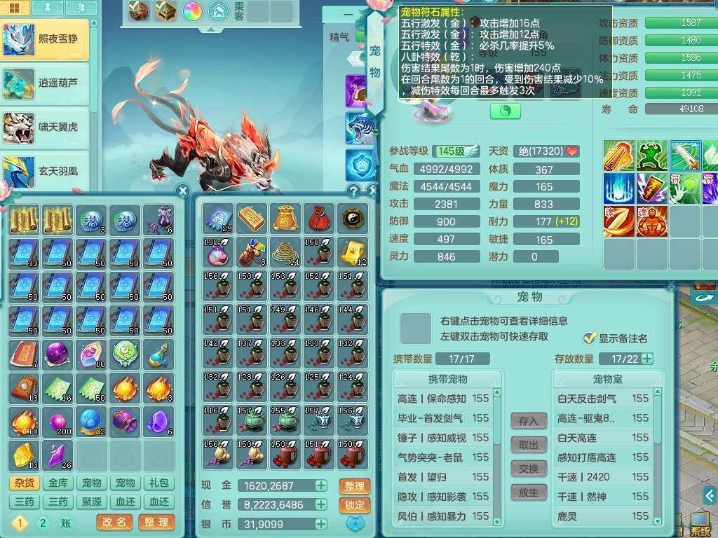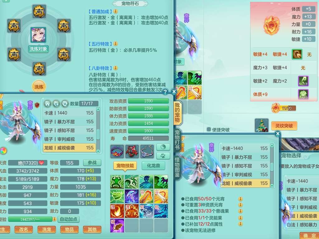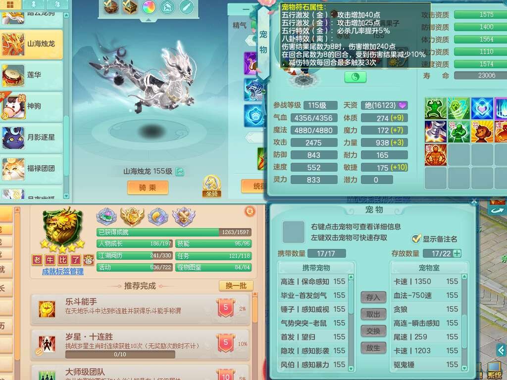 A22316普天同庆159女万兽,精灵舞,2龙2内胆神,1破镜,【11只觉醒,已潜龙】,极品8位靓号ABBBBBBB,10宠皮,5特殊(影袭×2,荒古,飞花,舍身),3只六技能镜花灵,2只六技能龙姬,易成长崩山单加50衣服,愤怒单加53项链,5.5基础鼎+70攻+280血,15个永久格子,14个纯六字,27只满果子,仓库还有122个果子,宠排在榜,经验修炼成就都在榜,永久称谓,16只坐骑,暴龙洪荒+神驹马到成功+西瓜冰,冰晶庭院,带108天月卡。