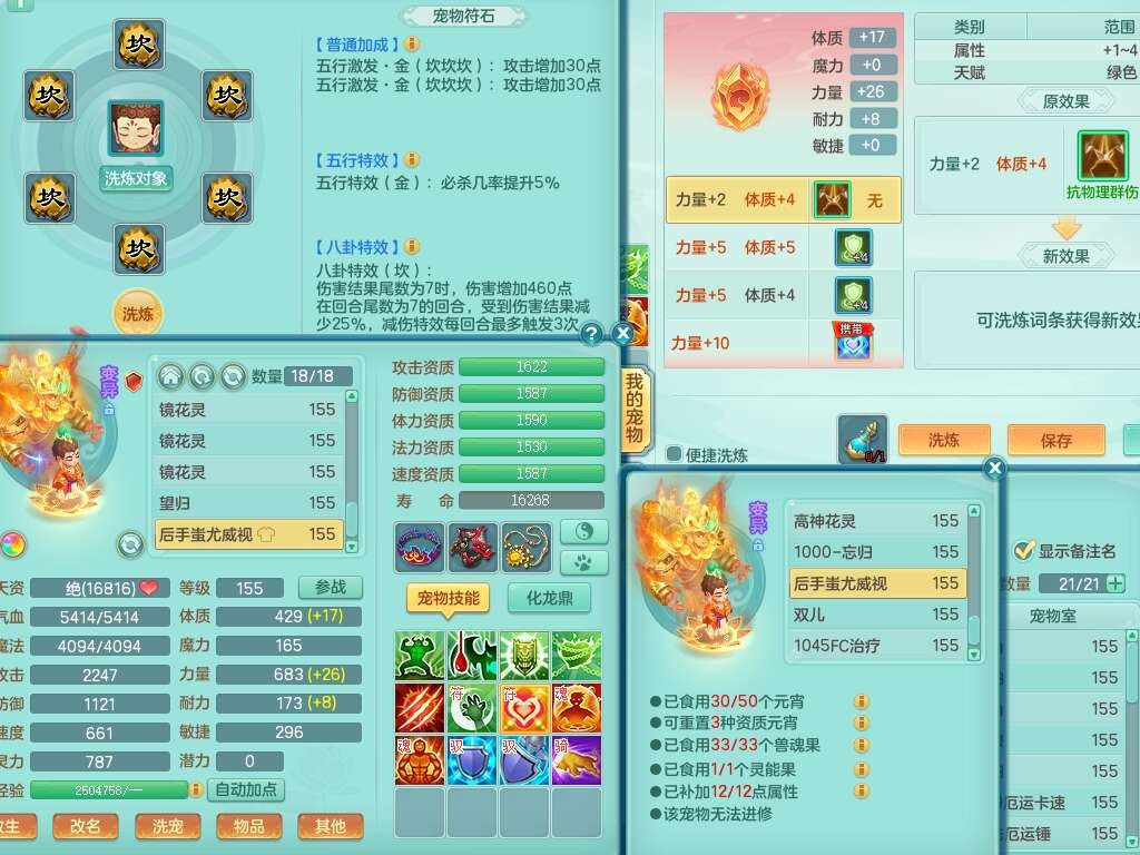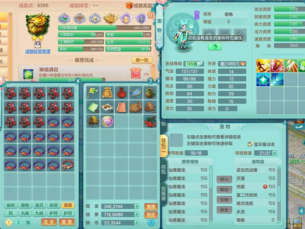 S22317任剑逍遥159男天策,精灵歌,8龙3内胆神(2蛇),1破镜,【25只觉醒,已潜龙】,7宠皮,3特殊(影袭,双星,风卷),3只六技能镜花灵,1只六技能龙姬,934易成长止戈武器,有917必杀单加武器,928易成长单加54武器,928狂暴单加武器,易成长破血单加头,格挡崩山衣服,神佑易成长单加50链子,愤怒易单成长加56腰带,迅捷四海单加53鞋子,6.0基础鼎+70攻+280血,15个永久格子,20个纯六字,26只满果子,宠排在榜,仓库43神兽内胆碎片,双人老虎。