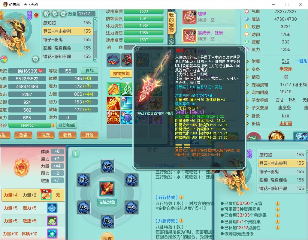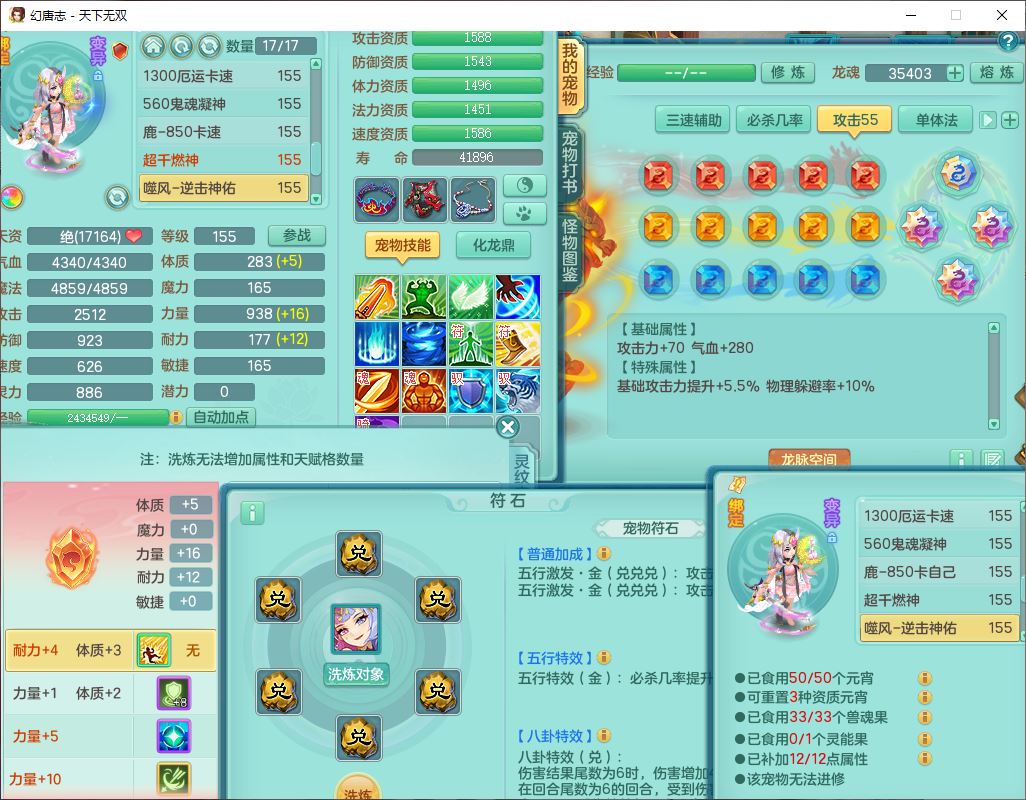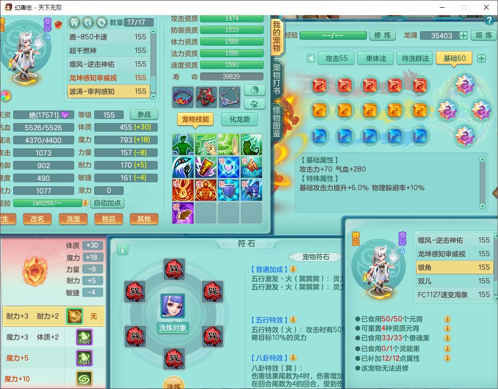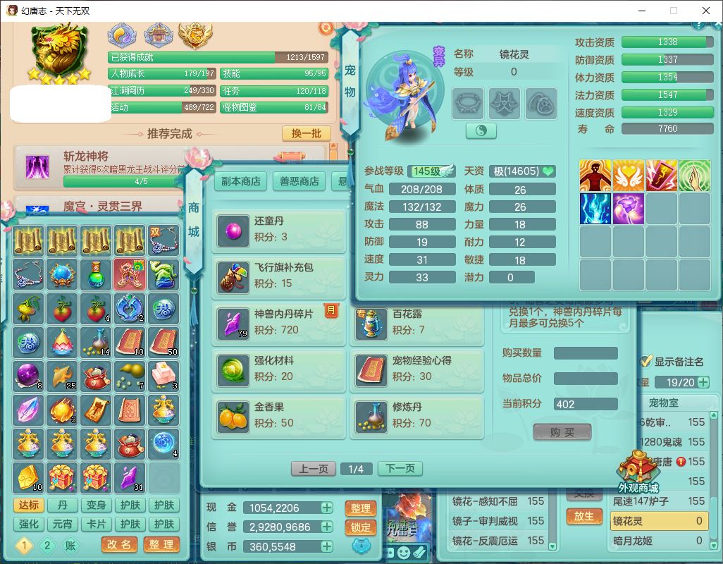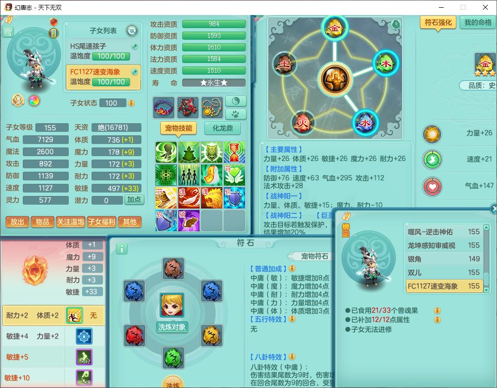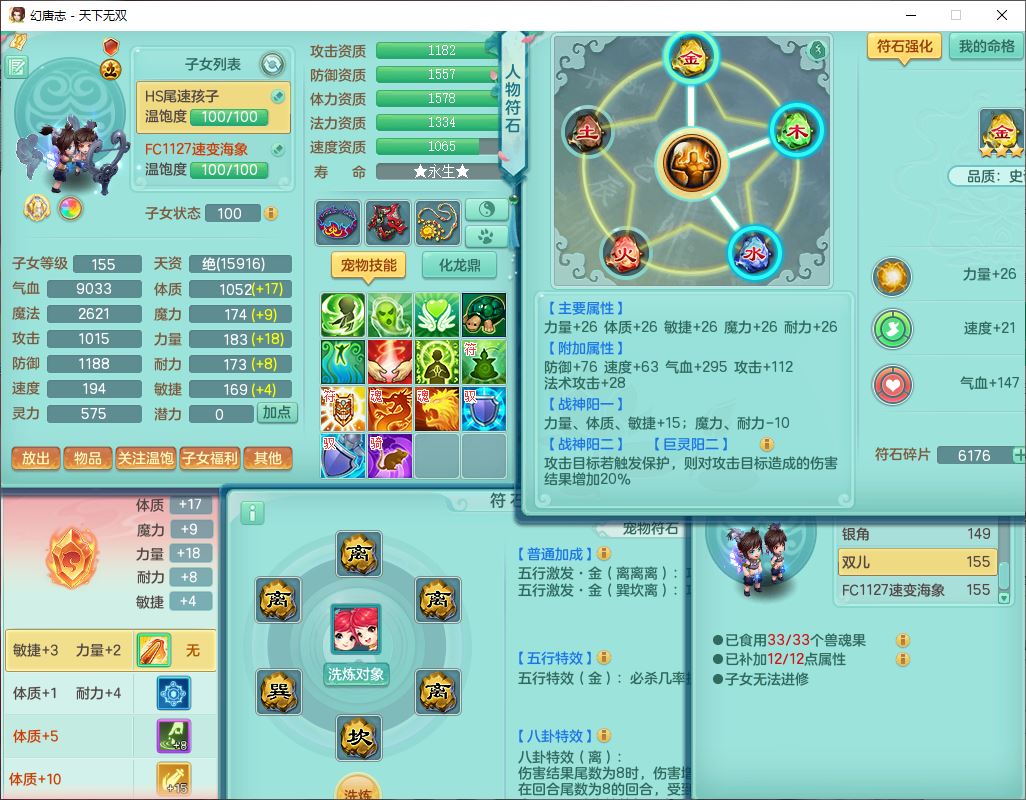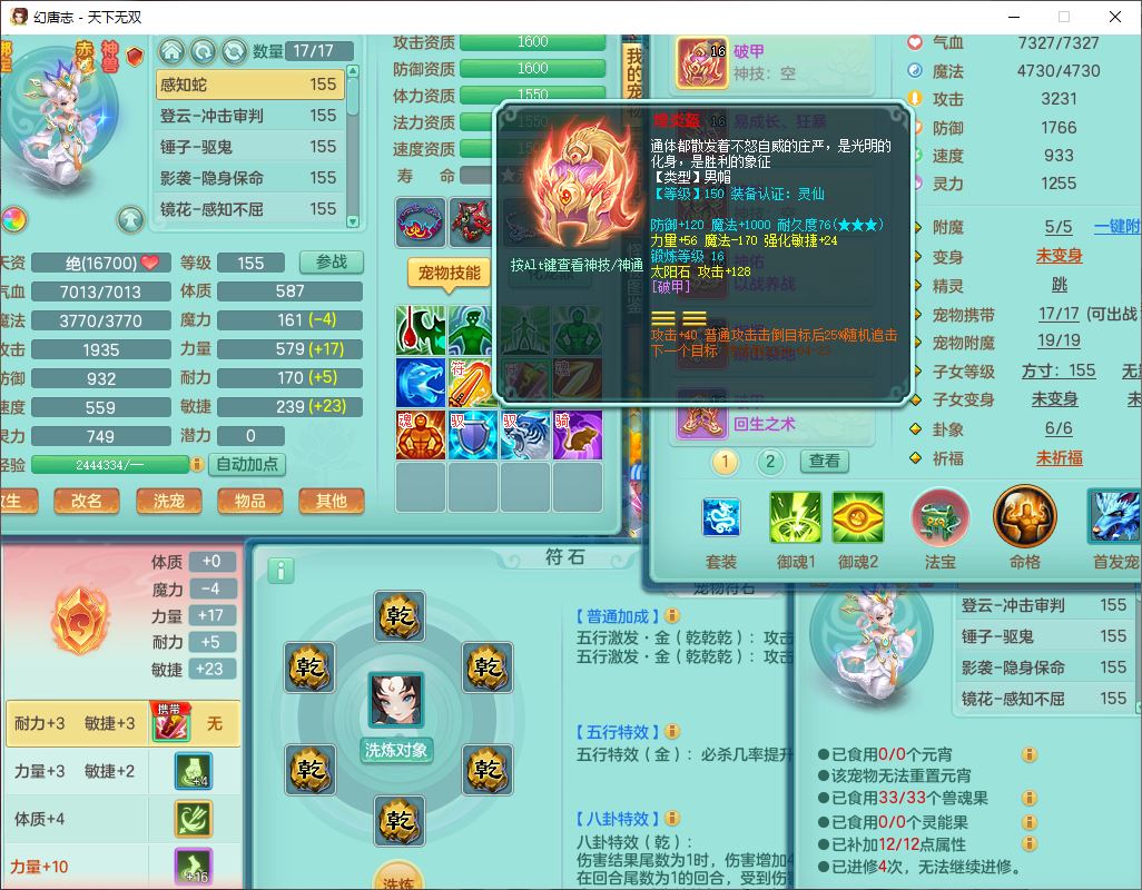 24321天下无双159男天宫【潜龙号+暴龙洪荒+西瓜冰】精灵歌,1龙(换,无内)1内丹青蛇8特殊(破碎、影袭、号角、噬风,兽决飞花、以战、双星、怒破)5镜花灵1龙姬1金炉,21觉醒4宠皮17六字3四字综合21只满果子,17格子,10红双破甲星辰之拥装备,,单加Y狂暴武器,破甲帽子,格挡衣服,神佑以战项链,指挥崩山腰带,破甲回生鞋子,一套法系装备,Y击退武器,法缭衣服,五雷帽子,法缭鞋,鼎6.0+70+280,房屋166,永久外观精灵皮肤,31内丹碎片,360w神武币,宠排在榜,7只双人坐骑