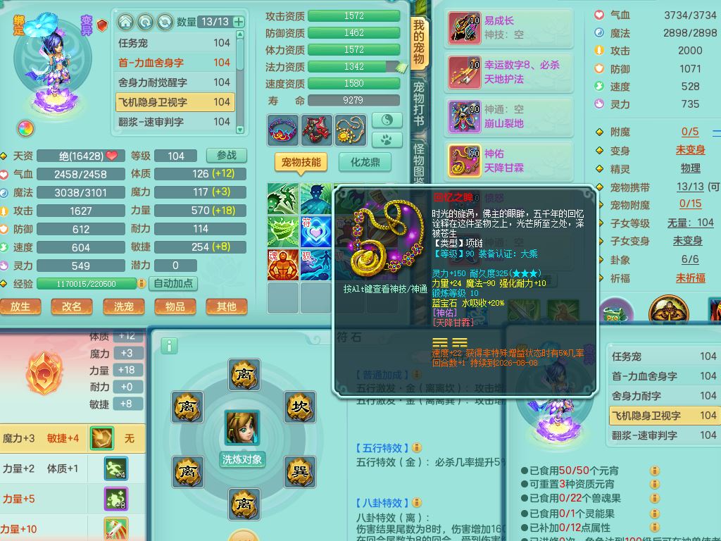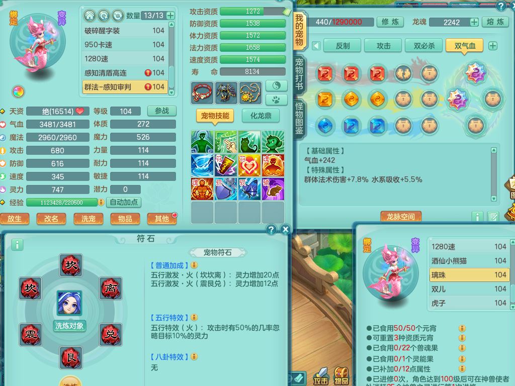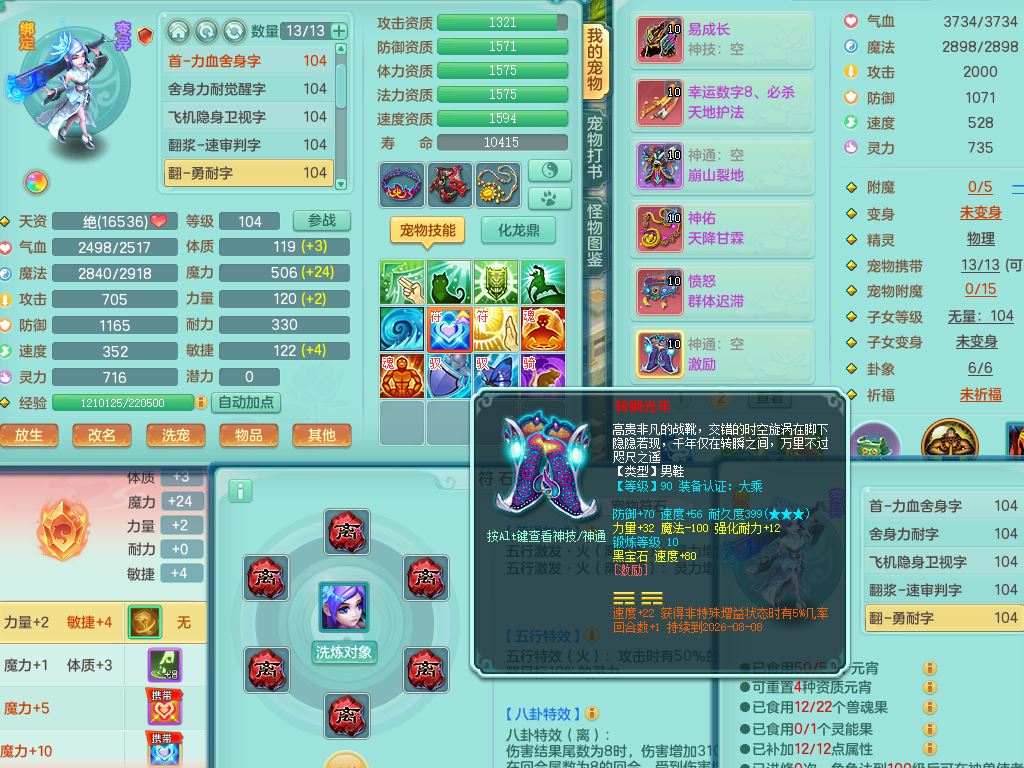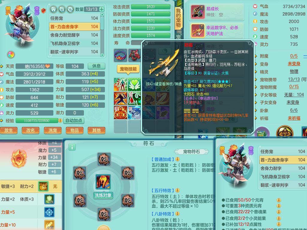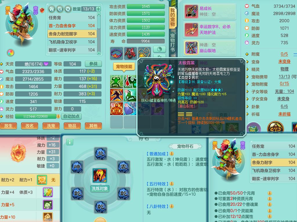 tx10423天下无双99男天策3系精灵,1内丹神1青蛇无内,7只满果子8觉醒2个纯6字,全身单加10红,537幸运必杀罗汉武器,崩山衣服,神佑四海项链,愤怒双红腰带,鼎2.5+42,精灵皮肤,双人坐骑