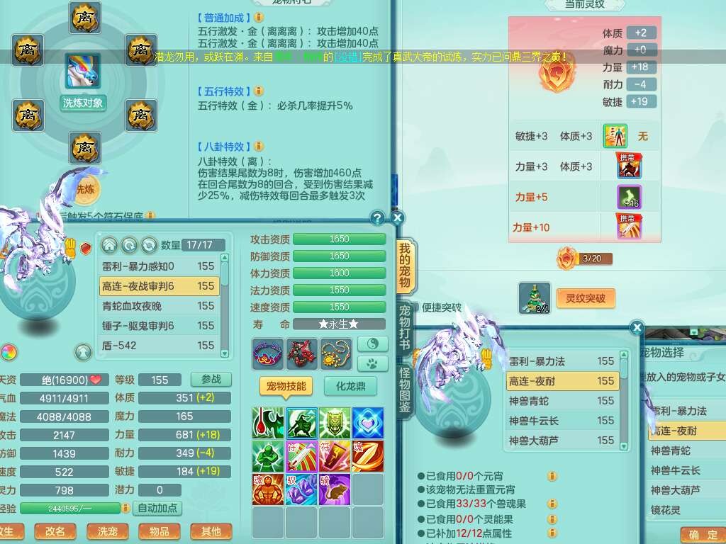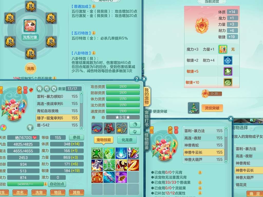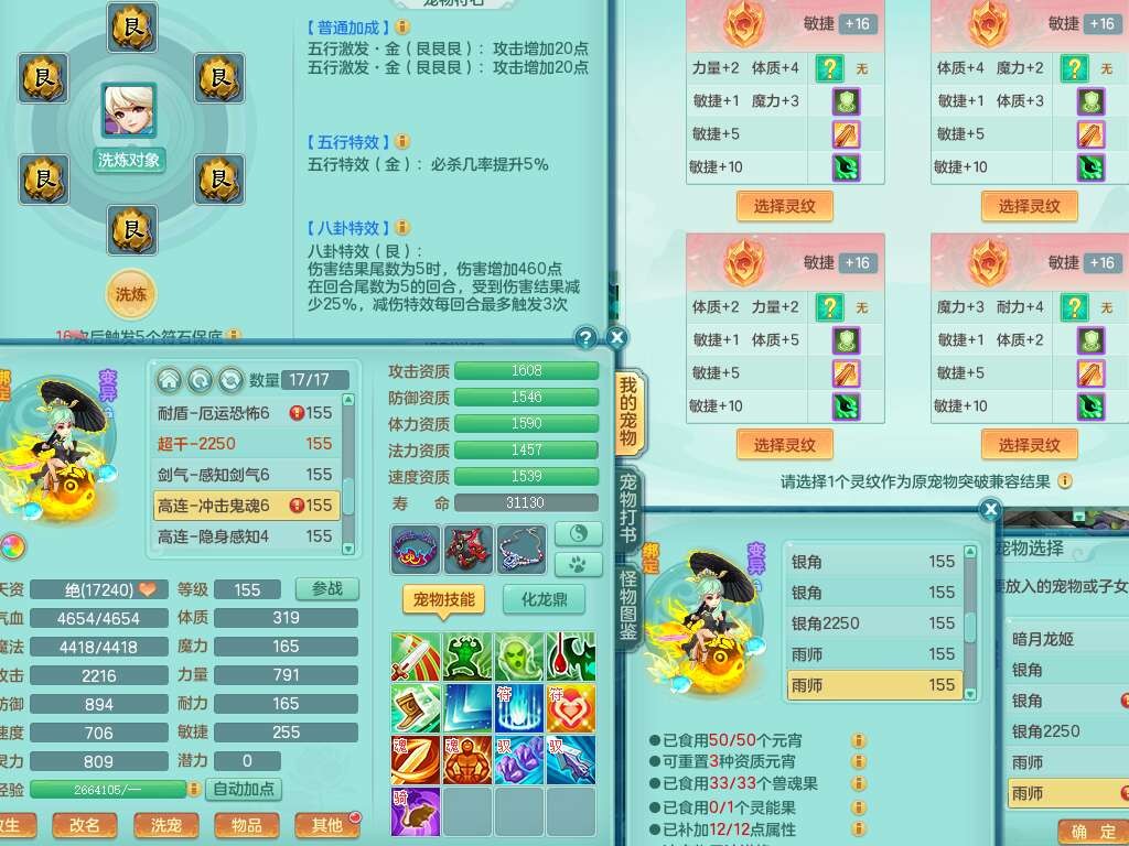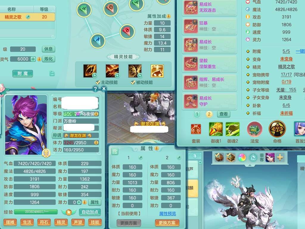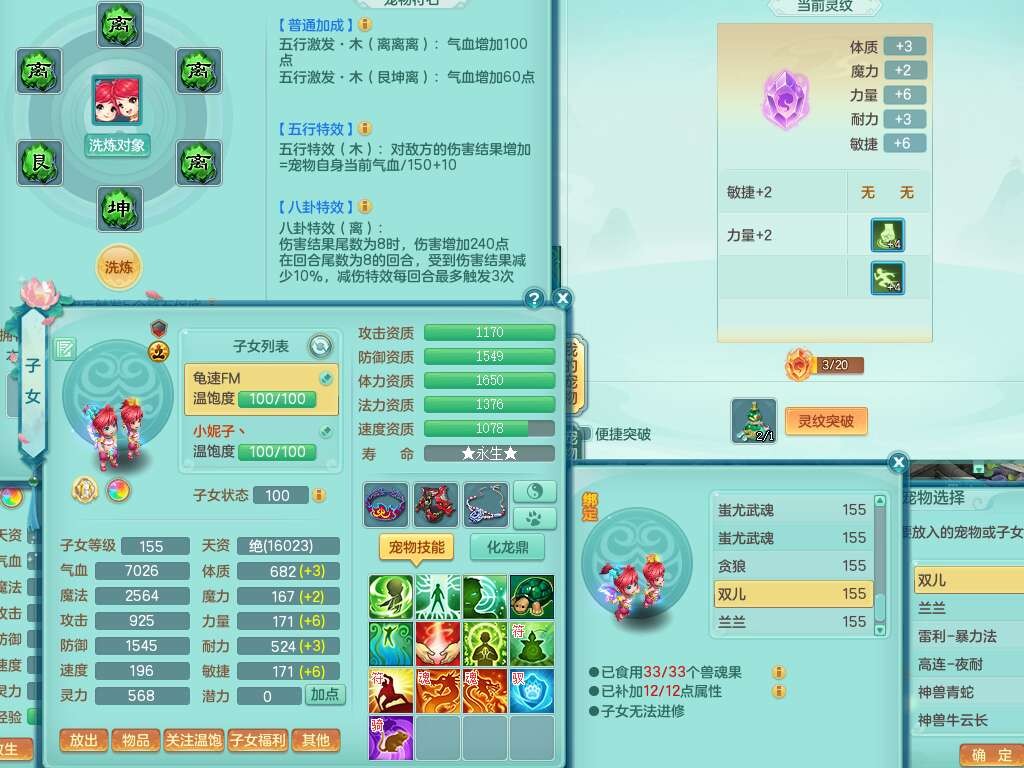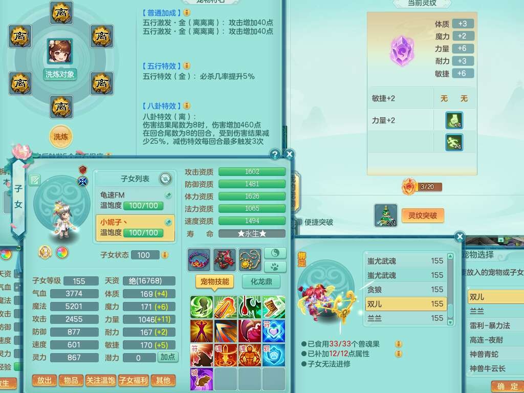 j22333今年勇159男万兽,精灵歌,2龙2内胆神(1蛇),2神兽+46个神兽内丹碎片,【7觉醒,已潜龙】,4宠皮,3特殊(锤子,上善,善恶),2只六技能镜花灵,2只六技能龙姬,易成长破血单加52头,913狂暴单加51武器,易成长单加55衣服,坚毅慈航链子,指挥易成长腰带,易成长守护鞋子,可玩愤怒六特,5.5基础鼎+70攻,280血,15个永久格子,12个纯六字,2个五字, 22只满果子,宠排在榜,经验在榜,2只双人坐骑,带174w神武币,63天月卡。带三个150奶粉。