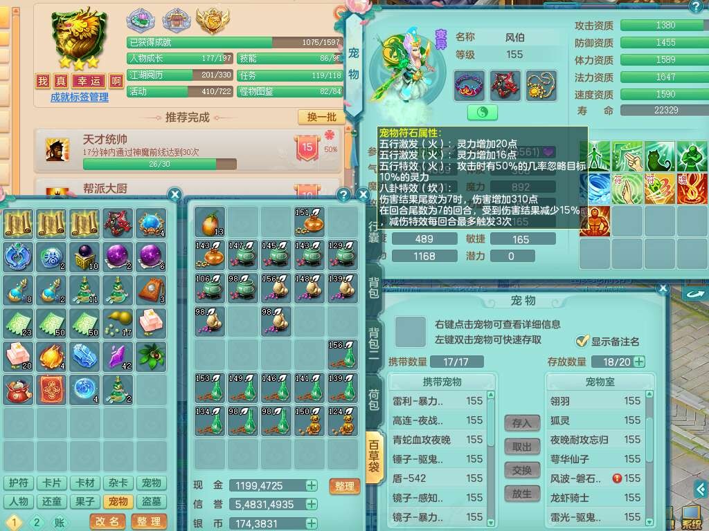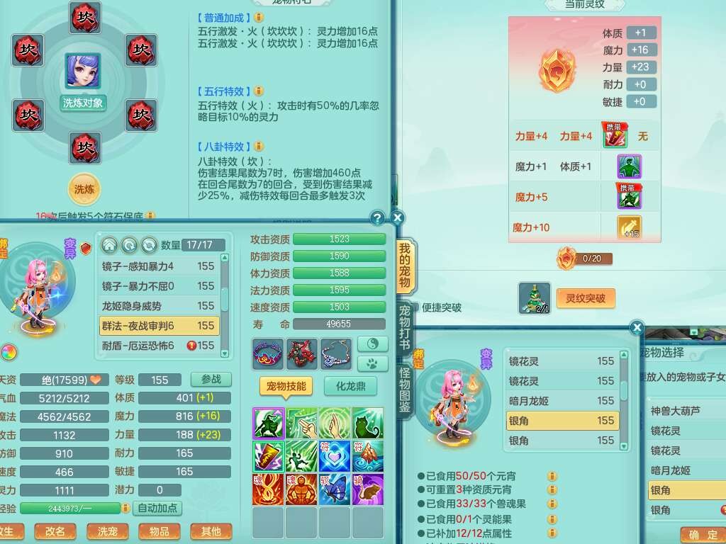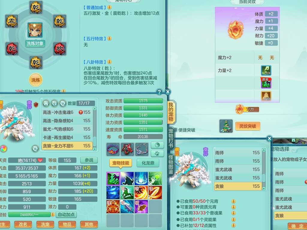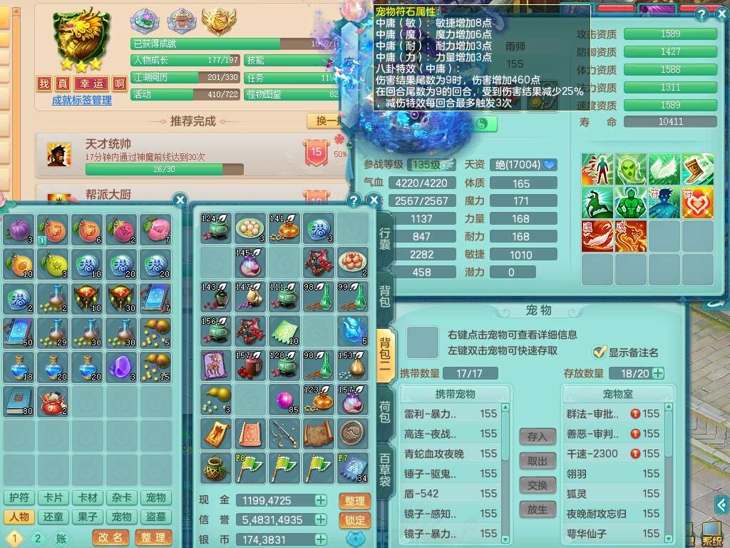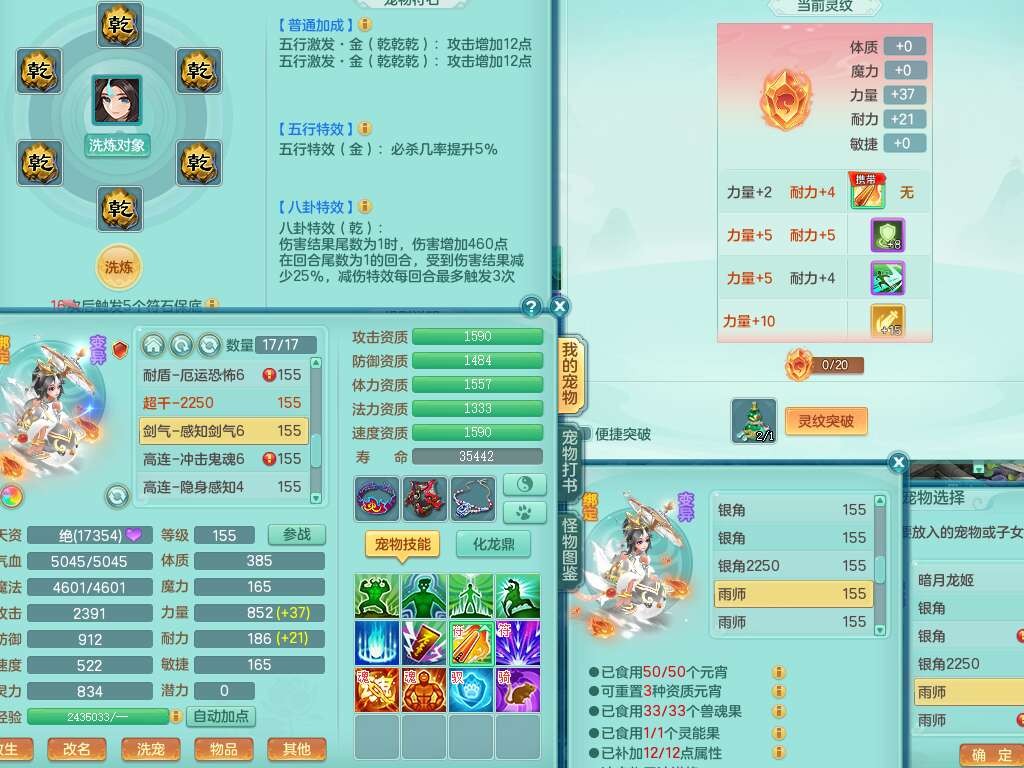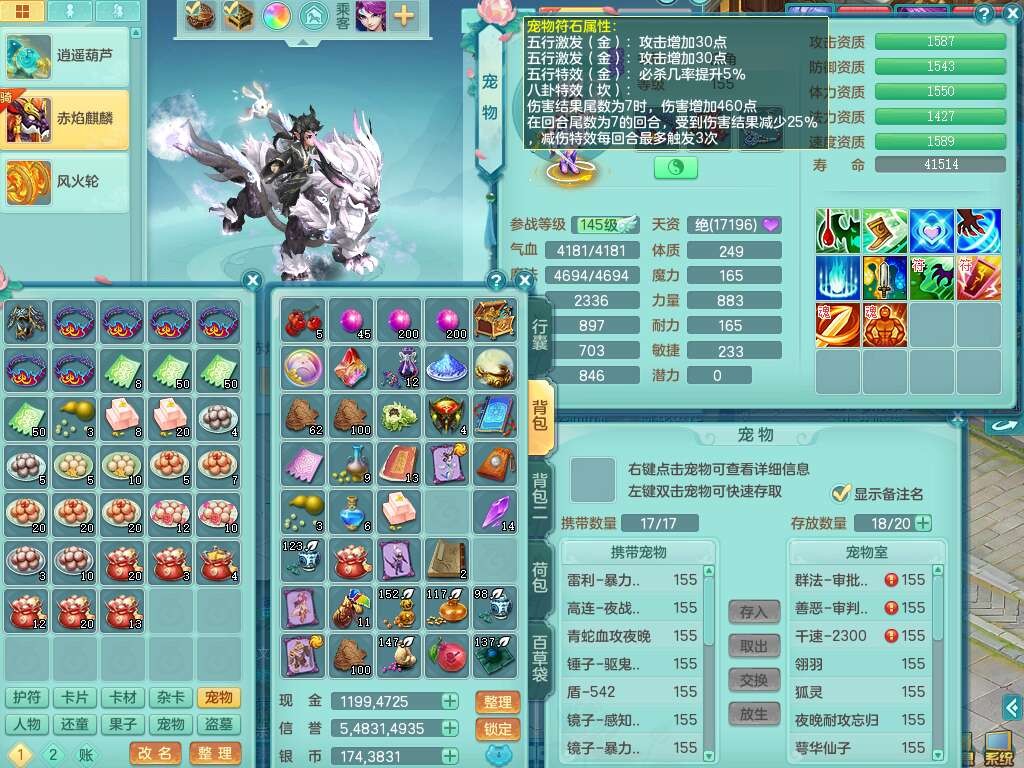 j22333今年勇159男万兽,精灵歌,2龙2内胆神(1蛇),2神兽+46个神兽内丹碎片,【7觉醒,已潜龙】,4宠皮,3特殊(锤子,上善,善恶),2只六技能镜花灵,2只六技能龙姬,易成长破血单加52头,913狂暴单加51武器,易成长单加55衣服,坚毅慈航链子,指挥易成长腰带,易成长守护鞋子,可玩愤怒六特,5.5基础鼎+70攻,280血,15个永久格子,12个纯六字,2个五字, 22只满果子,宠排在榜,经验在榜,2只双人坐骑,带174w神武币,63天月卡。带三个150奶粉。
